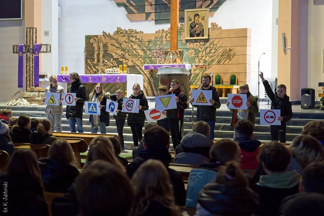 Następnie rozważania rekolekcyjne poprowadził nasz tegoroczny kaznodzieja – ks. dr Krzysztof Rogala pełniący w naszej diecezji posługę roli notariusza kurii oraz sędziego Sądu Kościelnego. W trakcie nauki rekolekcyjnej, mającej charakter interakcji z zebraną młodzieżą, ks. Krzysztof zaczął od definicji Wielkiego Postu – czasu przemijalności. Porównał on życie do drogi na której spotykamy znaki mające doprowadzić nas do jedynego słusznego celu, jakim jest zbawienie. Korzystając z przygotowanych symboli ikonograficznych, ksiądz rekolekcjonista próbował uzyskać od młodzieży znaczenie poszczególnych „znaków”, które niczym dobrze przygotowana mapa pozwalają nam, pomimo codziennych trudności, skutecznie dotrzeć do zamierzonego celu. Niezawodną mapą dla każdego chrześcijanina powinno być Pismo Święte, zaś drogowskazami wytyczne zawarte w dekalogu, którego poszczególne punkty przytaczała młodzież w odpowiedzi na pytania kierowane do niej przez naszego kaznodzieję. Nie mogło również zabraknąć odniesienia do roli modlitwy, która niczym dobry kompas zapewnia nam skuteczny kontakt z Bogiem. Naukę rekolekcyjną dnia I zakończył wspólny śpiew prowadzony przez nasz jedyny w swoim rodzaju chór szkolny pod batutą maestro Tomasza Centkowskiego.