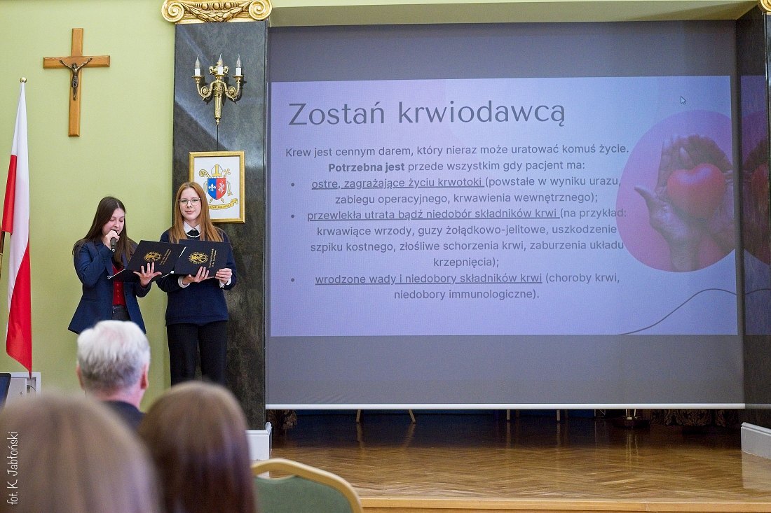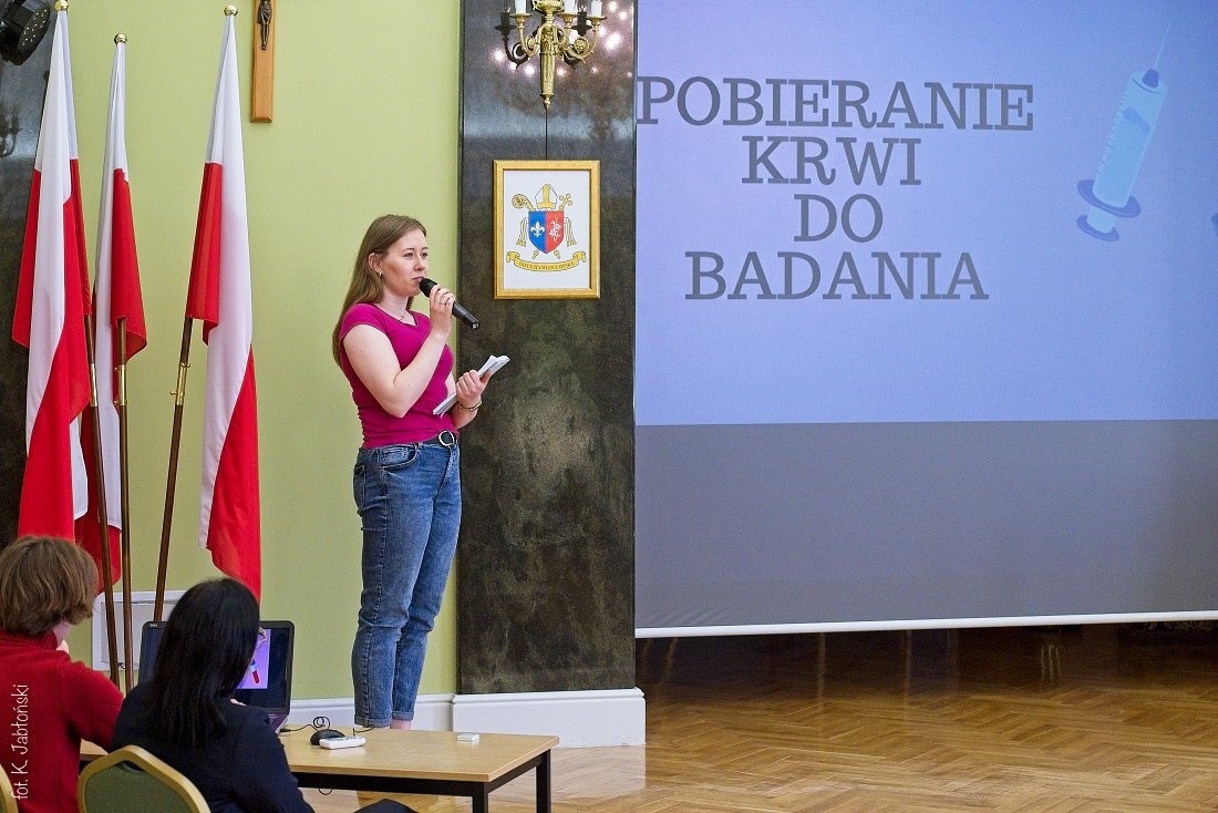 W tym wyjątkowym dniu zaszczyciła nas swoją obecnością p. Marta Michalak, która na co dzień pracuje jako pielęgniarka na oddziale wewnętrznym Specjalistycznego Szpitala Miejskiego w Toruniu. Opowiedziała nam o swojej ciężkiej, aczkolwiek ciekawej i dającej mnóstwo satysfakcji pracy. Przedstawiła procedurę pobierania krwi do badań, oddawania krwi potrzebującym i tym samym mamy nadzieję, że zachęciła wszystkich aby w przyszłości dzielili się tym cennym darem z innymi.