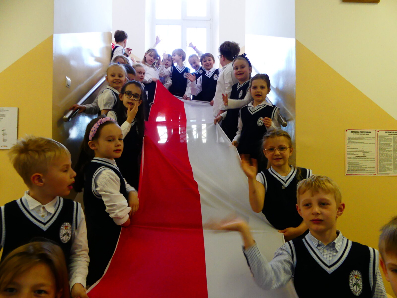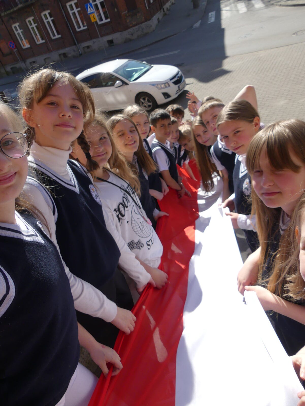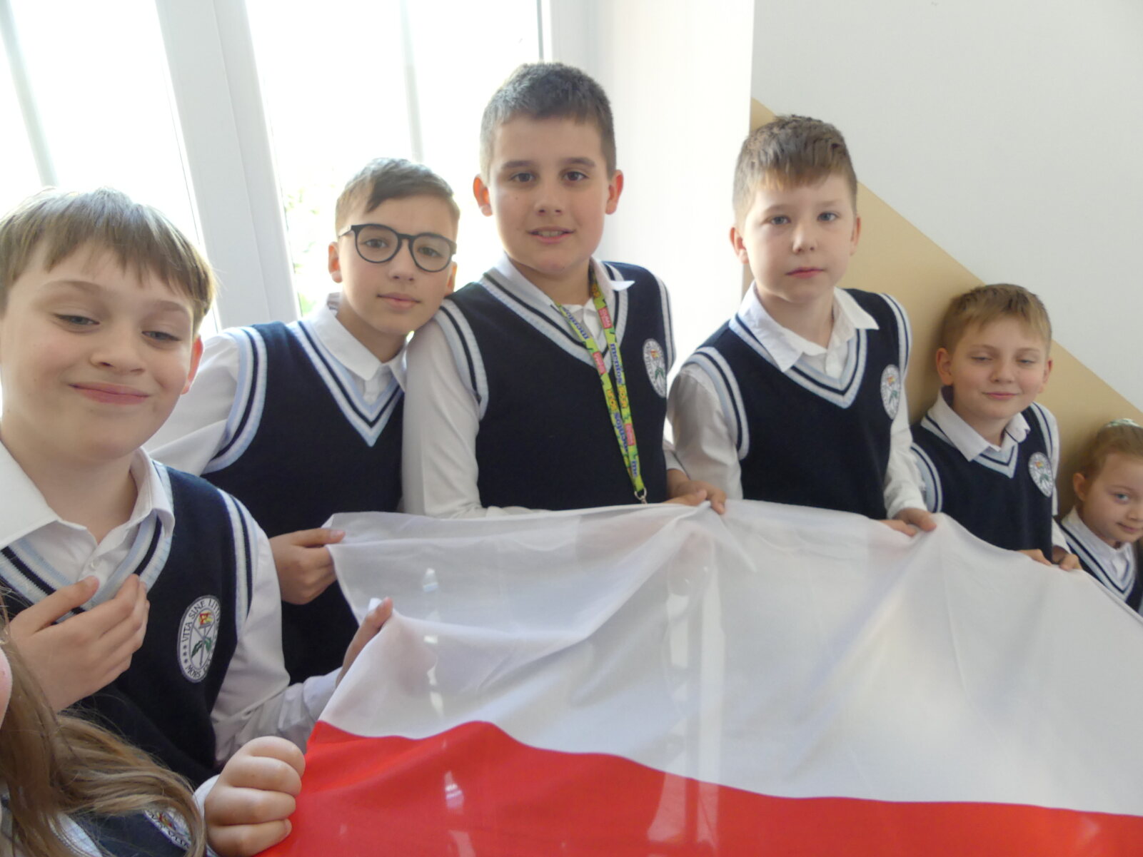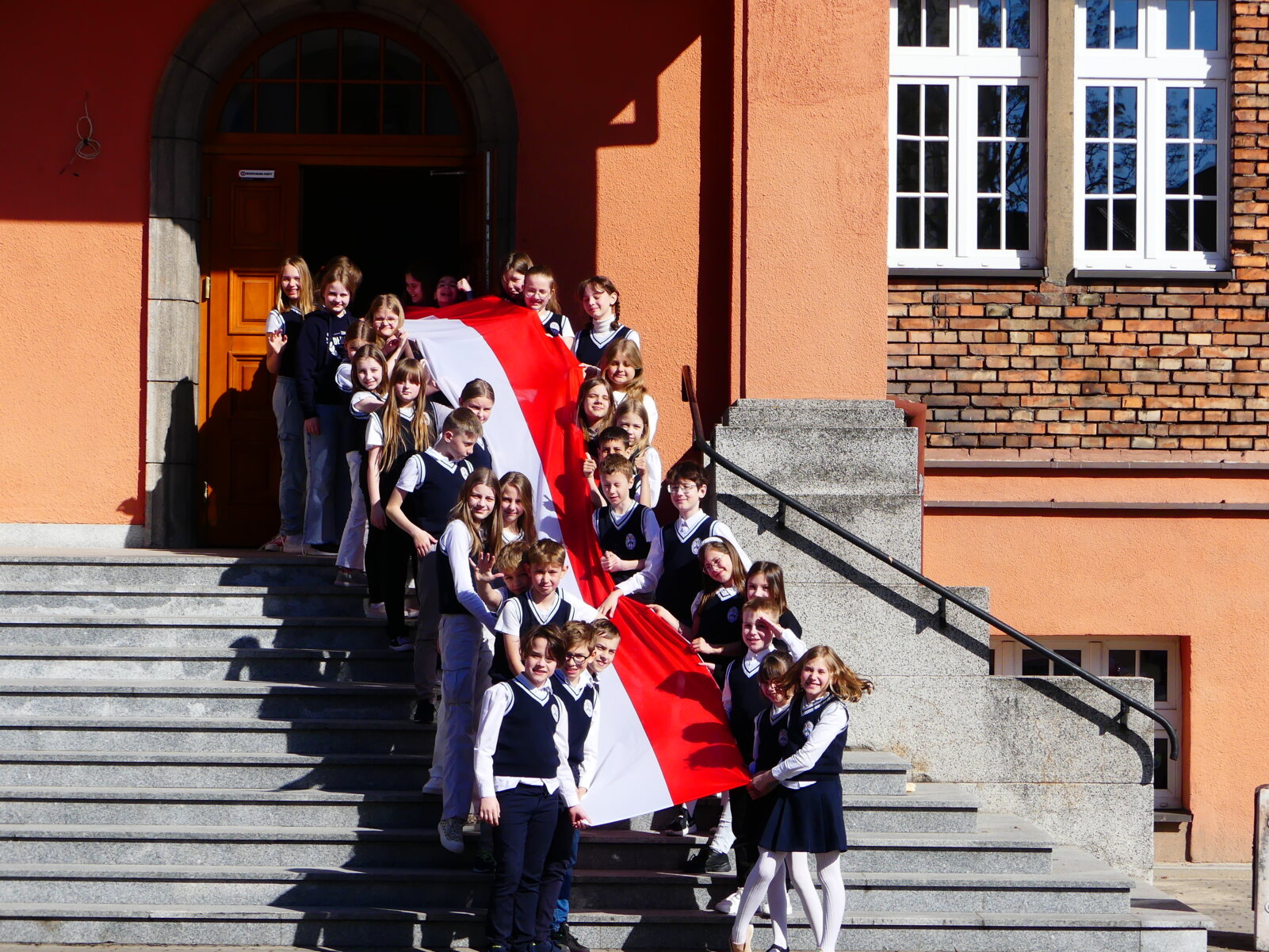 Maj to miesiąc, w którym każdy Polak powinien pamiętać o ważnych wydarzeniach dla naszej Ojczyzny. Dzień Flagi Państwowej oraz Uchwalenie Konstytucji 3 Maja to znaczące daty w historii kraju, dlatego też w tym miesiącu cała społeczność szkolna szczególnie stara się rozwijać uczucia patriotyczne i wzbudzać miłość do Ojczyzny. Kolory Flagi Polskiej towarzyszą nierozerwalnie dziejom historycznym naszego narodu, a są nimi biel – symbolizująca wartości duchowe, czystość i niepokalanie oraz czerwień – symbolizująca przelaną krew w walce w obronie kraju. Te przyjęte przez sejm barwy, 1 sierpnia 1919 roku, rozpowszechniły się bardzo szybko i towarzyszyły Polakom we wszystkich ważnych wydarzeniach. W piątek 28 kwietnia 2023 roku uczniowie naszej szkoły wspólnie z przedszkolakami uroczyście świętowali Dzień Flagi Rzeczypospolitej Polskiej. Atmosferę Święta czuliśmy od samego rana, a to za sprawą galowych strojów dzieci oraz okazałej flagi w naszych biało-czerwonych barwach. Tę flagę dumnie rozciągnęliśmy w murach naszej szkoły, pamiętając o każdym piętrze i stanowiąc z nią nierozerwalną całość. Był to wspaniały symbol patriotycznej uczniowskiej wspólnoty. Dzień ten był wspaniałą okazją do wyrażenia dumy z tego, że jesteśmy Polakami, a Polska to nasza Ojczyzna.