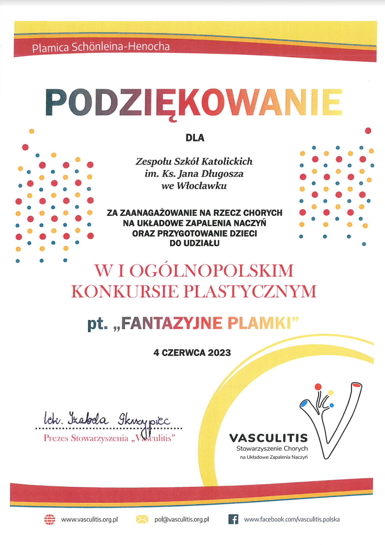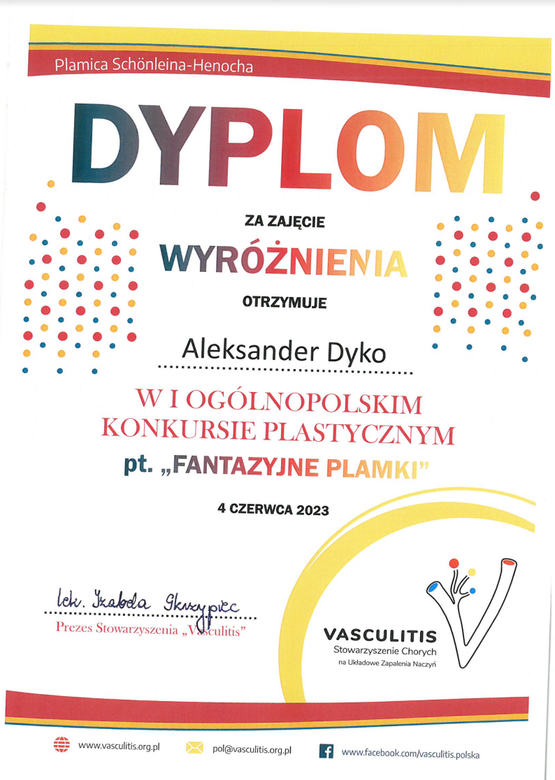 Z wielką radością informujemy, że uczeń klasy 4b SP Aleksander Dyko zdobył wyróżnienie w I Ogólnopolskim Konkursie Plastycznym pt. „Fantazyjne plamki” zorganizowanym przez Stowarzyszenie Chorych na Układowe Zapalenia Naczyń. Jak podaje organizator na konkurs zostało zgłoszonych 186 prac z 43 różnych placówek szkolnych oraz kulturowych. Celem konkursu było popularyzowanie wiedzy o rzadkiej chorobie należącej do układowych zapaleń naczyń Plamicy Schönleina-Henocha, rozwijanie wyobraźni oraz zdolności plastycznych, a także aktywizacja społeczna chorych na układowe zapalenia naczyń (szczególnie dzieci). Opiekunem artystycznym uczniów była pani Bożena Sobierajska.