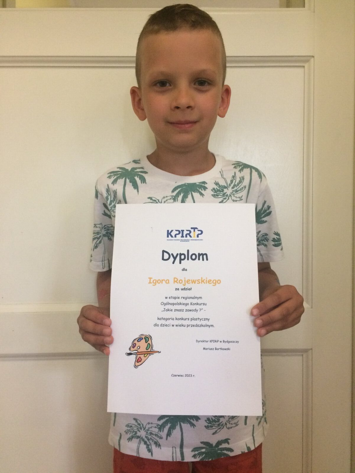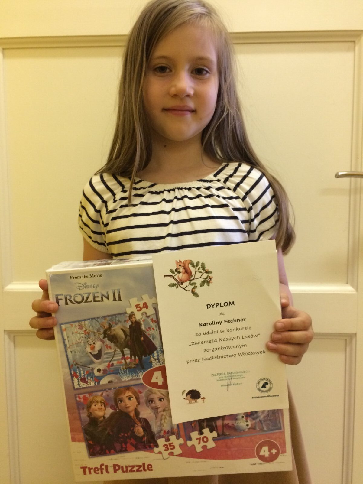 Miło mi poinformować, że Karolina Fechner z grupy 6-latki A została wyróżniona w konkursie „Zwierzęta naszych lasów”, organizowanym przez Nadleśnictwo Włocławek. Za udział w konkursie otrzymała pamiątkowy dyplom oraz nagrodę rzeczową. Igor Rojewski otrzymał natomiast dyplom za udział w Ogólnopolskim Konkursie „Jakie znasz zawody”.