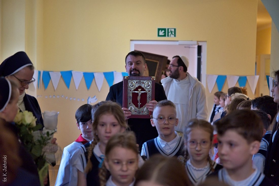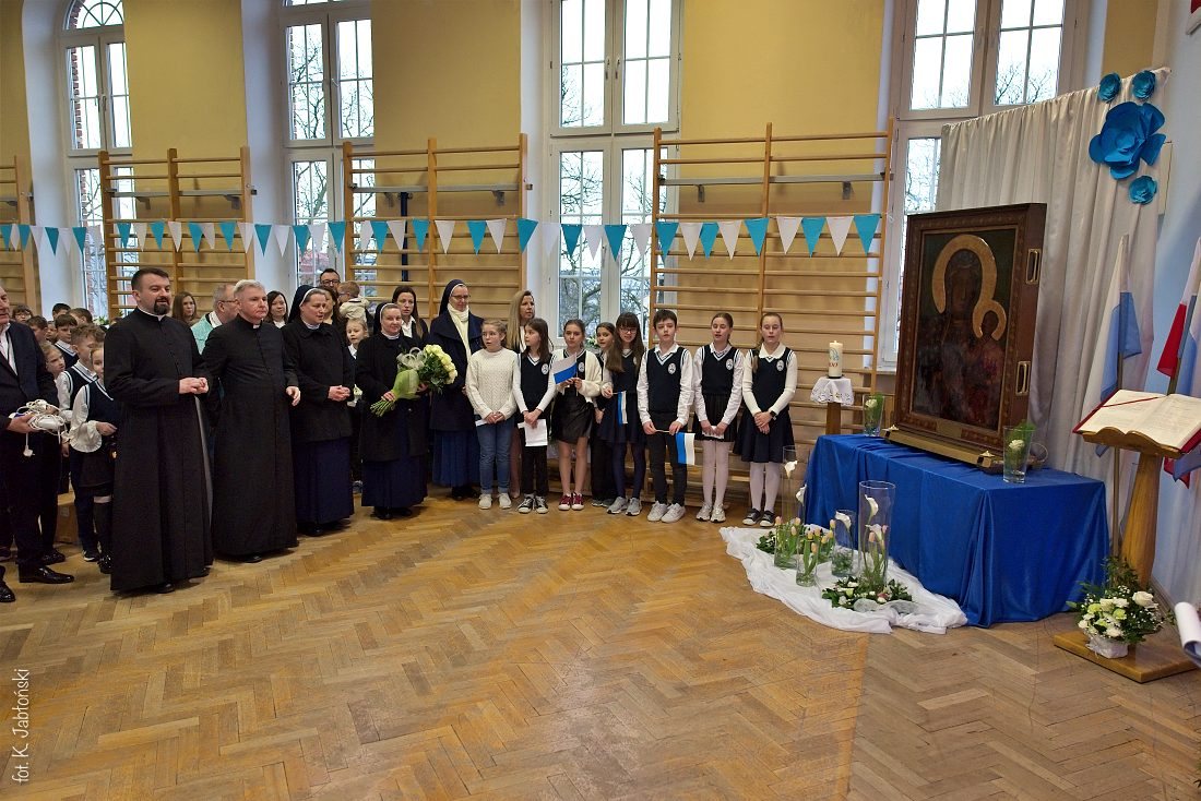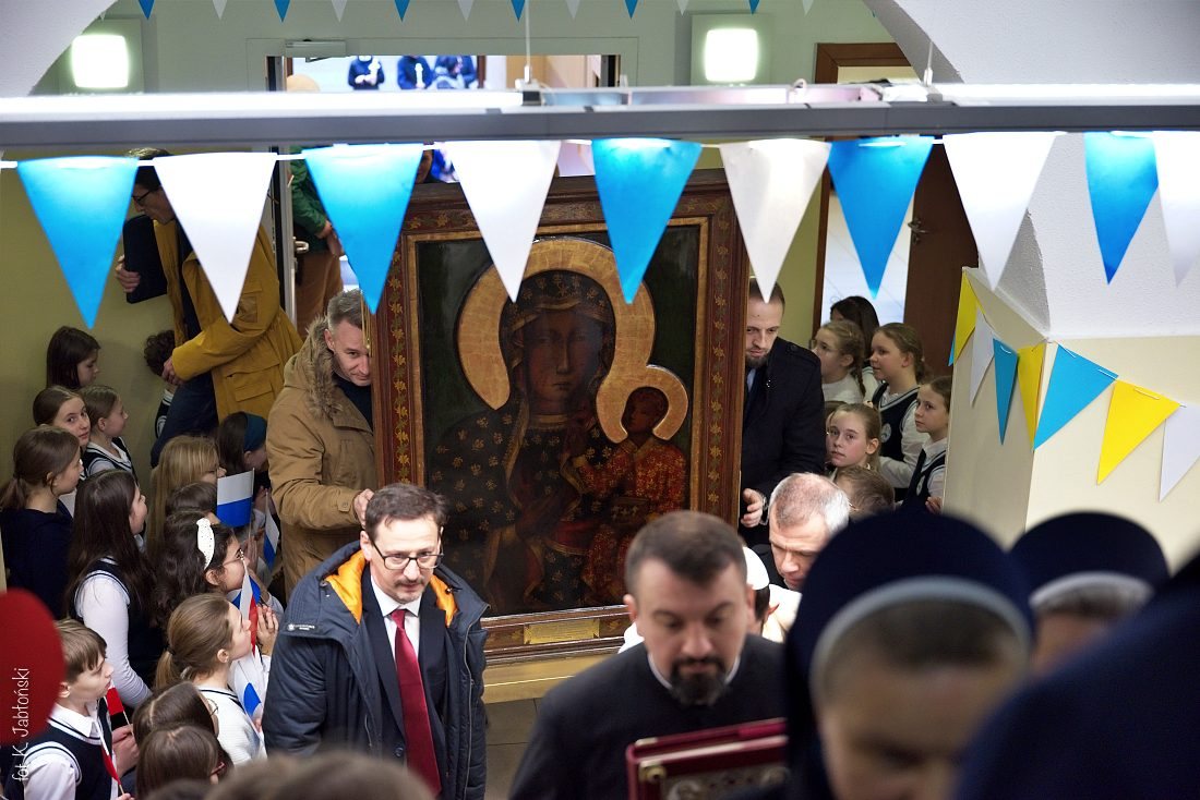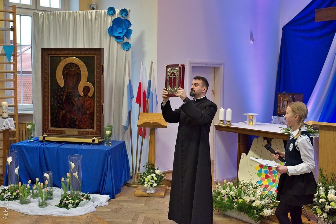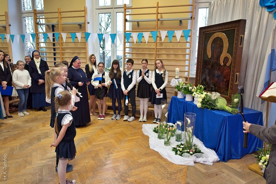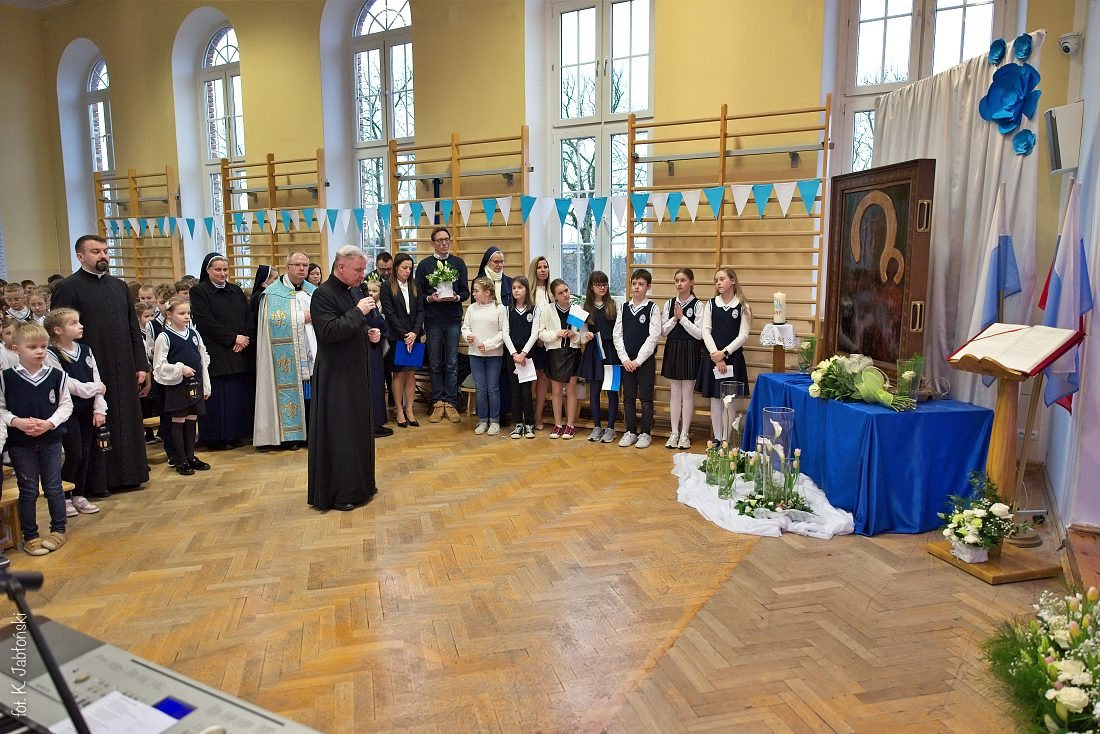 Przedszkolaki z wychowawczyniami wraz z ks. dyrektorem Jackiem Kędzierskim oraz ks. wicedyrektorem Sebastianem Tomczakiem uroczyście przywitali Ikonę przed budynkiem szkoły, by wspólnie udać się na salę gimnastyczną, gdzie z niecierpliwością czekali już pozostali uczniowie, nauczyciele oraz pracownicy Małego Długosza. Sala ta aż do piątku stała się miejscem modlitwy oraz duchowych uroczystości.