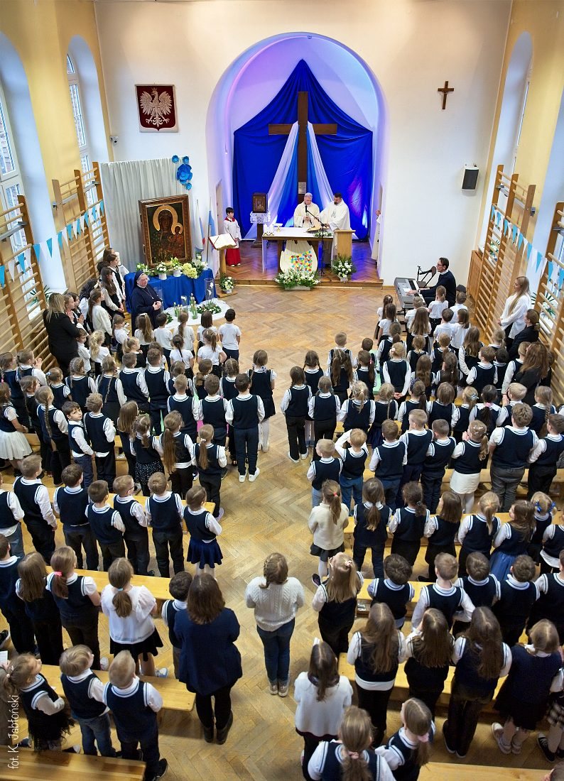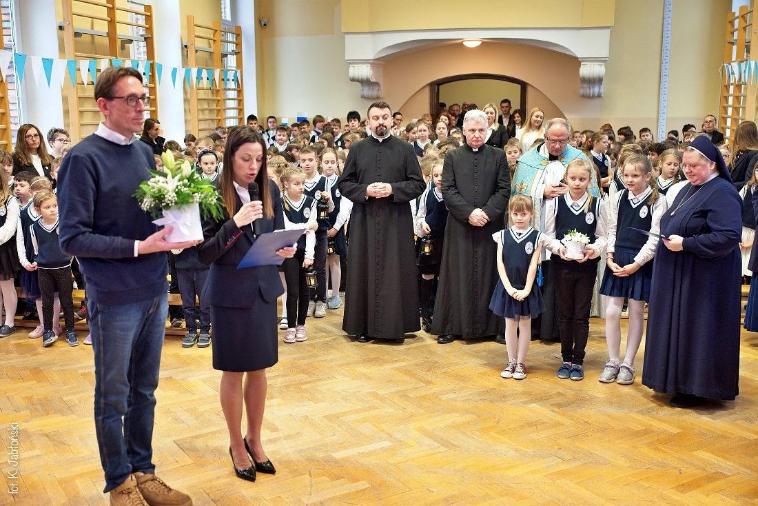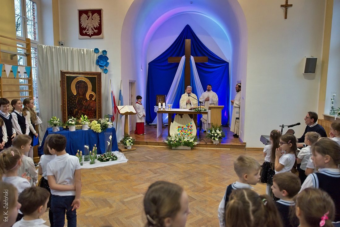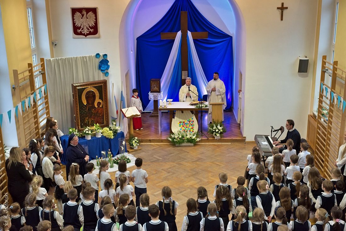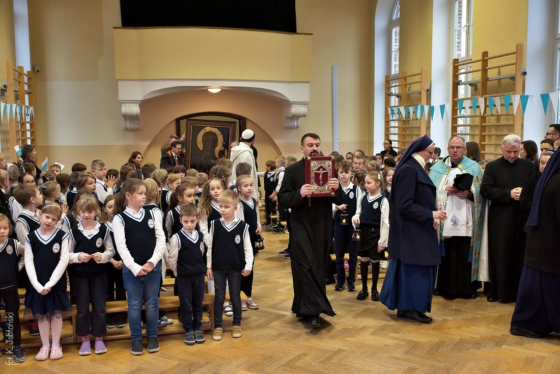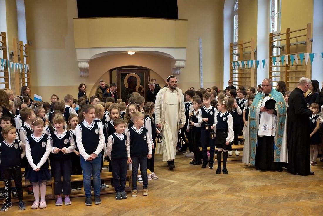 Przedszkolaki z wychowawczyniami wraz z ks. dyrektorem Jackiem Kędzierskim oraz ks. wicedyrektorem Sebastianem Tomczakiem uroczyście przywitali Ikonę przed budynkiem szkoły, by wspólnie udać się na salę gimnastyczną, gdzie z niecierpliwością czekali już pozostali uczniowie, nauczyciele oraz pracownicy Małego Długosza. Sala ta aż do piątku stała się miejscem modlitwy oraz duchowych uroczystości.