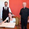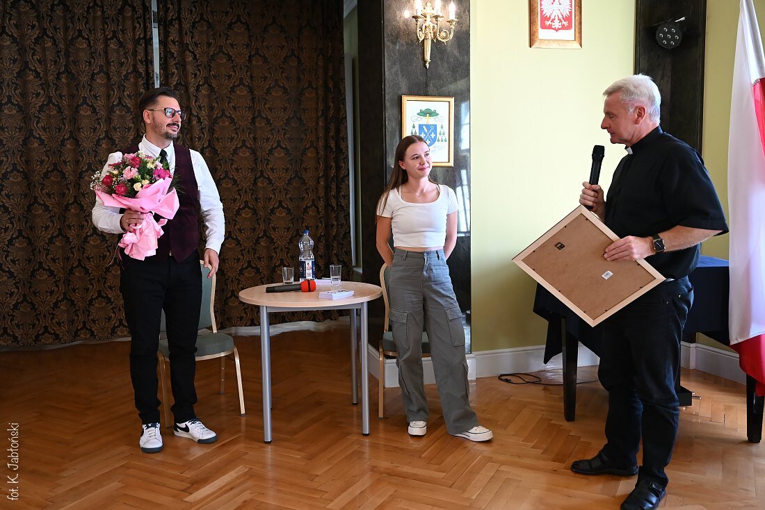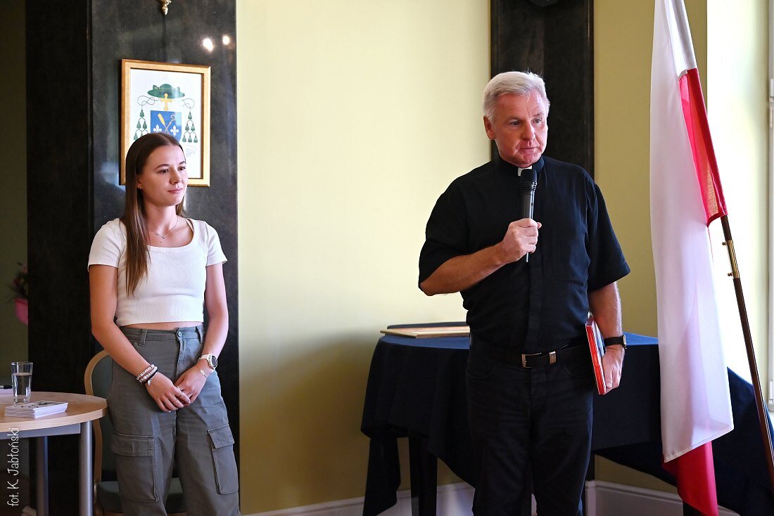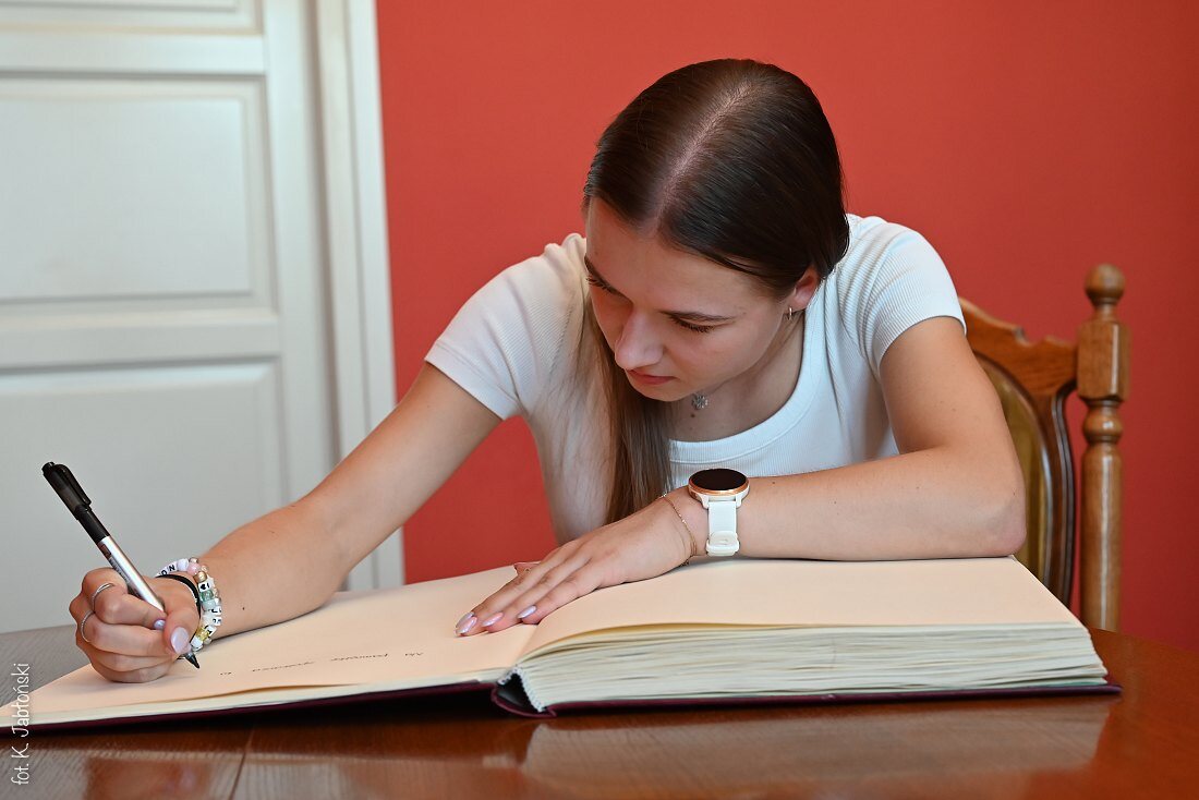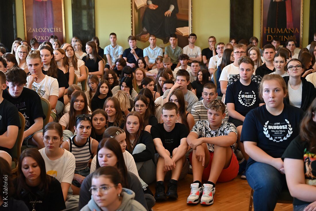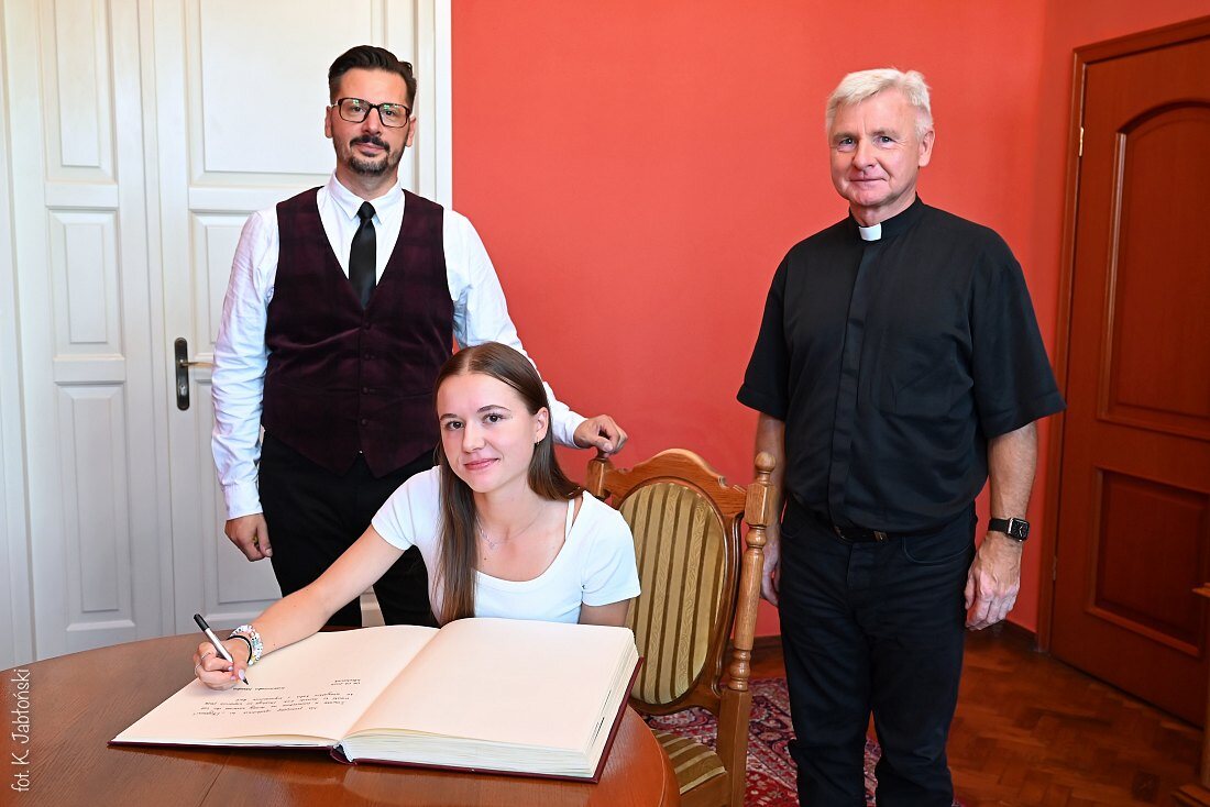 Wizytę w Długoszu rozpoczęła od wpisu do kroniki szkolnej, gdzie swoje wpisy składają najwybitniejsi goście. Klaudia miała też okazję chwilę porozmawiać z ks. dr. Jackiem Kędzierskim. Niestety nie było czasu na dłuższą pogawędkę, gdyż „wzywały obowiązki”. Klaudia miała spotkać się z naszymi licealistami i uczniami szkoły podstawowej.