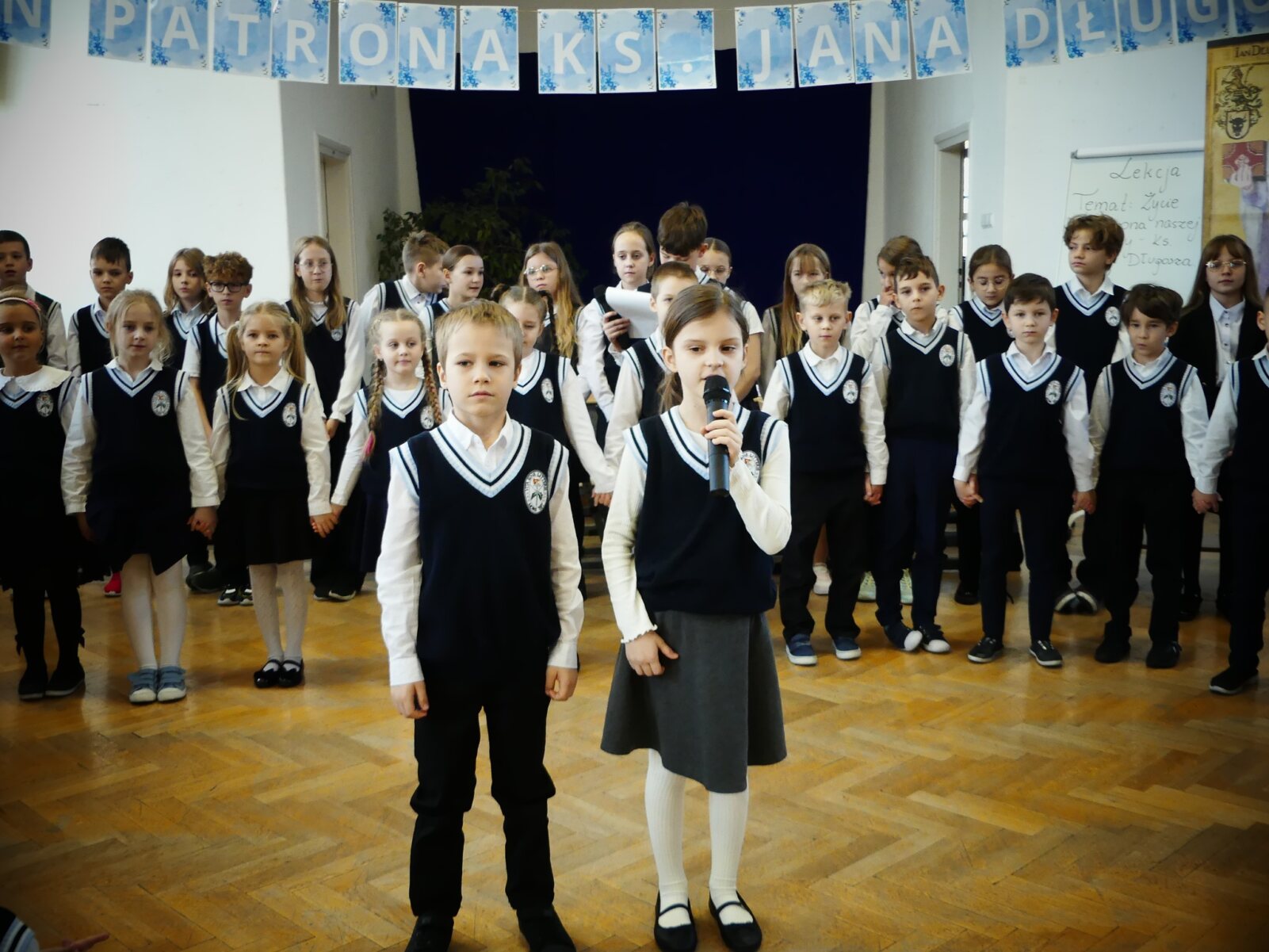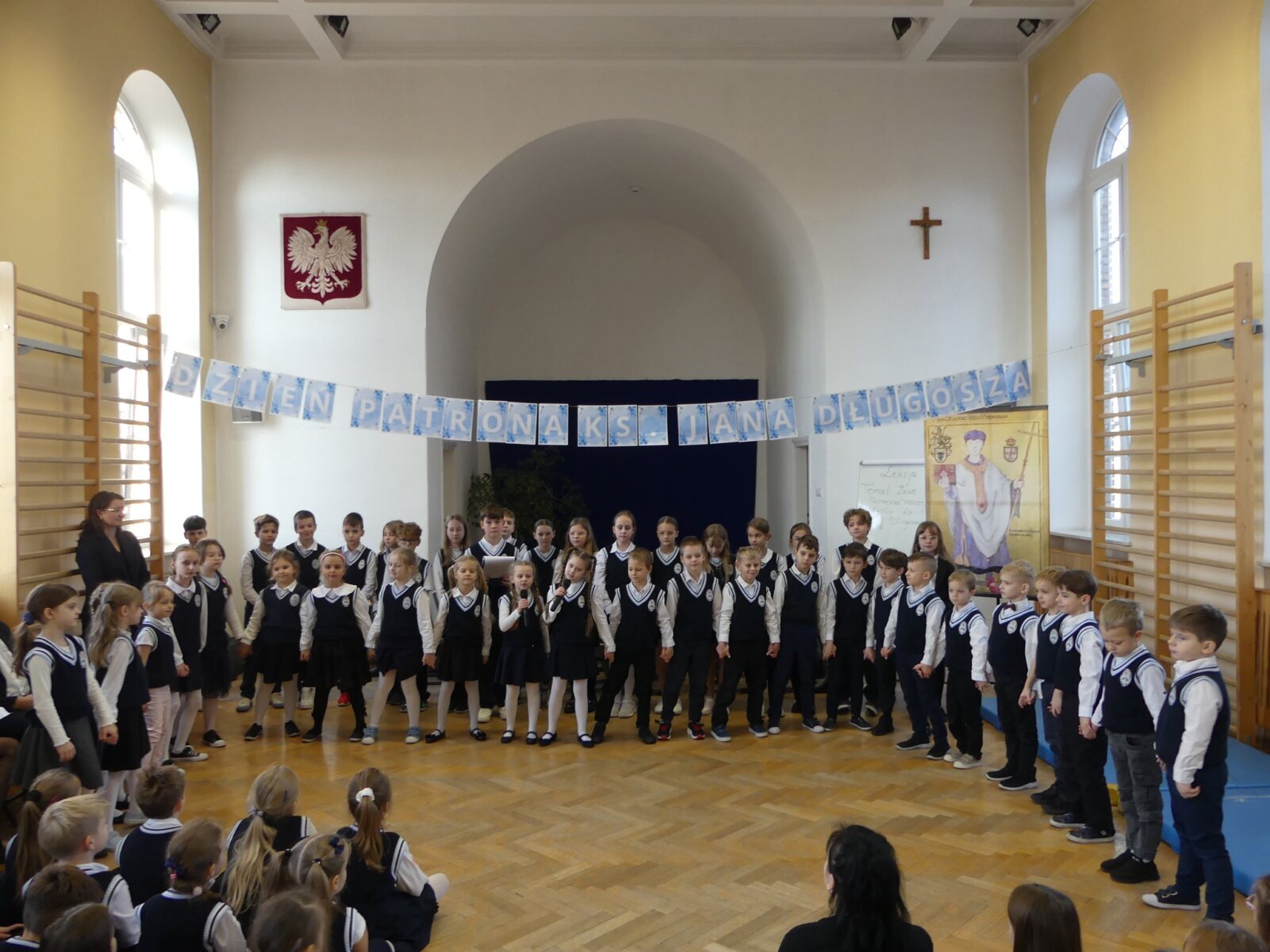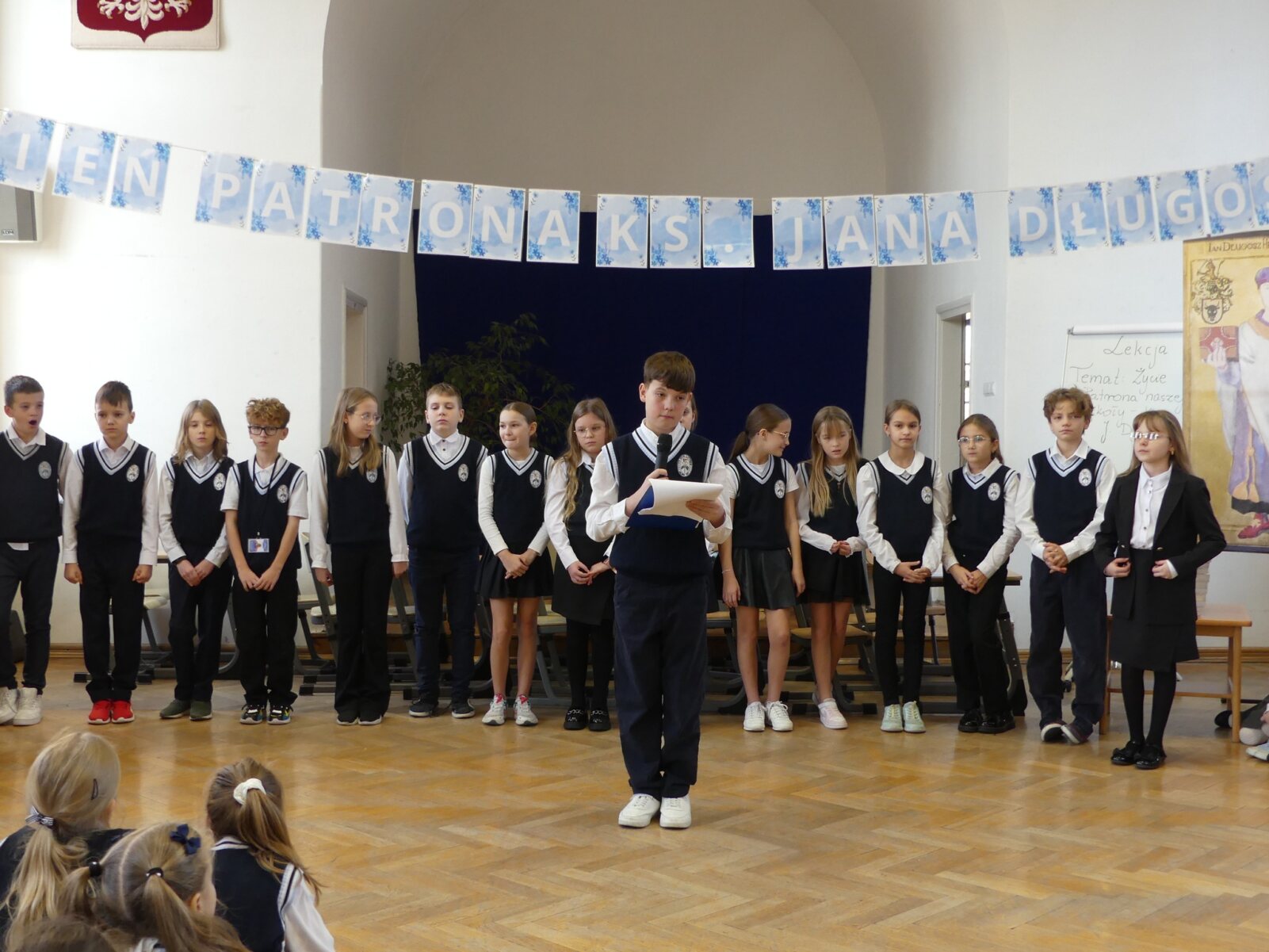 Podczas apelu uczniowie klasy 4c przybliżyli najważniejsze fakty dotyczące życia i działalności patrona szkoły. W przedstawieniu przypomniano jego zasługi jako kapłana, nauczyciela, wychowawcy, historyka, a także ogromny wkład w rozwój polskiej edukacji i kultury. Szkolna scena, na czas przedstawienia, stała się wyjątkową lekcją, podczas której uczniowie z ogromnym zaangażowaniem opowiadali o patronie szkoły. Pełen radości był także wokalno-artystyczny występ uczniów kl. 1b. Dziękujemy za pomoc wychowawcy klasy – pani Paulinie Makowskiej!