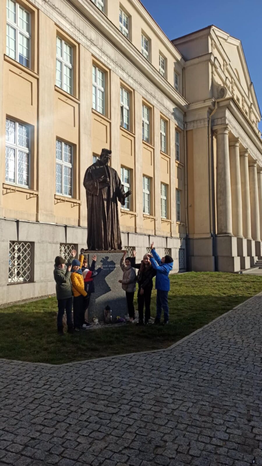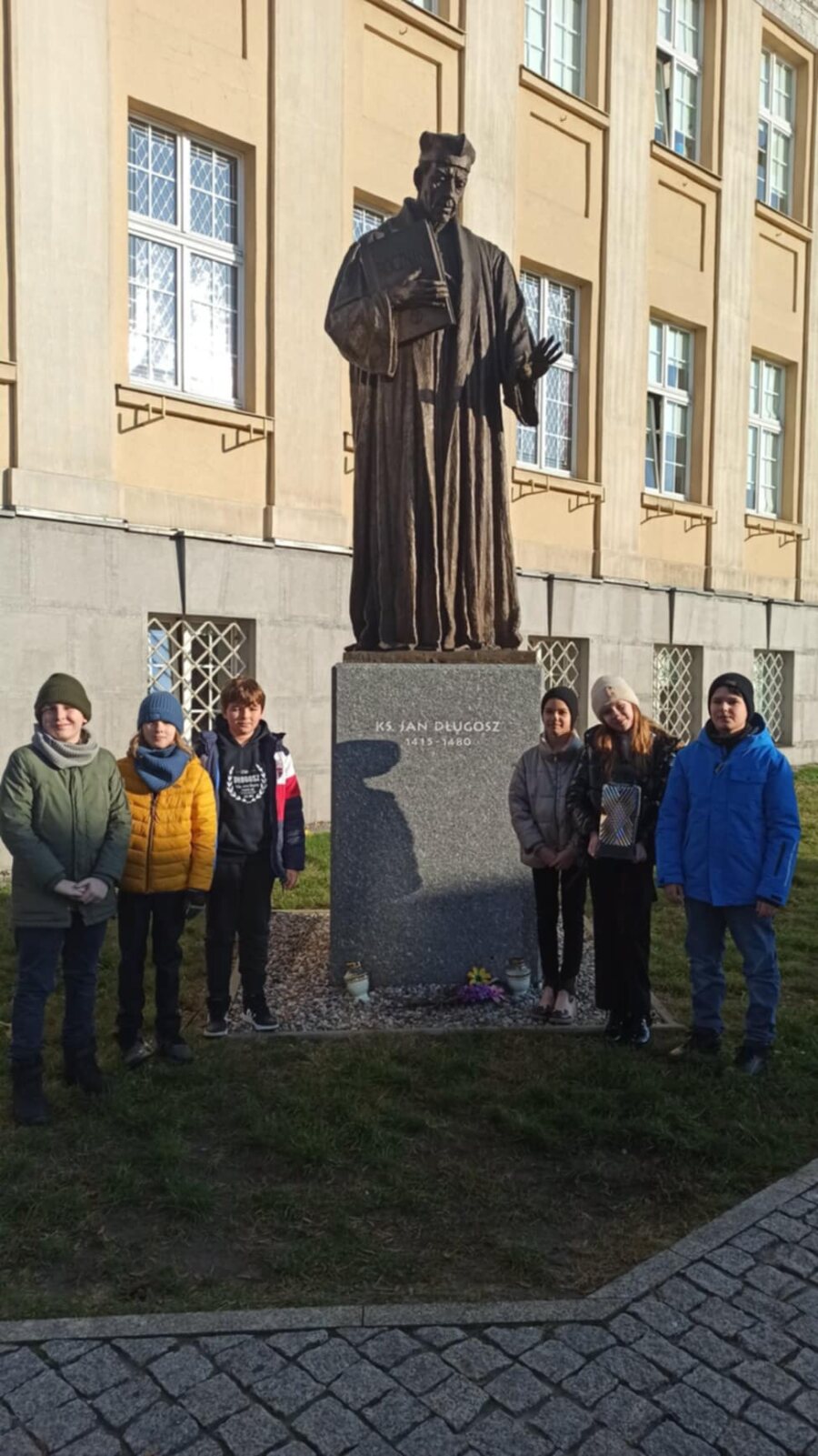 Po apelu przedstawiciele klas 4, wraz z panią Andżeliką Uzarczyk, wybrali się pod pomnik ks. Jana Długosza, który znajduje się obok gmachu szkoły przy ulicy Łęgskiej. Wspólnie oddali hołd naszemu patronowi, poprzez zapalenie symbolicznego znicza – znaku naszej pamięci.