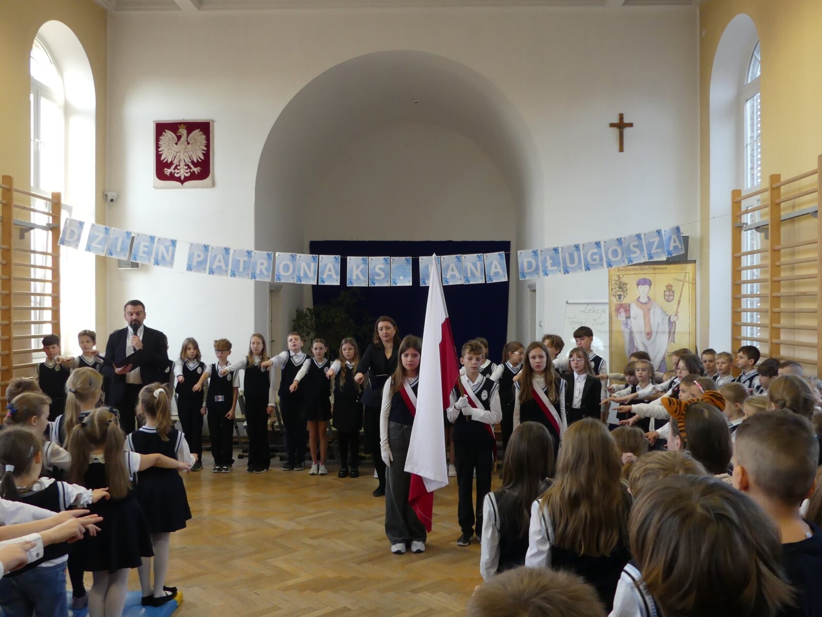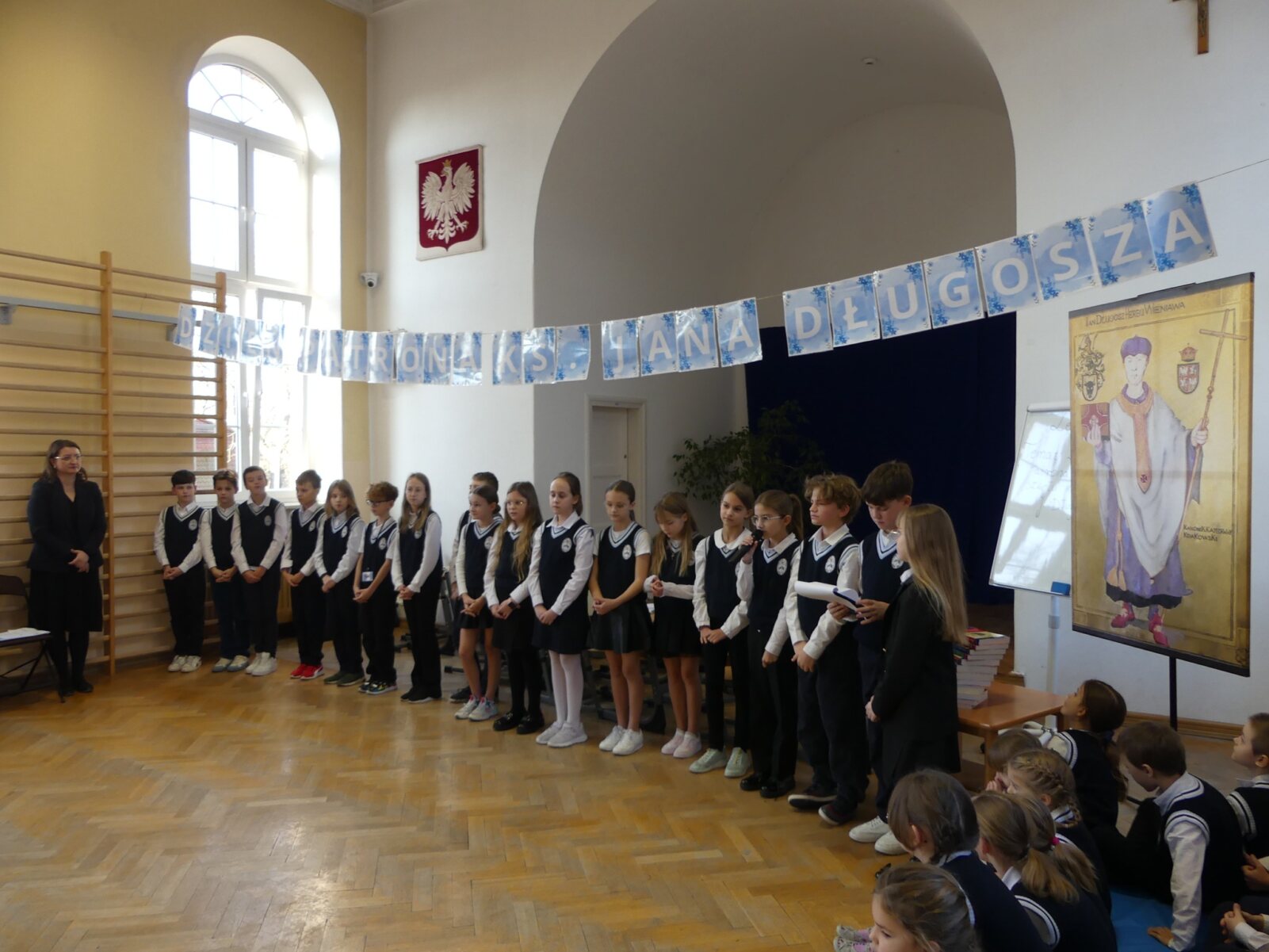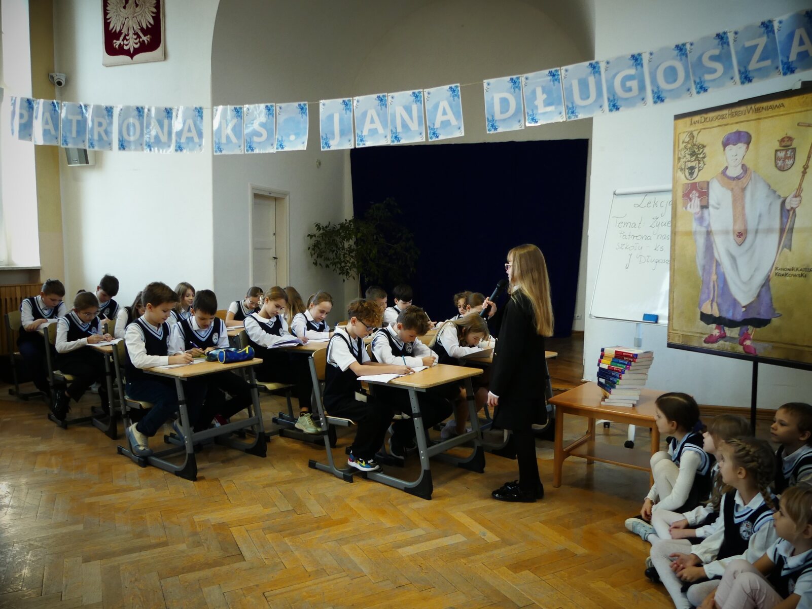2 grudnia 2024 roku, z okazji rocznicy urodzin ks. Jana Długosza – patrona naszej szkoły – odbył się uroczysty apel, przygotowany przez klasę 4c oraz 1b SP. W ramach obchodów Święta Patrona przedstawiono ciekawą inscenizację, mającą na celu zaprezentowanie tej wyjątkowej postaci.