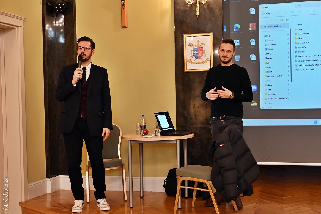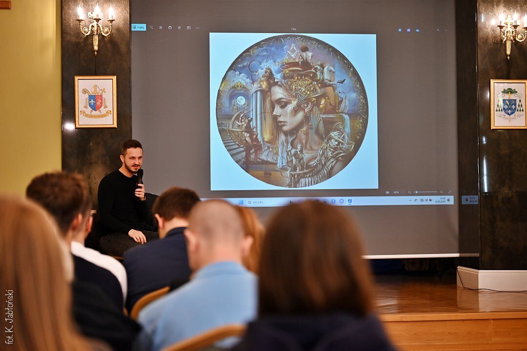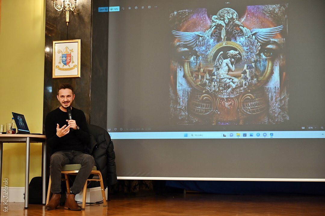 Surrealistyczne obrazy, z licznymi motywami i inspiracjami historyczno-mitologicznymi zrobiły ogromne wrażenie na wszystkich przybyłych na spotkanie, szczególnie na tych, którzy wcześniej nie mieli okazji oglądać obrazów naszego gościa. Unikalny styl polegający na połączeniu elementów ciała ludzkiego i architektury jest cechą charakterystyczną obrazów naszego absolwenta, a jak sam autor podkreśla jego wdzięczną i piękną muzą jest jego małżonka, obecna na wielu obrazach.