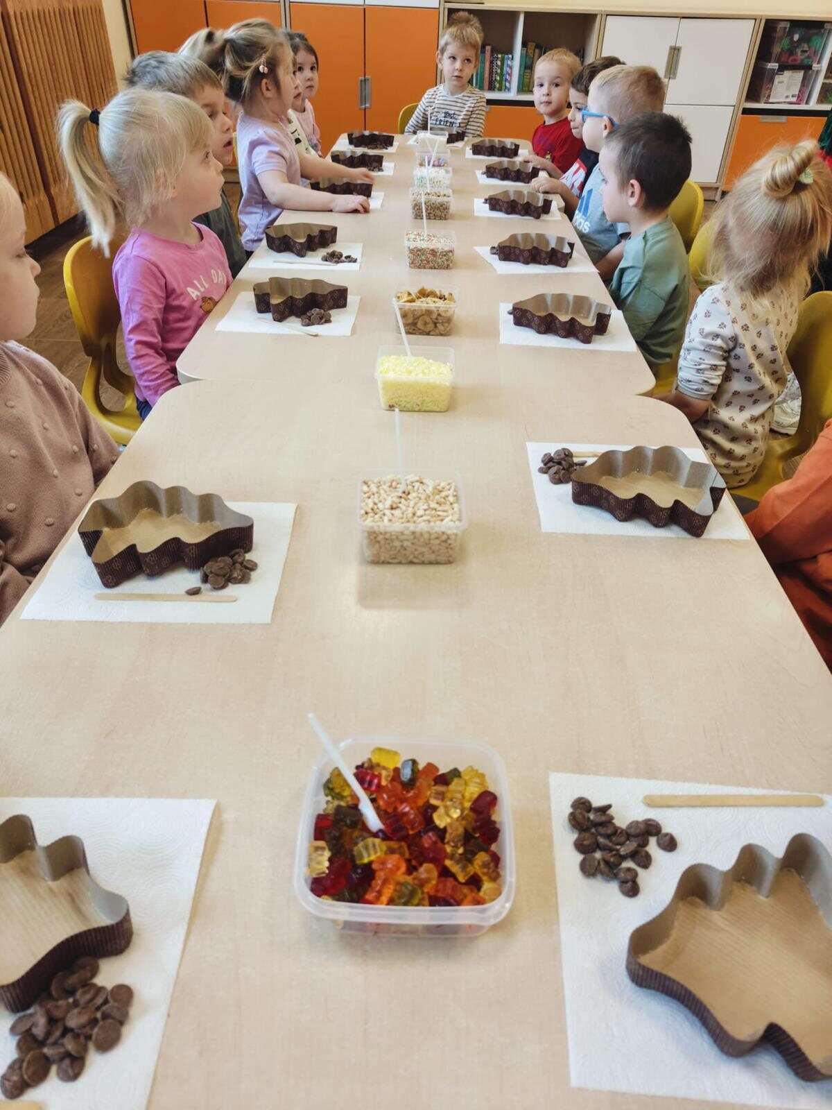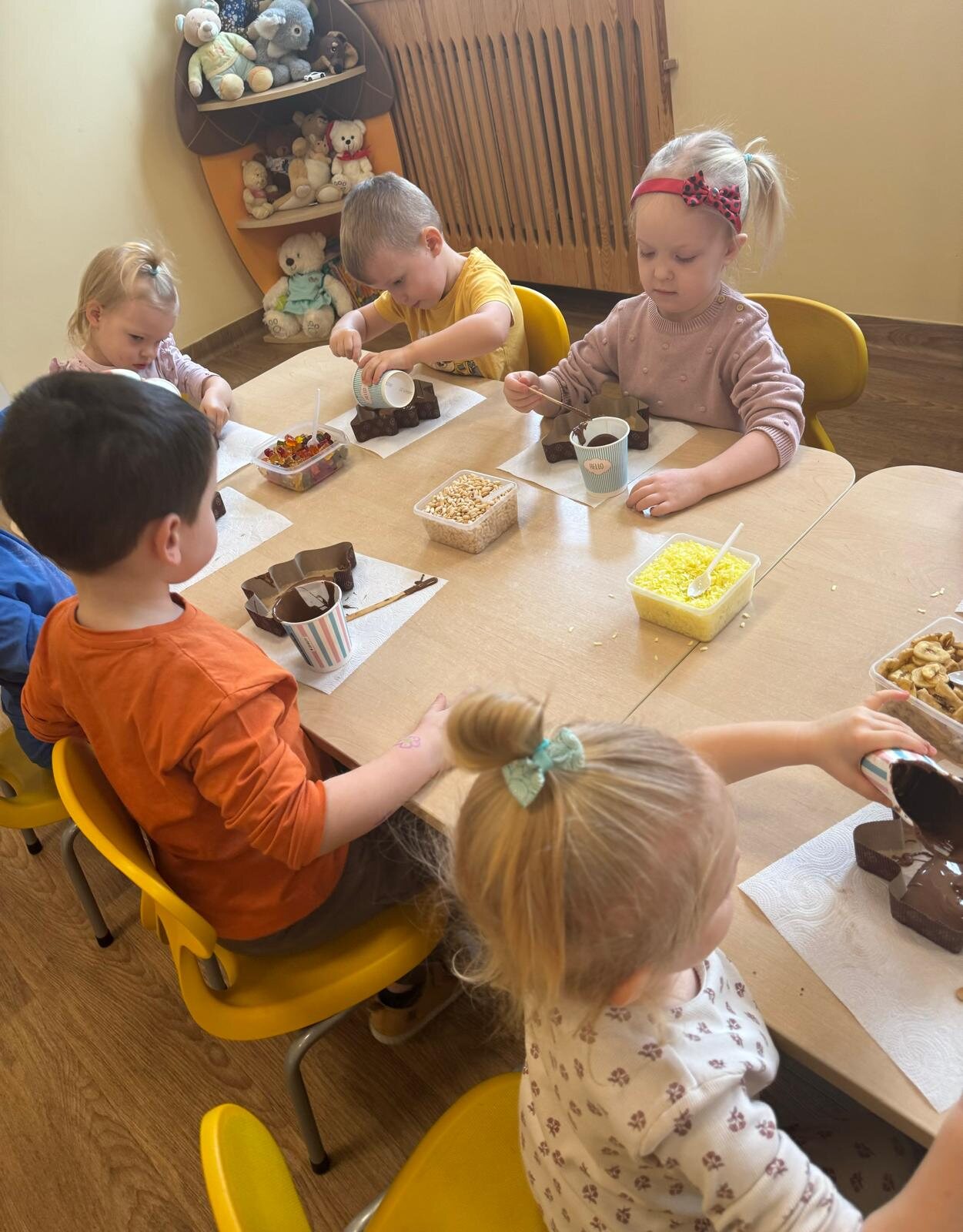 W Mikołajki 06.12.2024 r. w grupie „Gwiazdki” odbyły się czekoladowe warsztaty przeprowadzone przez Akademię Pana Królika. Są to praktyczne zajęcia pobudzające zmysł smaku, wykorzystujące zdolności manualne i kreatywne myślenie dzieci. Podczas zajęć dzieci miały okazję poznać etapy produkcji czekolady – począwszy od jej głównego składnika – kakaowca, po ostateczny produkt, jakim jest tabliczka czekolady. Dzieci otrzymały foremki w kształcie choinki, które wypełniły płynną czekoladą.  Na końcu mogły ją samodzielnie udekorować. Był to bardzo smakowity i słodko spędzony czas w naszej grupie.