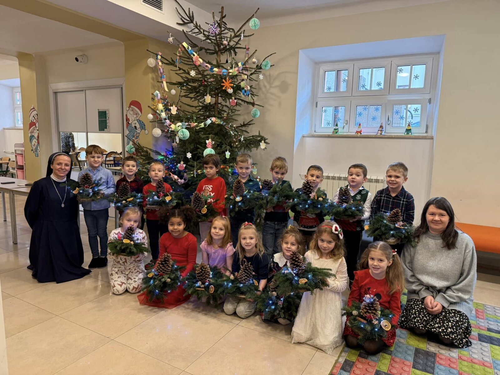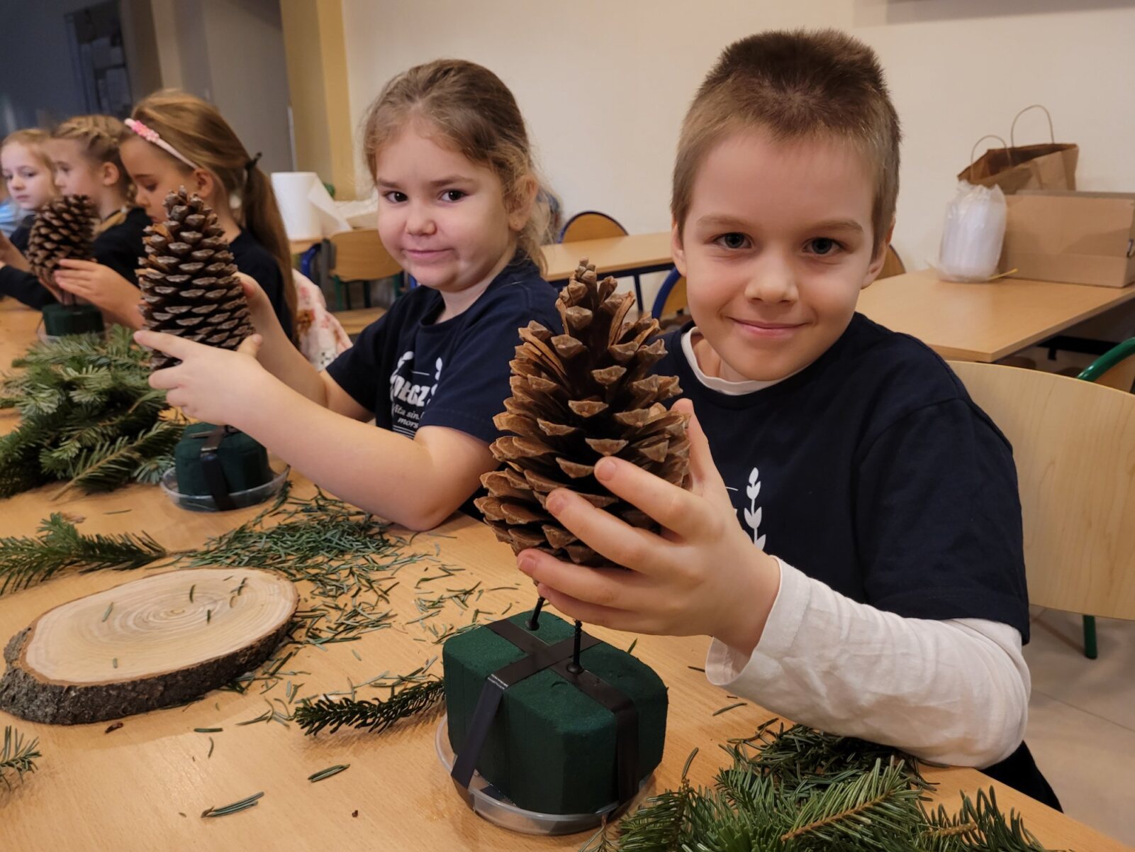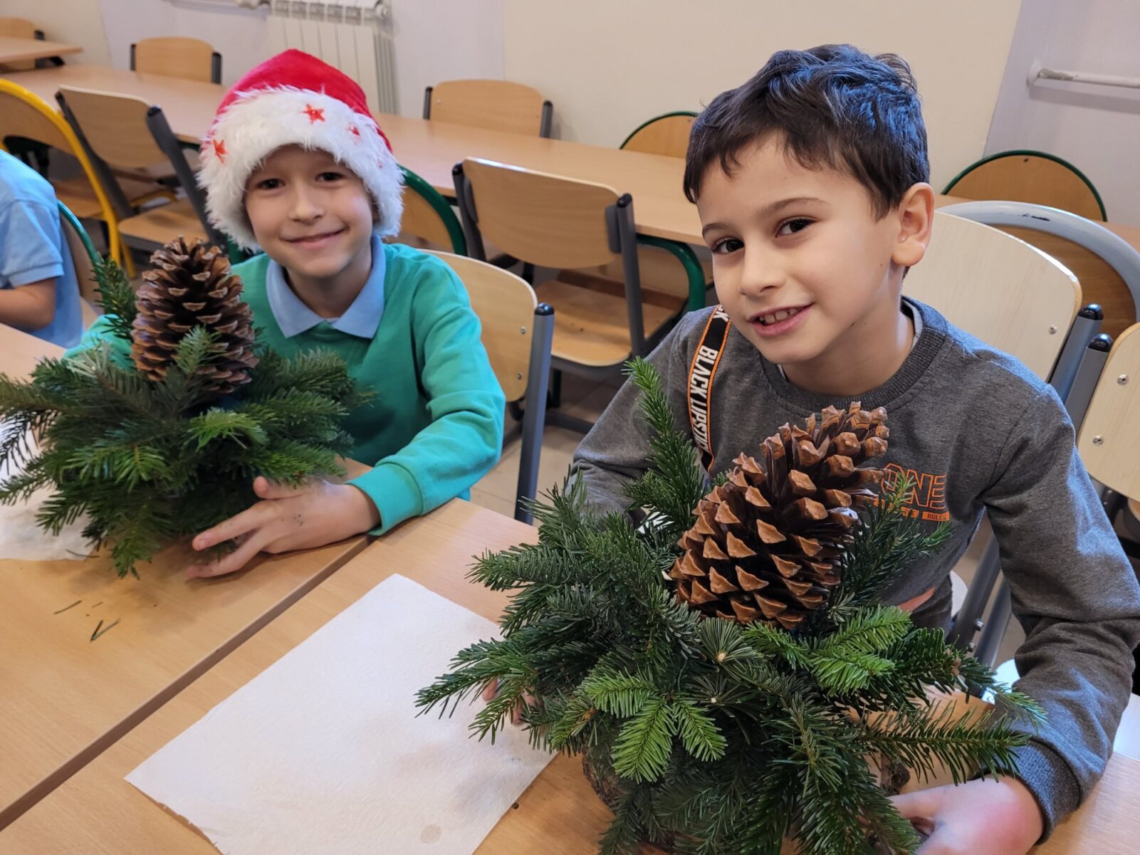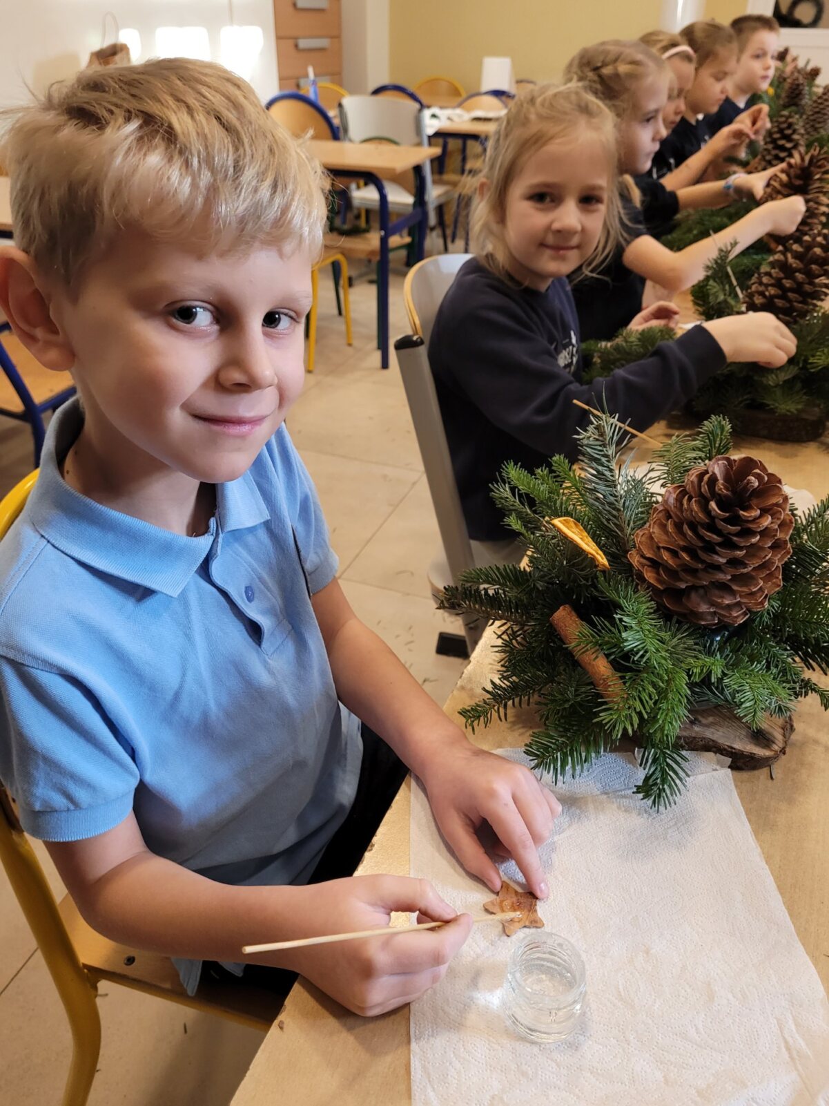 Zbliża się najpiękniejszy okres w roku – Święta Bożego Narodzenia. Warsztaty świąteczne to idealny pomysł na spędzenie tego czasu i moment, aby wczuć się w ten świąteczny klimat. 18 grudnia 2024 roku w grupie 5 latków A oraz w klasach I a i b odbyły się właśnie takie warsztaty. Zajęcia poprowadziła znana i niezawodna p. Maja Piwnicka – florystka, która często gości w naszej długoszowskiej społeczności. Celem zajęć było rozwijanie sprawności manualnej oraz wzbogacenie wiadomości przyrodniczych. Zajęcia rozpoczęły się od poznania nazw mało znanych roślin oraz przypomnieniem jak należy dbać o rośliny. Następnym etapem było namaczanie gąbki, w której dzieci tworzyły kompozycję z pięknie pachnącej jodły. Ogromnym zaskoczeniem i zaciekawieniem była mocowana do gąbki szyszka, która była bardzo duża. W kolejnej części warsztatów dzieci upiększyły stroik ozdobami świątecznymi. Skupienie i zaangażowanie było bardzo widoczne na twarzach dzieci. W końcowym etapie zostały doczepione światełka. Na koniec dzieci mogły zrobić sobie zdjęcie z wykonaną pracą, a następnie zabrać do domu. Serdecznie dziękujemy p. Mai za trud włożony w przygotowanie warsztatów oraz za niezwykle kreatywne zajęcia.