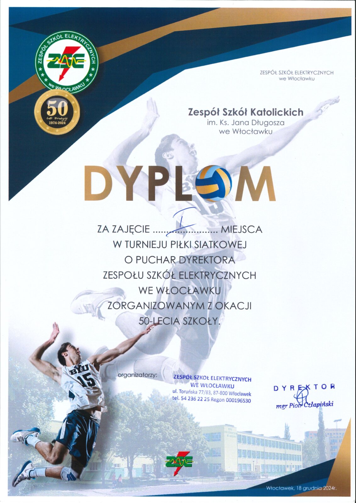 Dzisiaj, 18. grudnia br., z okazji 50-lecia Zespołu Szkół Elektrycznych we Włocławku, odbył się Turniej Piłki Siatkowej Chłopców o Puchar Dyrektora Szkoły. W turnieju wzięły udział 3 drużyny chłopców: Zespół Szkół Elektrycznych, LO Aleksandrów Kujawski oraz nasza Drużyna Chłopców LO.