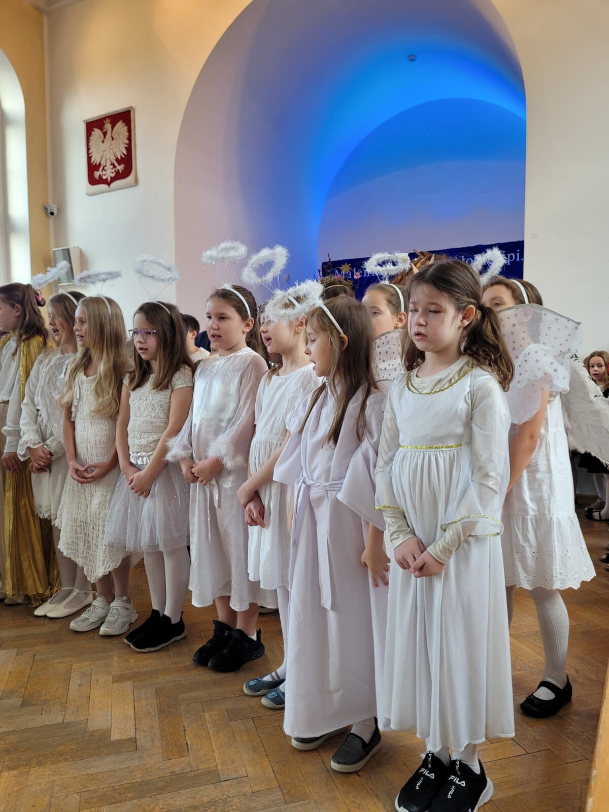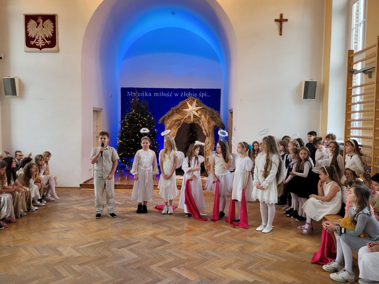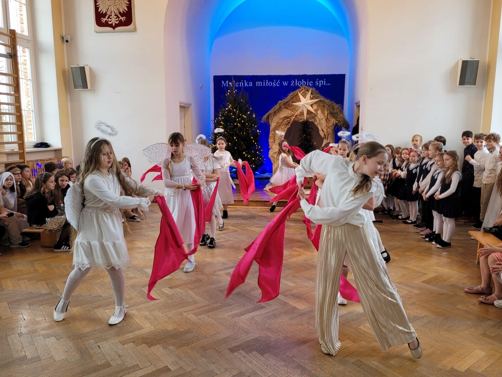 Piękna dekoracja, bardzo starannie przygotowane stroje aniołów i innych postaci występujących w programie przyciągały uwagę oglądających. Chór szkolny pod kierunkiem p. Antoniny Ratajczyk przygotował śliczne kolędy i pastorałki, które wzbogaciły Jasełka. Występujący aktorzy – uczniowie klasy 3c i 4a świetnie wcielili się w swoje role, aby przekazać nam najważniejsze wartości płynące z narodzin Jezusa. Wszyscy poczuliśmy się jedną rodziną, w której panuje radość, wzajemna życzliwość i zrozumienie. Odczuliśmy, że każdy z nas otrzyma Dar Bożego Narodzenia, a Święta będą najpiękniejszymi dniami w naszym życiu.