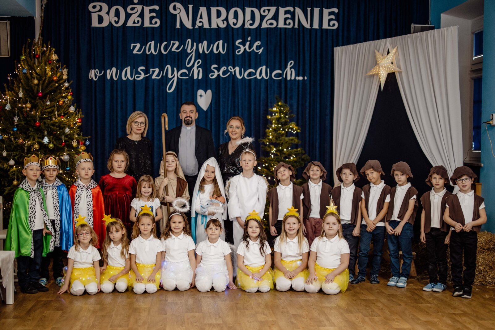 Na koniec ksiądz wicedyrektor Sebastian Tomczak podziękował za występ i złożył całej społeczności przedszkola życzenia świąteczne. Takie podniosłe chwile nie tylko utrwalają dzieciom znajomość tradycji i zwyczajów świątecznych, lecz wzmacniają serdeczne relacje między nimi.