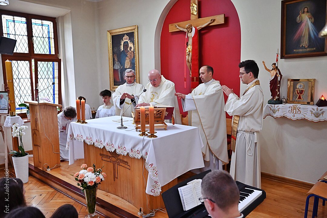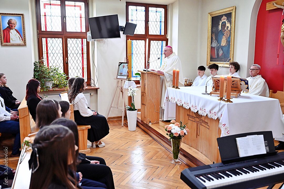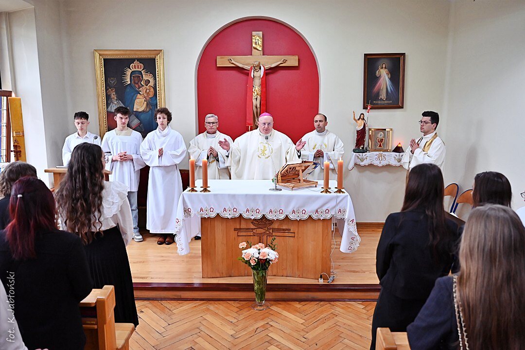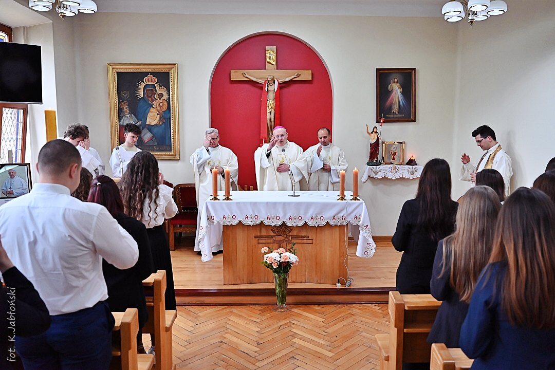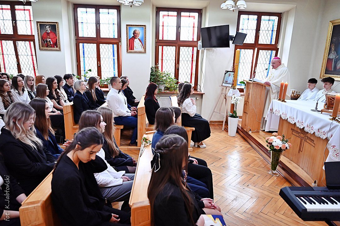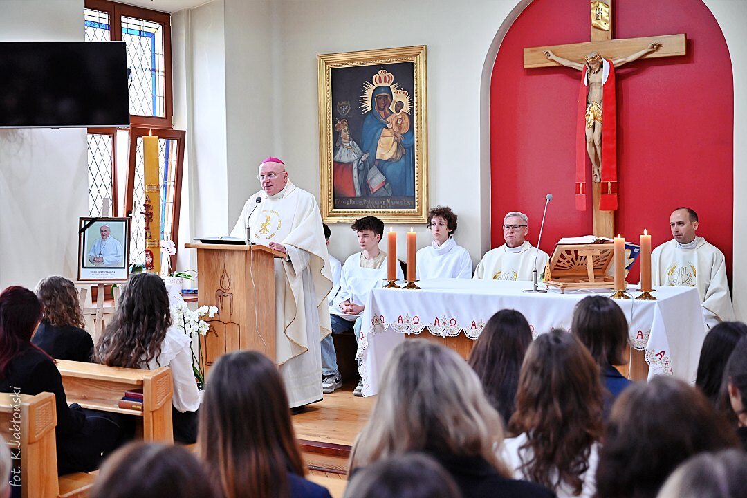W homilii Ksiądz Biskup zachęcił obecnych, by w tym szczególnym i przełomowym momencie życia osobistego i życia Kościoła poszukiwali odpowiedzi i znaków w Słowie Bożym. Rozważając fragment Dziejów Apostolskich i Ewangelii wg św. Jana dostrzegł trzy ważne myśli dla maturzystów, ale i każdego człowieka. Po pierwsze: niezawsze dobro, które czynimy spotka się z pozytywnym przyjęciem ze strony innych. Po drugie: Chrystus jest jedynym Zbawicielem, droga wiary w Niego trwa przez całe życie, gdyż nie ma innego Imienia, w którym moglibyśmy być zbawieni. Po trzecie: zawierzyć Chrystusowi, który w chwilach, kiedy zawodzą dotychczasowe mechanizmy, wskazuje nowe drogi i buduje z nami głęboką relację.