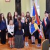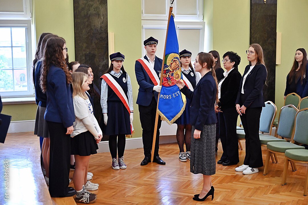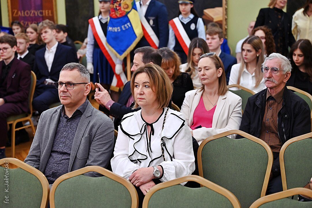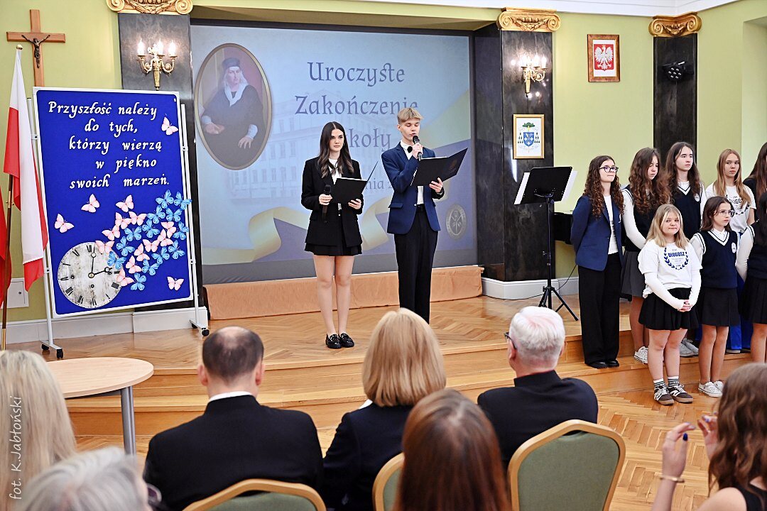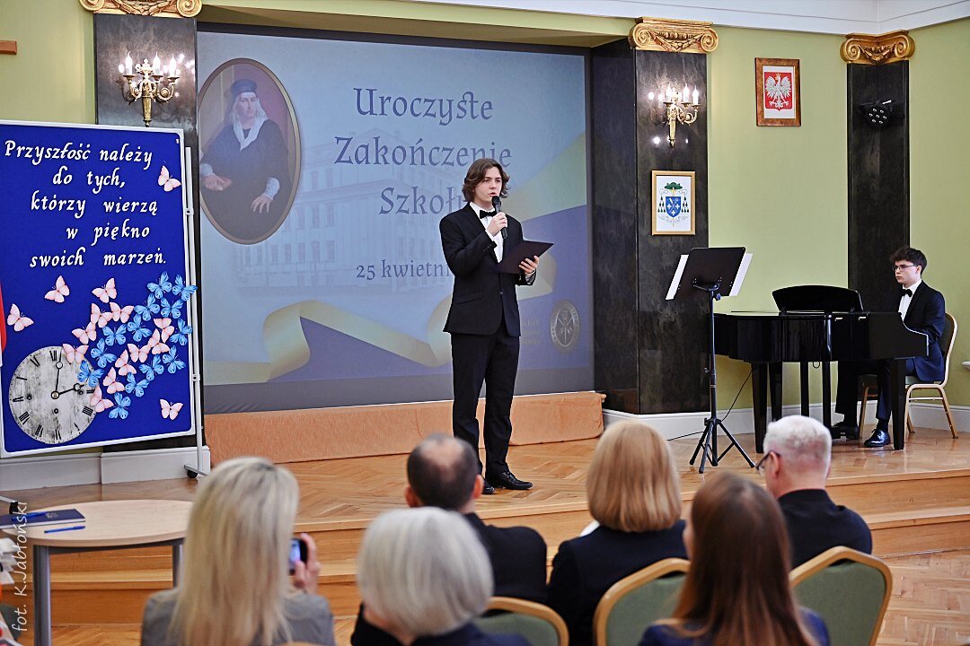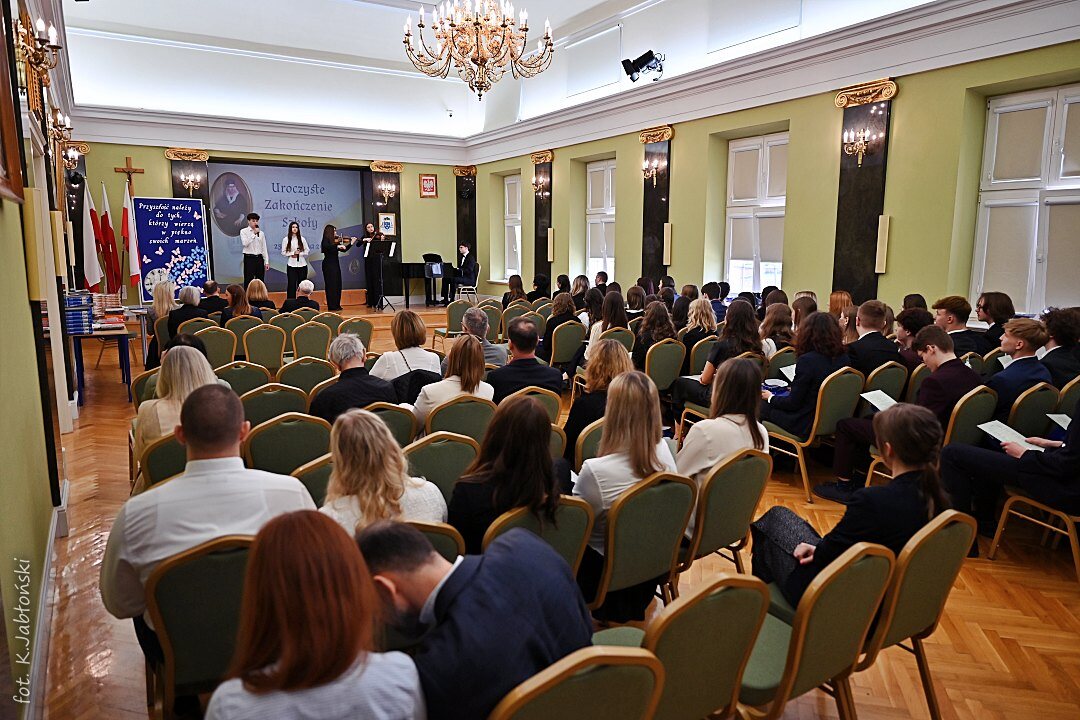 Druga część uroczystości prowadzona przez uczniów klas trzecich LO – Alicję Górecką i Filipa Etynkowskiego – odbyła się na szkolnej auli, gdzie zgromadzeni zaśpiewali wraz z chórem szkolnym prowadzonym przez p. Antoninę Ratajczyk hymn państwowy i szkolny. Następnie wysłuchali krótkiego programu artystycznego w wykonaniu Roksany Kubajki, Remigiusza Morawskiego, Aleksandra Naglera, Łukasza Marcinkowskiego, Gabrieli Szydłowskiej i Gabrieli Kaźmierczak.
