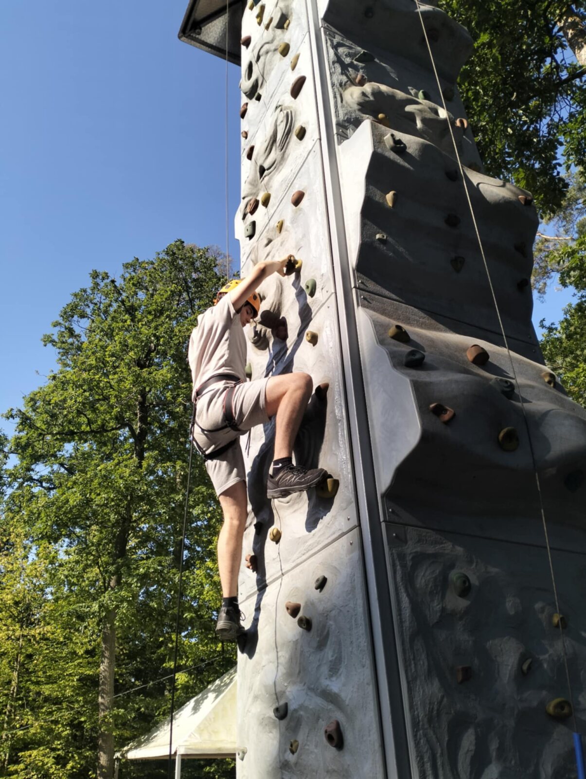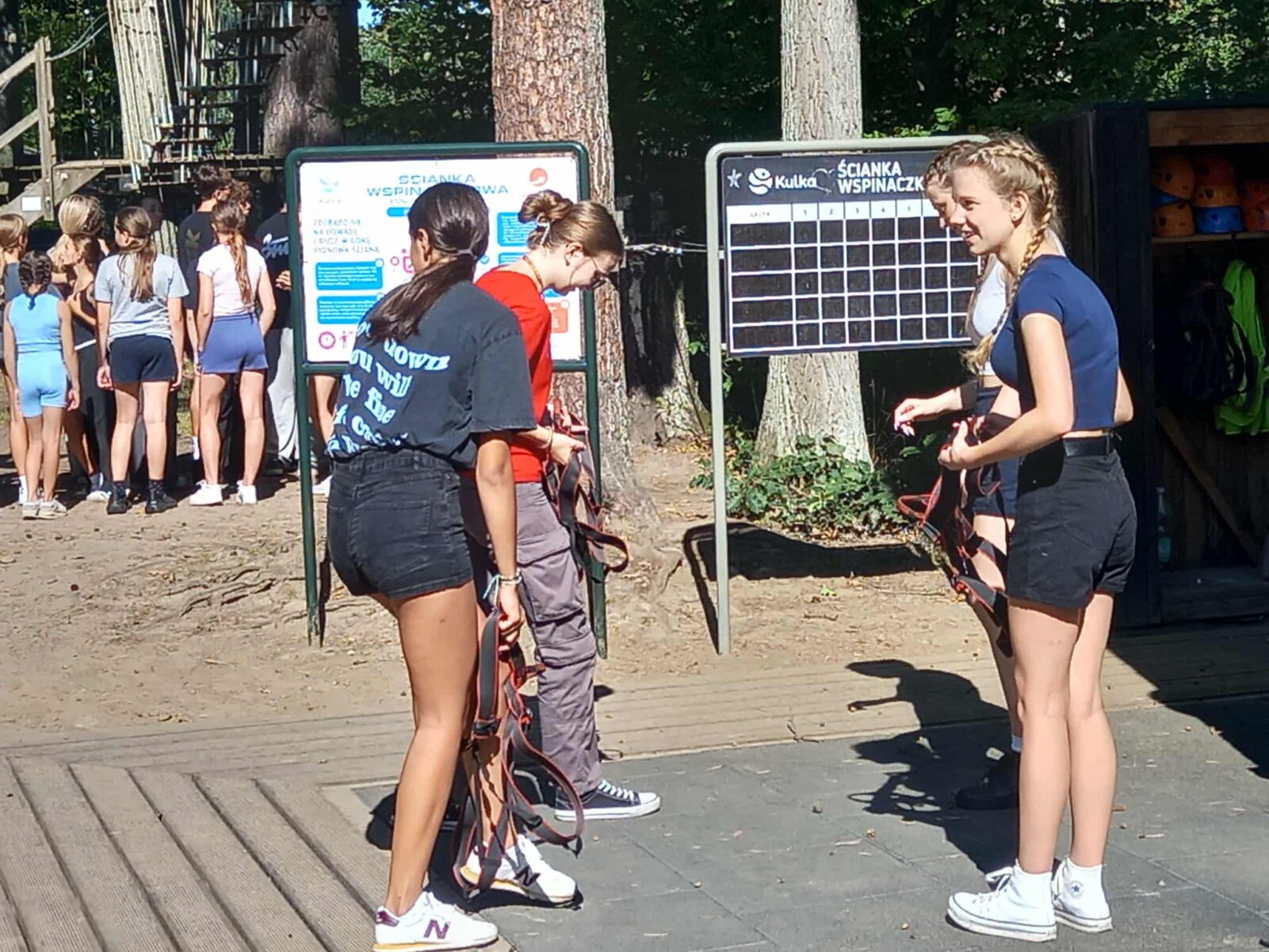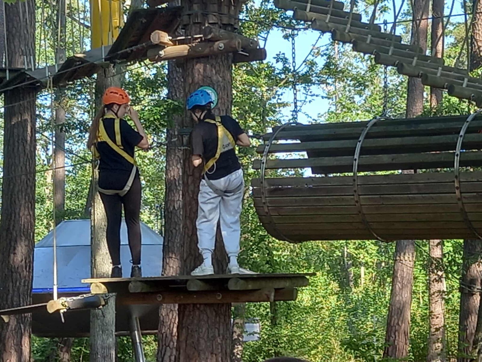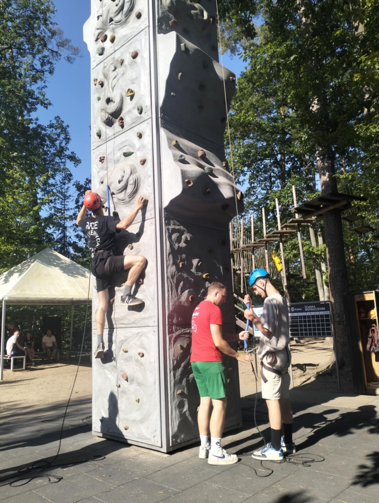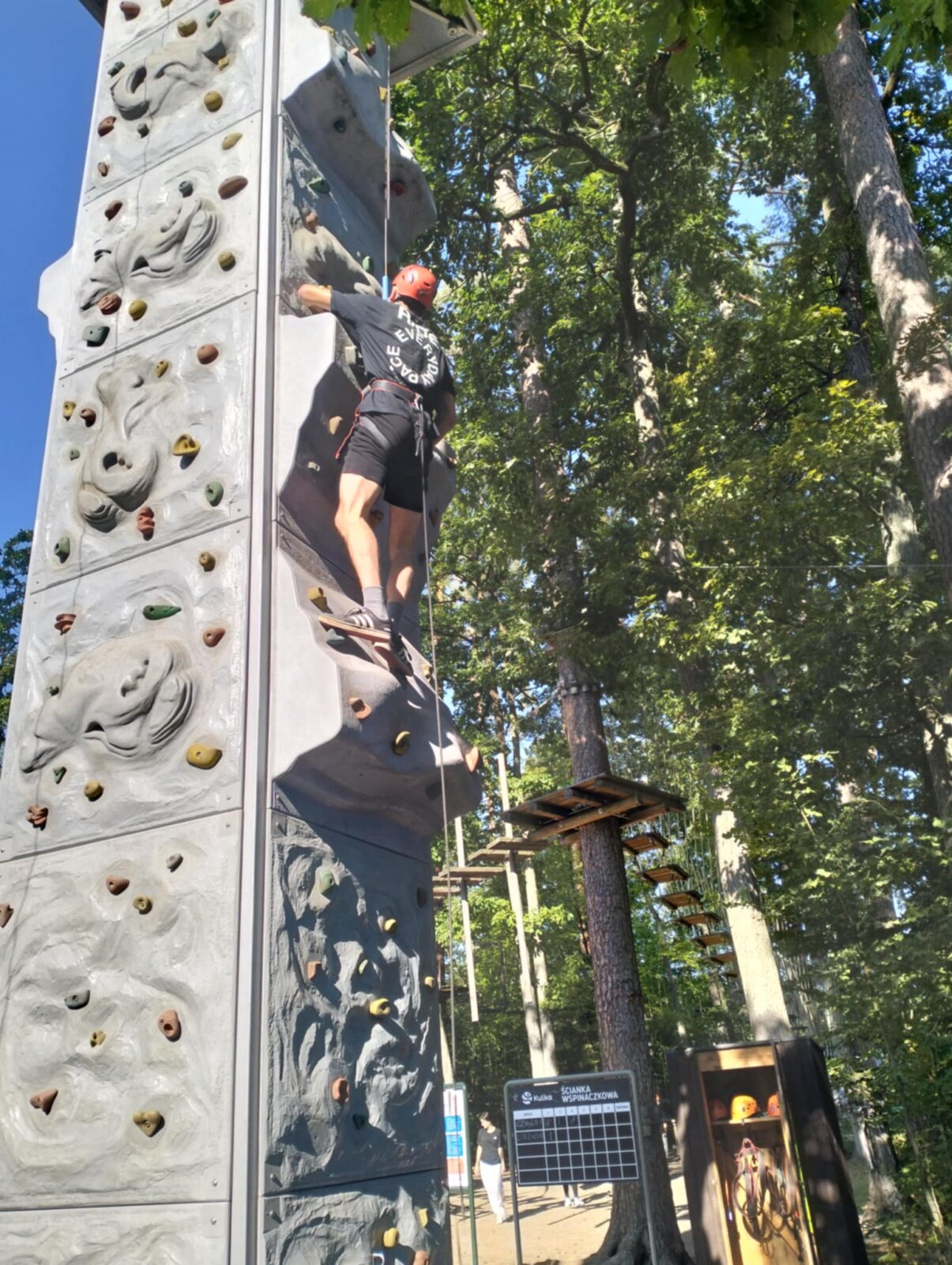 Czwartek rozpoczęliśmy śniadaniem o godz. 8:30 , aby następnie skorzystać z „powietrznych” atrakcji. Pierwsza grupa zmierzyła się z lękiem wysokości oraz wyzwaniami akrobatycznymi podczas wędrówki wśród drzew po parku linowym. Krótkie szkolenie dotyczące zasad bezpieczeństwa, założenie odpowiedniego sprzętu i już pierwsi śmiałkowie przedzierali się przez kolejne elementy toru przeszkód, który sprawdzał ich gibkość, szybkość, zręczność, ale nader wszystko umiejętności takie jak opanowanie oraz analityczne myślenie. Druga grupa osiągała, dosłownie, szczyty swych fizycznych możliwości korzystając z rywalizacji na ściance wspinaczkowej (pod okiem instruktora oraz z zabezpieczeniem nośnym). Wstępne niepowodzenia nie zniechęciły żądnych wyzwań maturzystów do przezwyciężania własnych ograniczeń, które istnieją tylko w naszej głowie. Wsparcie koleżeńskie wyrażane czy to przez pomocne porady, czy też przez element ambicjonalnej rywalizacji, skutecznie zmotywowały kilka osób do ukończenia tej wymagającej fizycznej wytrzymałości, jak i psychicznej wytrwałości, czynności wspinaczkowej.