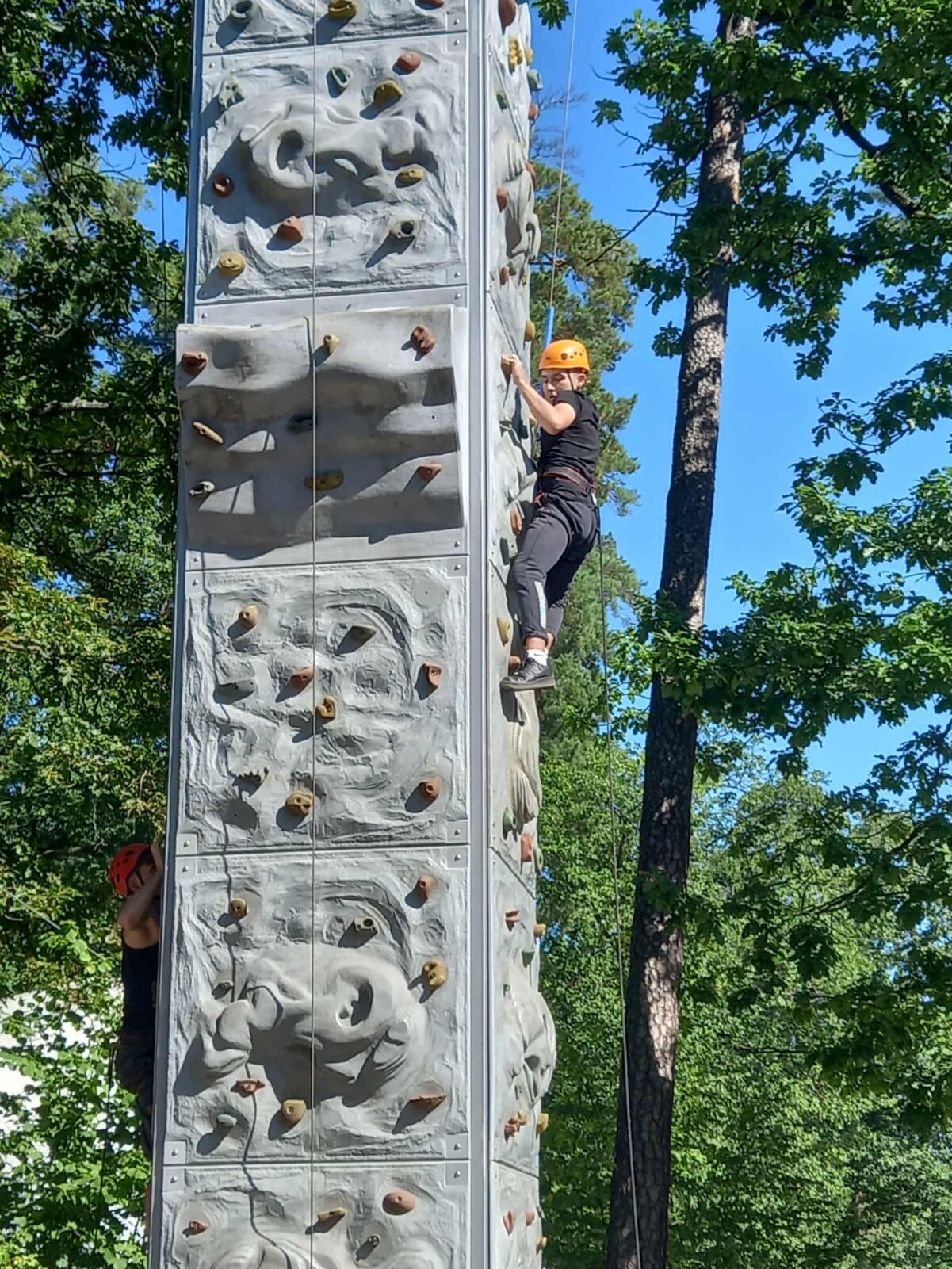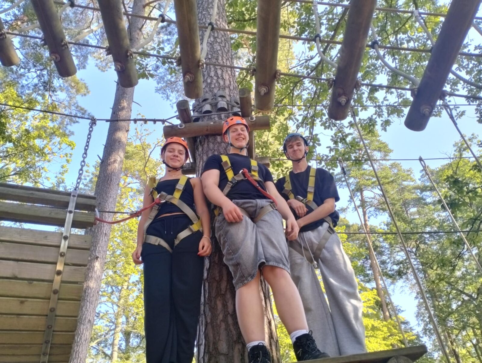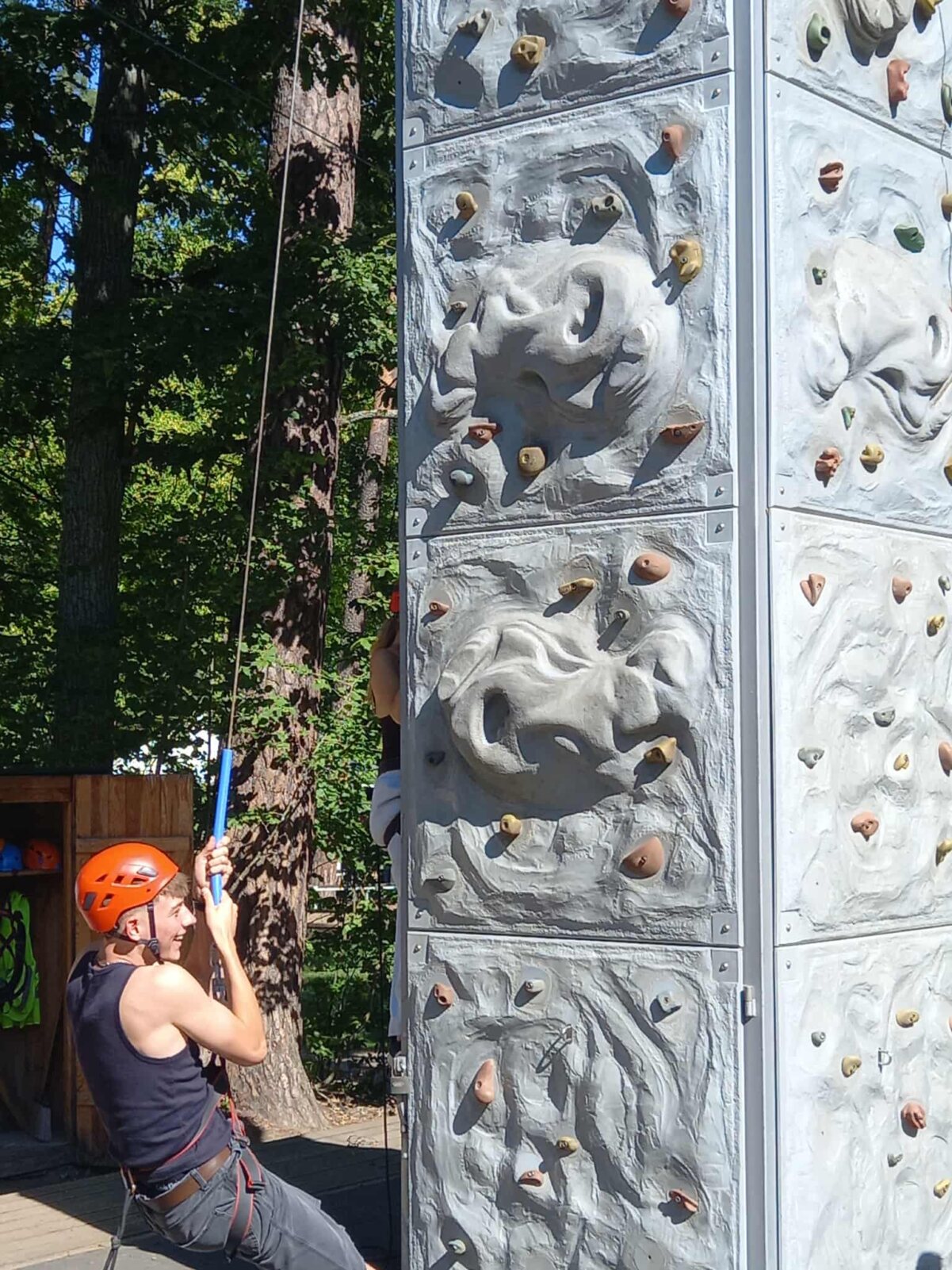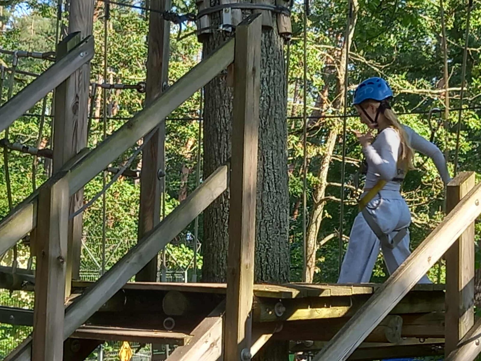 Czwartek rozpoczęliśmy śniadaniem o godz. 8:30 , aby następnie skorzystać z „powietrznych” atrakcji. Pierwsza grupa zmierzyła się z lękiem wysokości oraz wyzwaniami akrobatycznymi podczas wędrówki wśród drzew po parku linowym. Krótkie szkolenie dotyczące zasad bezpieczeństwa, założenie odpowiedniego sprzętu i już pierwsi śmiałkowie przedzierali się przez kolejne elementy toru przeszkód, który sprawdzał ich gibkość, szybkość, zręczność, ale nader wszystko umiejętności takie jak opanowanie oraz analityczne myślenie. Druga grupa osiągała, dosłownie, szczyty swych fizycznych możliwości korzystając z rywalizacji na ściance wspinaczkowej (pod okiem instruktora oraz z zabezpieczeniem nośnym). Wstępne niepowodzenia nie zniechęciły żądnych wyzwań maturzystów do przezwyciężania własnych ograniczeń, które istnieją tylko w naszej głowie. Wsparcie koleżeńskie wyrażane czy to przez pomocne porady, czy też przez element ambicjonalnej rywalizacji, skutecznie zmotywowały kilka osób do ukończenia tej wymagającej fizycznej wytrzymałości, jak i psychicznej wytrwałości, czynności wspinaczkowej.