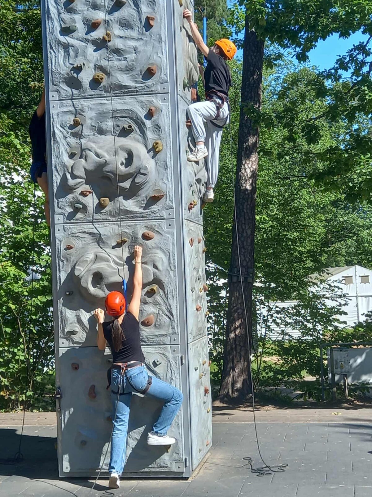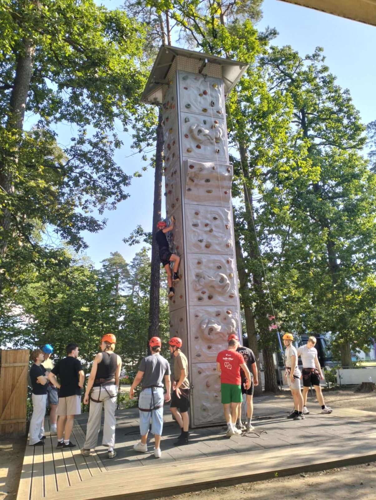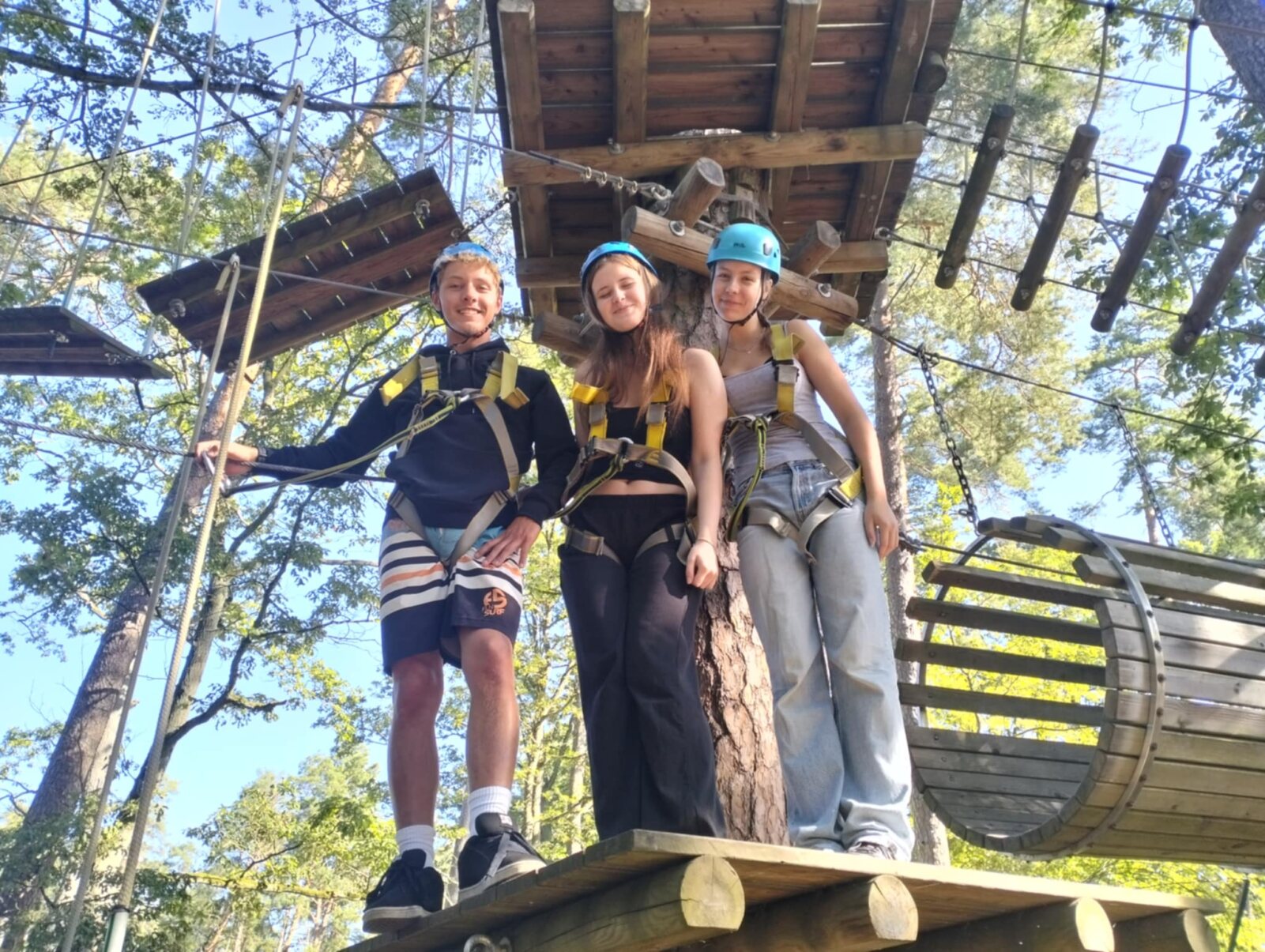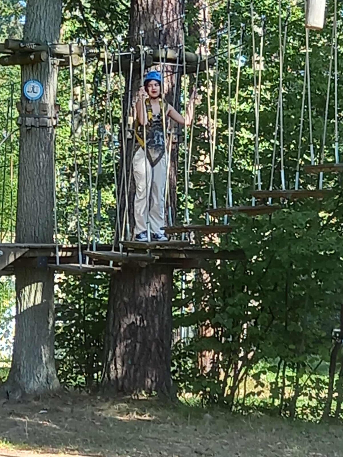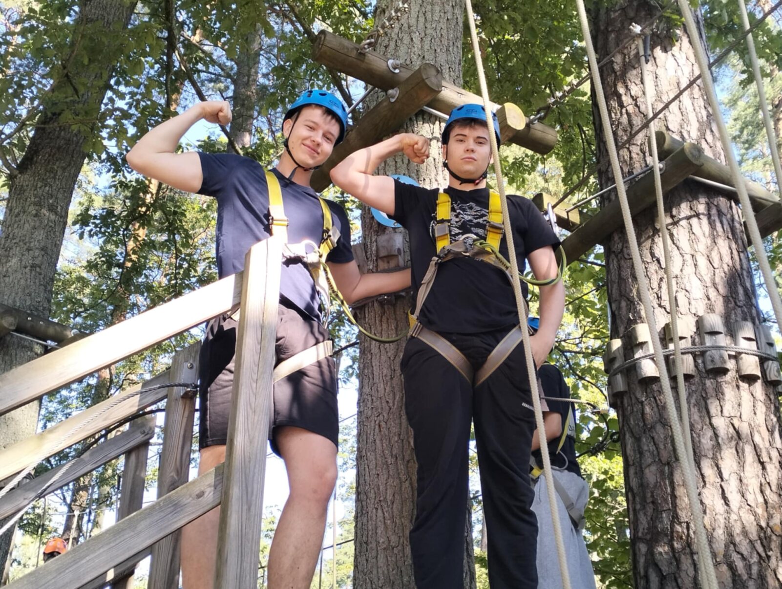 Czwartek rozpoczęliśmy śniadaniem o godz. 8:30 , aby następnie skorzystać z „powietrznych” atrakcji. Pierwsza grupa zmierzyła się z lękiem wysokości oraz wyzwaniami akrobatycznymi podczas wędrówki wśród drzew po parku linowym. Krótkie szkolenie dotyczące zasad bezpieczeństwa, założenie odpowiedniego sprzętu i już pierwsi śmiałkowie przedzierali się przez kolejne elementy toru przeszkód, który sprawdzał ich gibkość, szybkość, zręczność, ale nader wszystko umiejętności takie jak opanowanie oraz analityczne myślenie. Druga grupa osiągała, dosłownie, szczyty swych fizycznych możliwości korzystając z rywalizacji na ściance wspinaczkowej (pod okiem instruktora oraz z zabezpieczeniem nośnym). Wstępne niepowodzenia nie zniechęciły żądnych wyzwań maturzystów do przezwyciężania własnych ograniczeń, które istnieją tylko w naszej głowie. Wsparcie koleżeńskie wyrażane czy to przez pomocne porady, czy też przez element ambicjonalnej rywalizacji, skutecznie zmotywowały kilka osób do ukończenia tej wymagającej fizycznej wytrzymałości, jak i psychicznej wytrwałości, czynności wspinaczkowej.