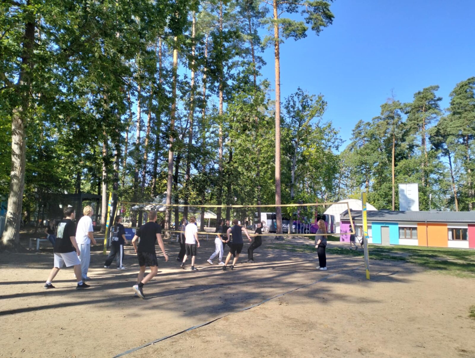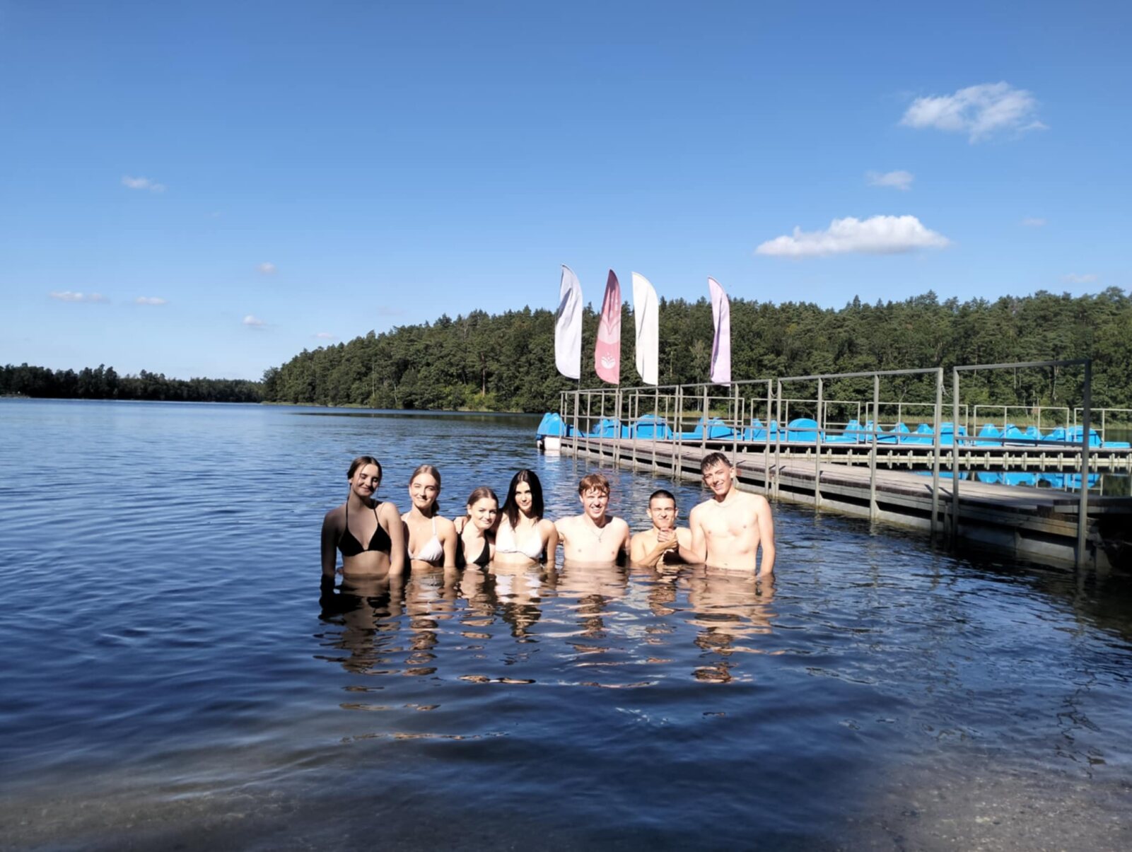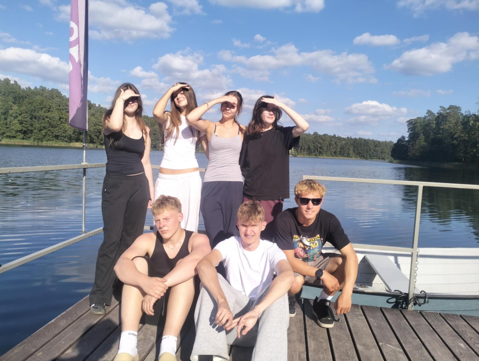 Wyjazd rozpoczął się w środę od zbiórki pod szkołą o godz. 8:30. Po zapakowaniu walizek, sprawdzeniu listy obecności oraz zajęciu miejsc w autokarze, równo o godz. 9:00 ruszyliśmy w stronę Mazur, które miały zagwarantować nam ostatni relaksujący oddech lata w pięknych, słonecznych okolicznościach pogodowych. Kilka godzin drogi z dwoma postojami upłynęło w mgnieniu oka, choć niektórzy musieli odespać nieprzespaną z nadmiaru emocji noc, i krótko po godz. 13:30 dotarliśmy do celu podróży – kompleksu rekreacyjnego skrytego z dala od zakłóceń transportowych oraz komunikacji, w głębi sosnowego lasu oraz tuż obok urokliwego jeziora Łęsk. Po zakwaterowaniu, udaliśmy się wspólnie na obiad na stołówce, aby przygotować się na czekające na nas wyzwania.