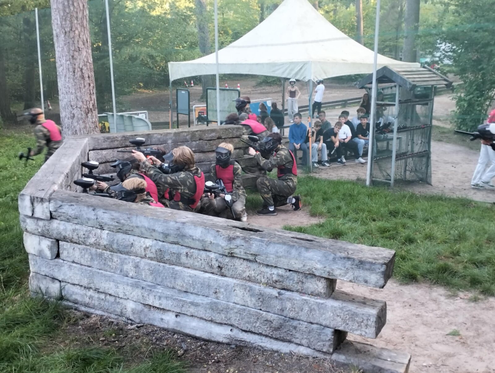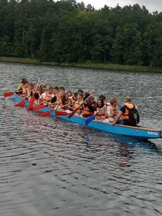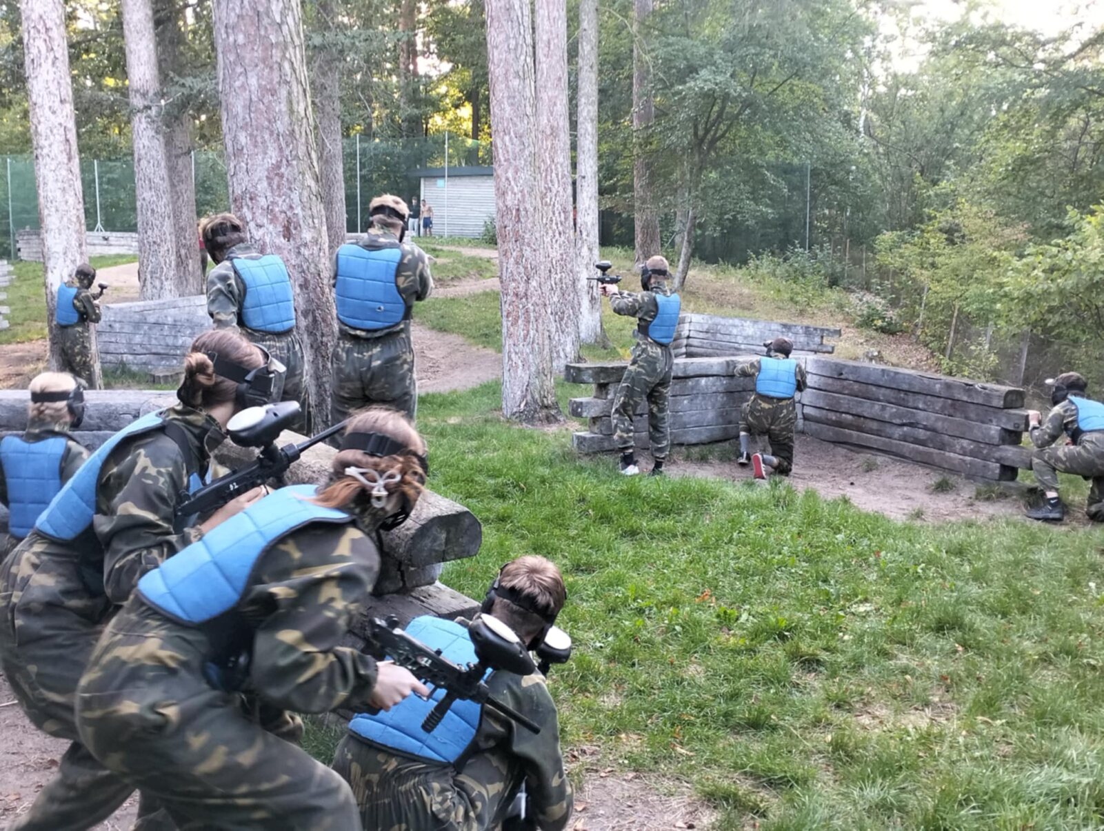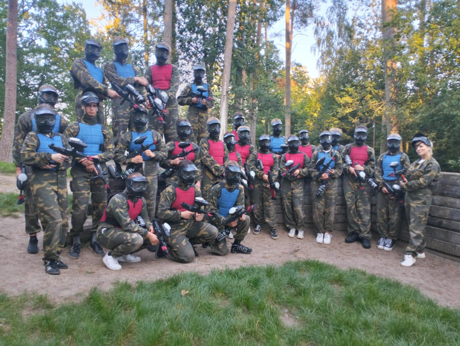 Kolejnym wyzwaniem była ponowna wizyta na jeziorze w parach, gdzie uczniowie musieli nabyć umiejętności poprawnego manewrowania, aby skorzystać z uroku spływu kajakowego. Choć start nie okazał się przysłowiową bułką z masłem, już po kilku machnięciach wiosłem rozpoczęły się radosne wyścigi lub nieco bardziej leniwe dryfy – jedne i drugie w otoczeniu słonecznych refleksów odbijających się od tafli jeziora, orzeźwiających powiewów łagodnego wiatru oraz… niespodziewanych plusków wody serwowanych przez wiosła sąsiadujących załóg. To tutaj kilka osób pokonało swój lęk przed wodą, obawy związane z „wyolbrzymionymi” opowieściami o zatopionych kajakach oraz… słodkie lenistwo (wszak sam kajak niesiony spokojnym nurtem wody do brzegu nie dopłynie). Tuż przed godz. 15 nastąpił czas na zasłużony obiad, po którym przyszedł czas na wyrównanie szkolnych rachunków… rywalizacja na poligonie walk paintballowych! Szkolenie BHP, dobór odpowiedniej rozmiarówki mundurowej, instalacja sprzętu zabezpieczającego korpus oraz szyję i głowę poprzedziły szalony wir taktycznych walk pomiędzy dwiema ekipami żądnych zwycięstwa snajperów. Nie było litości dla rówieśników… a zwłaszcza opiekunów, którzy stali się priorytetowym celem walczących o ostateczny triumf ekip. Zdobywanie kolejnych baz przychodziło z takim trudem, iż po zakończeniu rywalizacji ciężko było doczyścić wizjer, a mundury niewiele różniły się od przemoczonych strojów po rywalizacji na kajakach… ale cóż to za trudy w porównaniu ze słodkim smakiem ostatecznego tryumfu 🙂  .