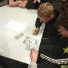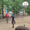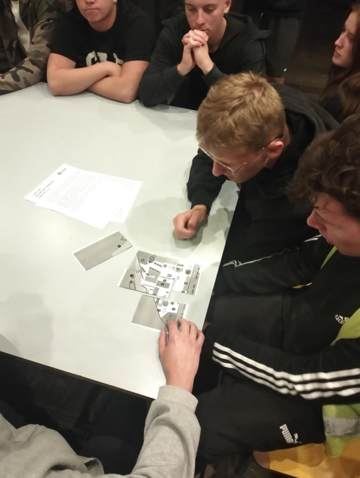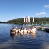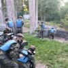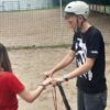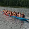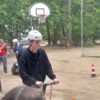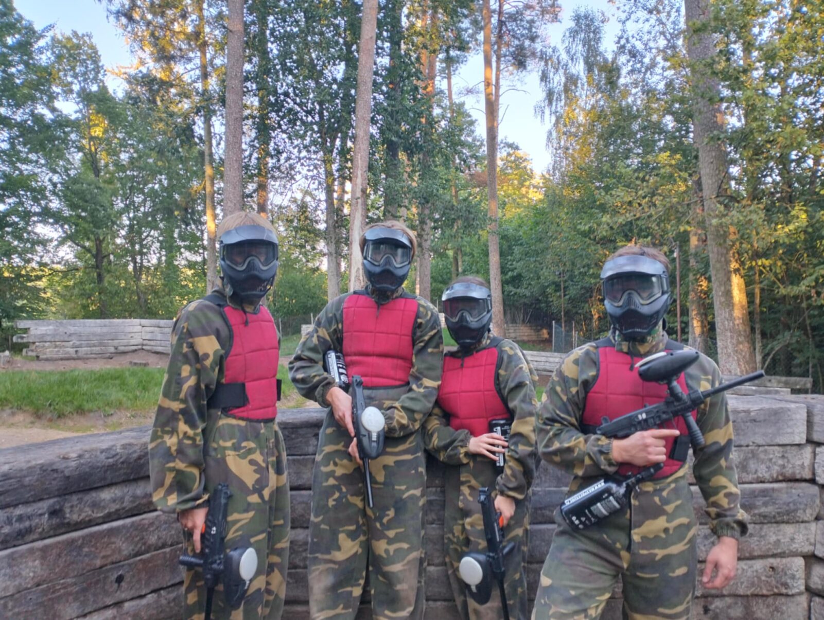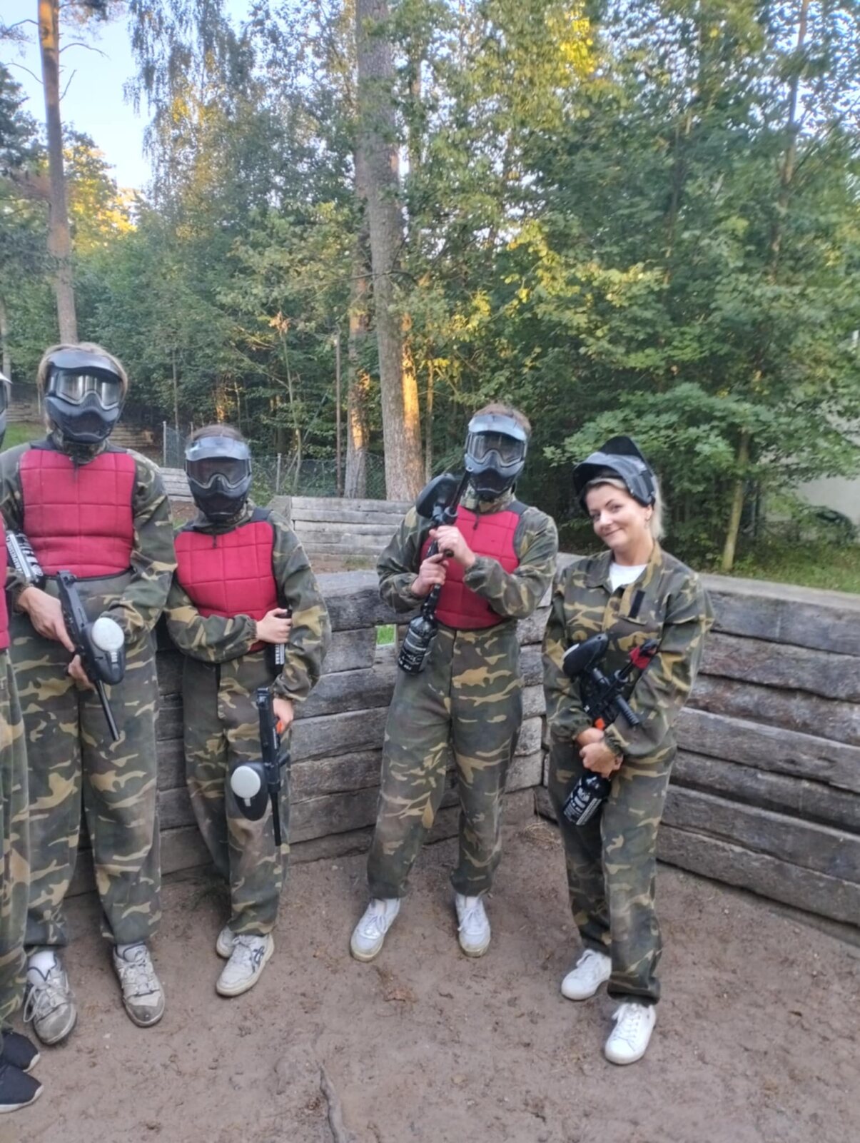 Kolejnym wyzwaniem była ponowna wizyta na jeziorze w parach, gdzie uczniowie musieli nabyć umiejętności poprawnego manewrowania, aby skorzystać z uroku spływu kajakowego. Choć start nie okazał się przysłowiową bułką z masłem, już po kilku machnięciach wiosłem rozpoczęły się radosne wyścigi lub nieco bardziej leniwe dryfy – jedne i drugie w otoczeniu słonecznych refleksów odbijających się od tafli jeziora, orzeźwiających powiewów łagodnego wiatru oraz… niespodziewanych plusków wody serwowanych przez wiosła sąsiadujących załóg. To tutaj kilka osób pokonało swój lęk przed wodą, obawy związane z „wyolbrzymionymi” opowieściami o zatopionych kajakach oraz… słodkie lenistwo (wszak sam kajak niesiony spokojnym nurtem wody do brzegu nie dopłynie). Tuż przed godz. 15 nastąpił czas na zasłużony obiad, po którym przyszedł czas na wyrównanie szkolnych rachunków… rywalizacja na poligonie walk paintballowych! Szkolenie BHP, dobór odpowiedniej rozmiarówki mundurowej, instalacja sprzętu zabezpieczającego korpus oraz szyję i głowę poprzedziły szalony wir taktycznych walk pomiędzy dwiema ekipami żądnych zwycięstwa snajperów. Nie było litości dla rówieśników… a zwłaszcza opiekunów, którzy stali się priorytetowym celem walczących o ostateczny triumf ekip. Zdobywanie kolejnych baz przychodziło z takim trudem, iż po zakończeniu rywalizacji ciężko było doczyścić wizjer, a mundury niewiele różniły się od przemoczonych strojów po rywalizacji na kajakach… ale cóż to za trudy w porównaniu ze słodkim smakiem ostatecznego tryumfu 🙂  .