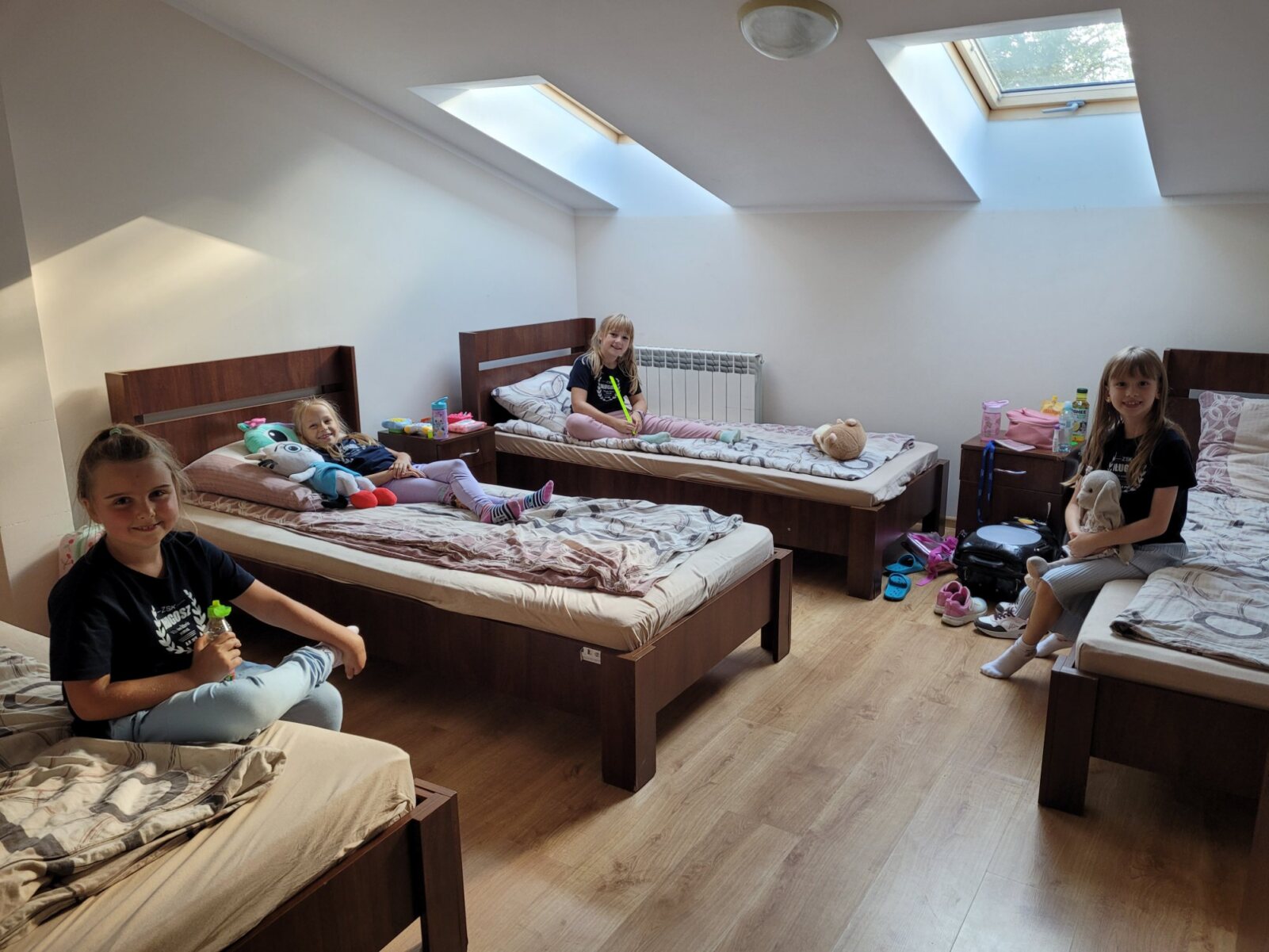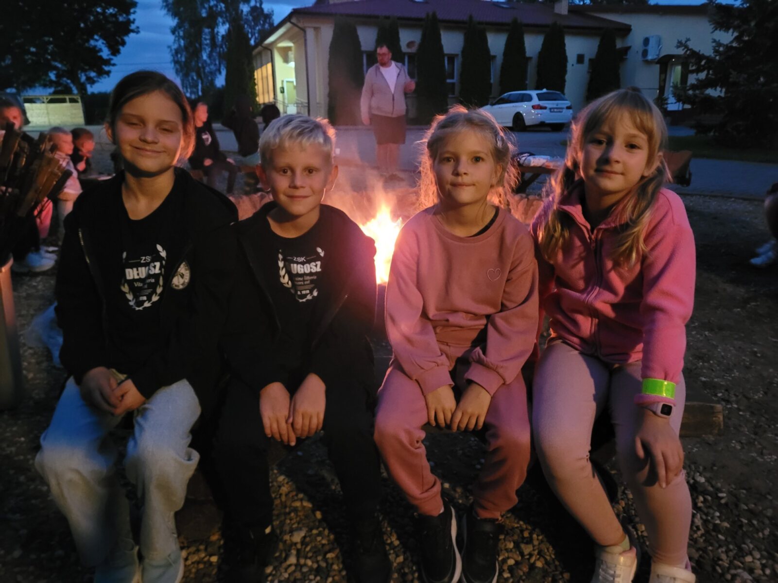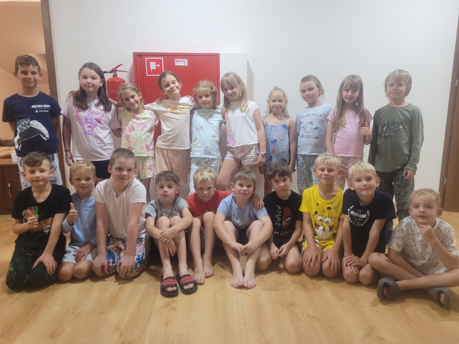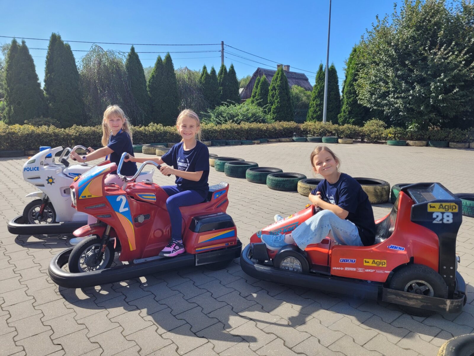 Już od pierwszych chwil na miejscu dzieci były pełne entuzjazmu i radości. Czekało na nie mnóstwo różnorodnych aktywności – jedną z największych atrakcji były emocjonujące przejażdżki na gokartach, które dostarczyły dzieciom wielu pozytywnych wrażeń. Nie zabrakło także czasu na swobodną zabawę na placu zabaw, który szybko stał się miejscem wspólnego śmiechu i integracji. Podczas wycieczki dzieci miały również okazję zwiedzić urocze mini zoo, gdzie z bliska mogły przyjrzeć się różnym zwierzętom, co wzbudziło w nich dużo ciekawości i zachwytu. Dużym przeżyciem była również przejażdżka kolorową kolejką po okolicy, która pozwoliła uczestnikom lepiej poznać piękne otoczenie ośrodka. Wieczorem wszyscy spotkali się przy ognisku, gdzie w ciepłej i radosnej atmosferze pieczono kiełbaski, dzielono się wrażeniami z dnia i wspólnie śpiewano piosenki. Po pełnym wrażeń dniu dzieci wzięły udział w wesołym „piżama party”, które było doskonałym zwieńczeniem dnia pełnego zabawy i śmiechu. Nie zabrakło również wspólnych posiłków, podczas których dzieci mogły odpocząć i spędzić czas razem przy stole, a także gier zespołowych – zwłaszcza meczu piłki nożnej, który wywołał wiele sportowych emocji. Drugiego dnia odbyła się wycieczka do pobliskiego lasu, podczas której dzieci mogły posłuchać ciekawostek o przyrodzie i cieszyć się spacerem na świeżym powietrzu.