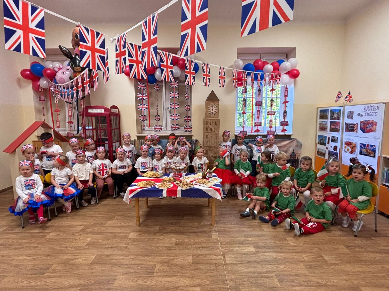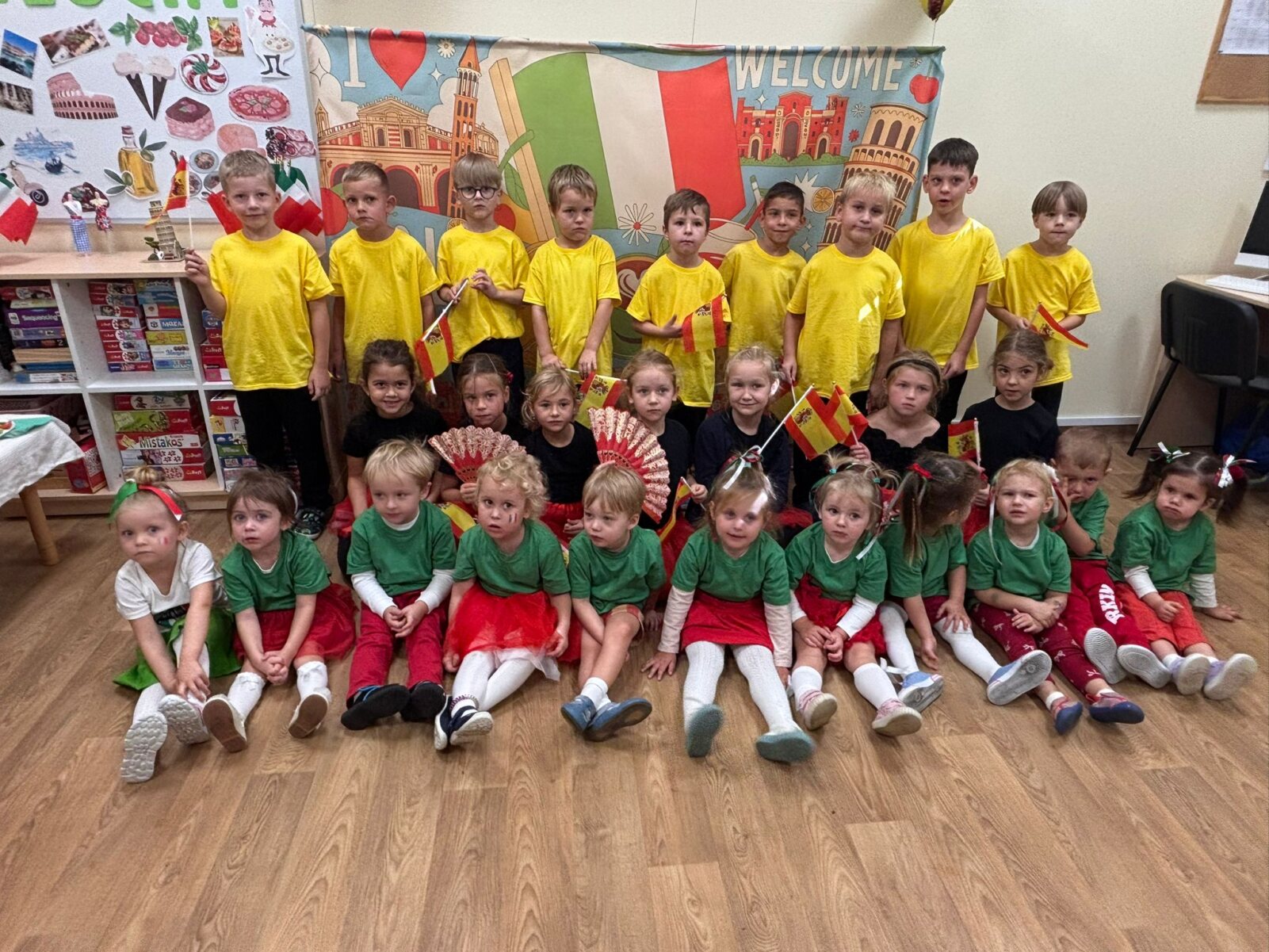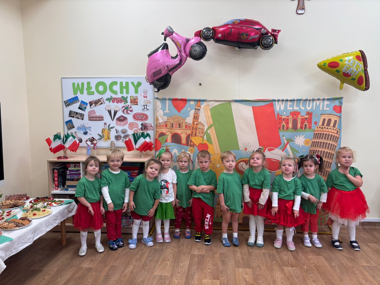 Dziś w naszym przedszkolu świętowaliśmy Dzień Języków Obcych. Każda grupa przygotowała wyjątkowe wystąpienie: trzylatki przeniosły nas do słonecznych Włoch, czterolatki zaprezentowały Wielką Brytanię, pięciolatki przybliżyły Francję, sześciolatki „A” przedstawiły Czechy, a sześciolatki „B” Hiszpanię. Nie zabrakło regionalnych przekąsek, ciekawostek i dużej dawki wiedzy o kulturze oraz tradycjach różnych krajów. Na zakończenie każda z grup zaśpiewała znaną piosenkę „Panie Janie” w języku państwa, które reprezentowała. Serdecznie dziękujemy Pizzerii Venezia z Włocławka za pyszną pizzę oraz Rodzicom za ogromne zaangażowanie i wsparcie w przygotowaniu tego wyjątkowego przedsięwzięcia. To był dzień pełen radości, smaków i nauki!