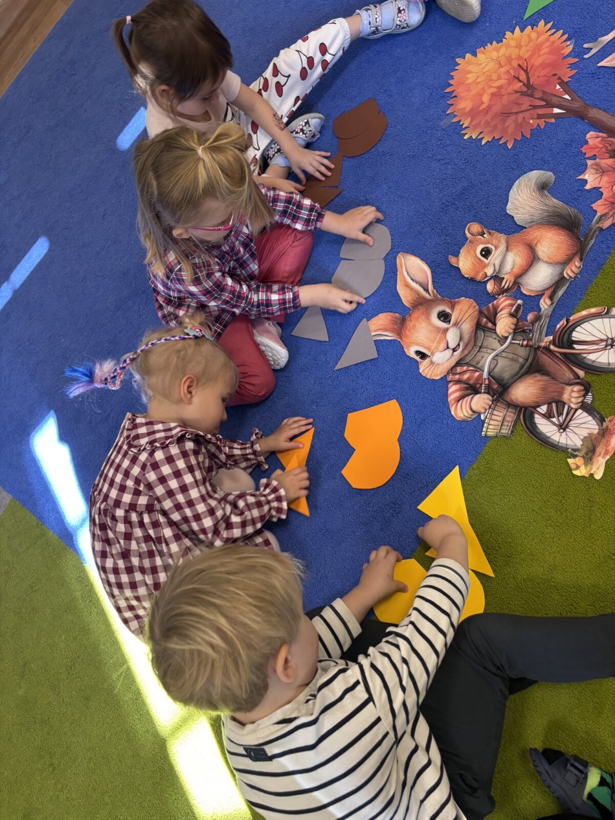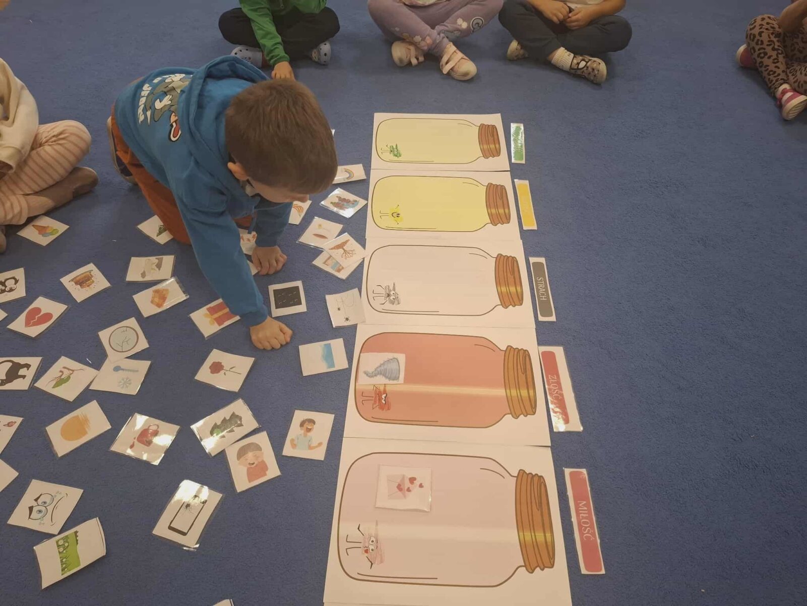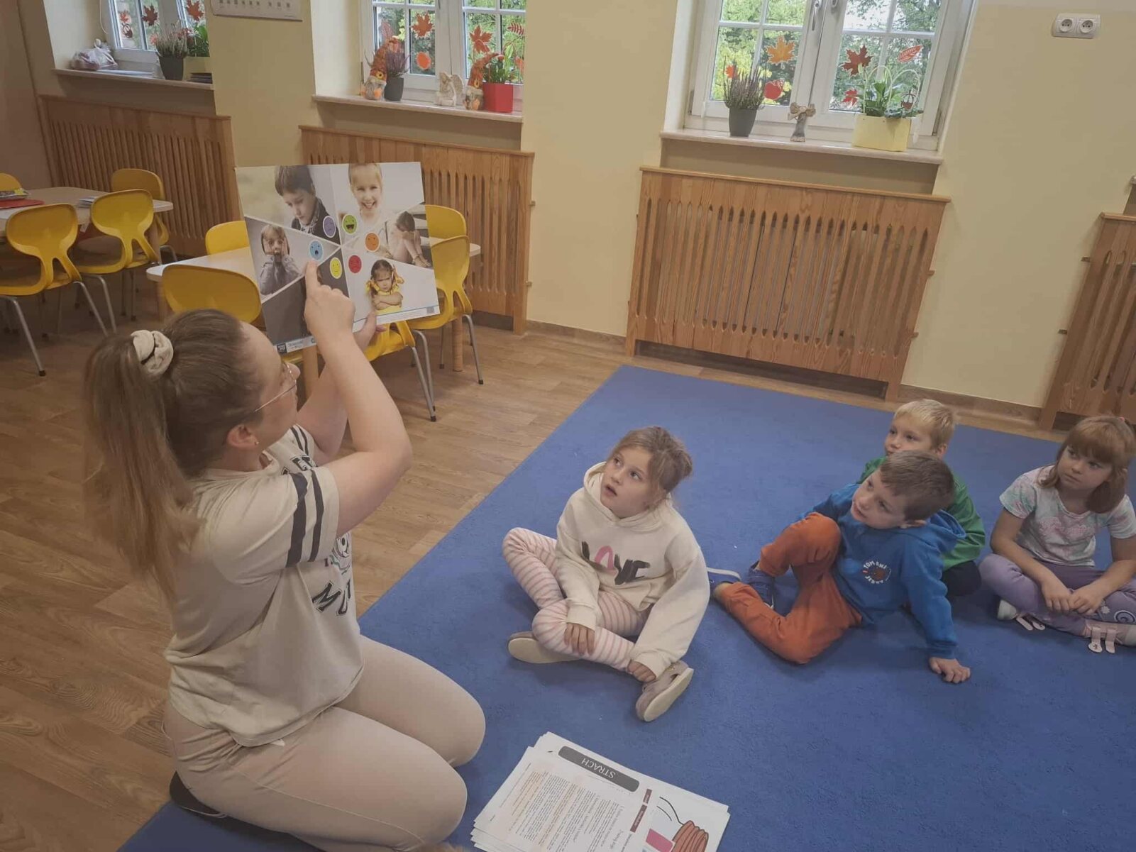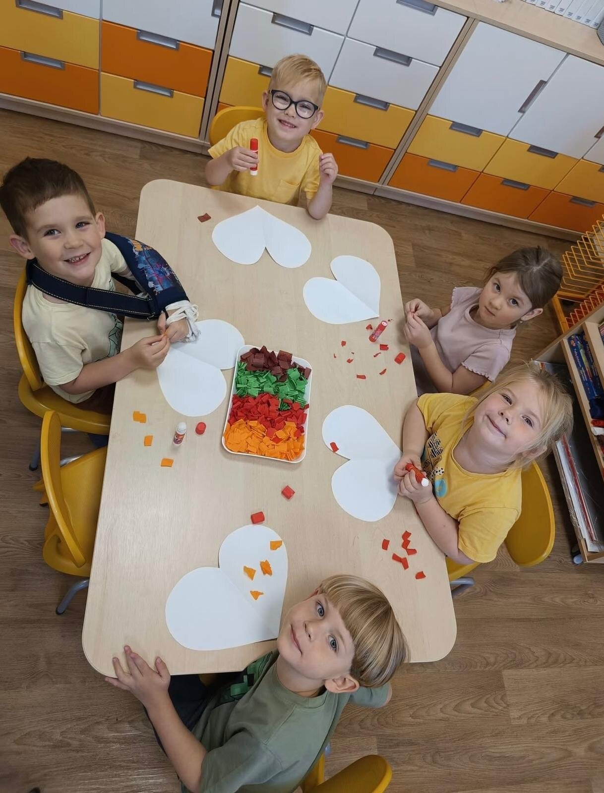 Głównym aspektem zajęć była pogadanka nauczyciela z dziećmi o tym, jak czujemy się w grupie, co może nas skrzywdzić oraz jak my sami wpływamy na innych swoim zachowaniem, w oparciu o wysłuchane opowiadanie „Serduszko z listków”.