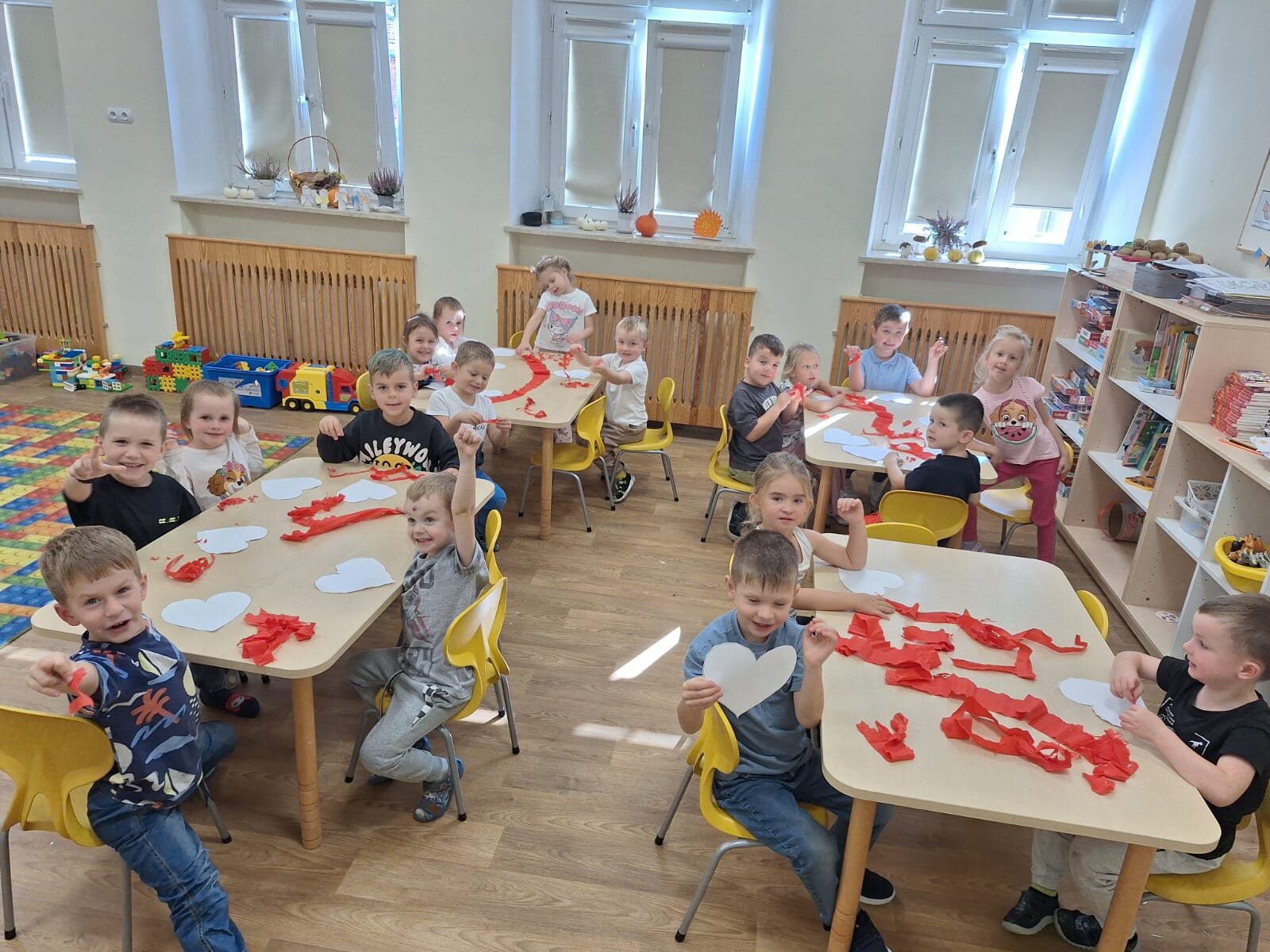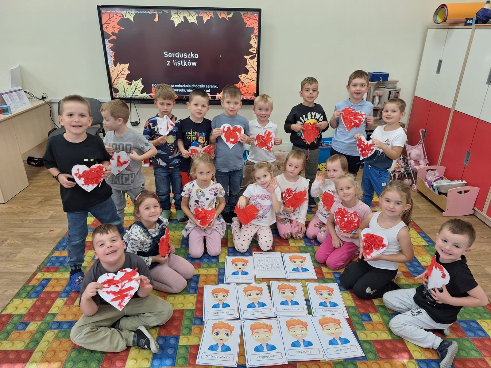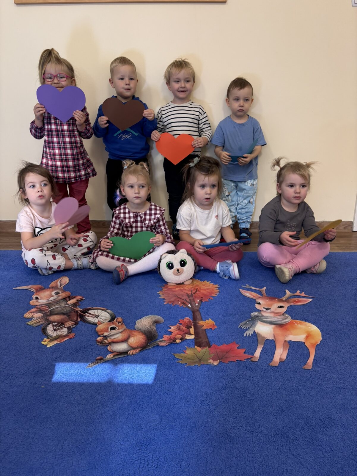 Przedszkolaki z każdej grupy uczestniczyły w zajęciach, których zadaniem było wspomaganie rozwoju wspierających kompetencji społecznych, takich jak wrażliwość na zachowania innych, umiejętność określania zachowań życzliwych i nieżyczliwych oraz pomoc dzieciom reagować adekwatnie w trudnych sytuacjach i budować życzliwy, wspierający klimat w grupie na podstawie scenariusza „Metamorfoza serduszka”.