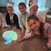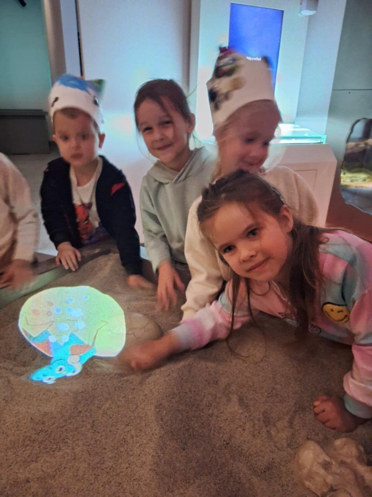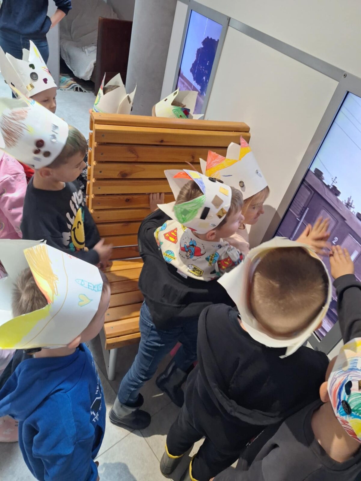 Kolejnym etapem była wystawa pt” Wehikuł czasu” podczas której, to dzieci mogły przenieść się w odległe czasy. Były świadkami jak wyglądały dawne mieszkania. Mogli przez moment stać małymi archeologami i poszukiwać skamielin, kości dinozaurów, dawnych naczyń . Nasi mali poszukiwacze przygód mogli przenieść się do kużni kowala i na miejski targ. Na zakończenie naszej wspaniałej przygody dzieci w swoich przepięknych koronach, mogły podziwiać wizerunek króla Władysława Łokietka.
