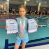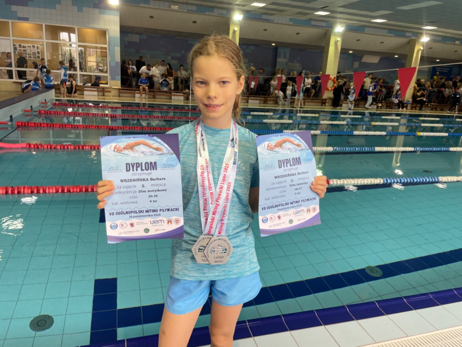Basia Wrzesińska z klasy 4b SP zdobyła dwa medale podczas VII Ogólnopolskiego Mitingu Pływackiego, który odbył się 18 października 2025 roku w Lipnie.