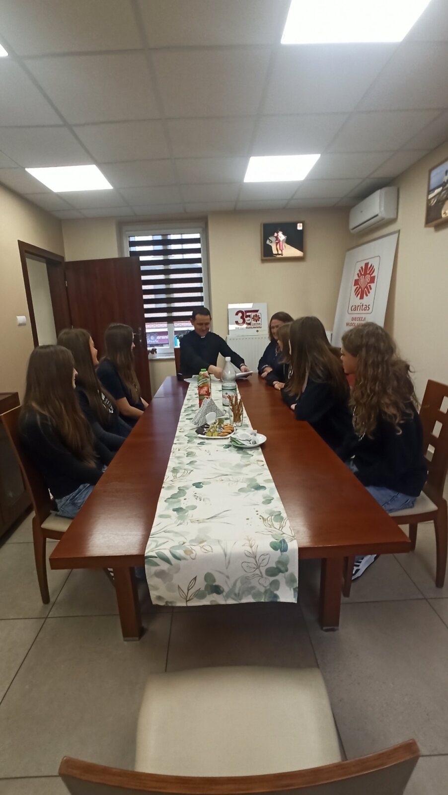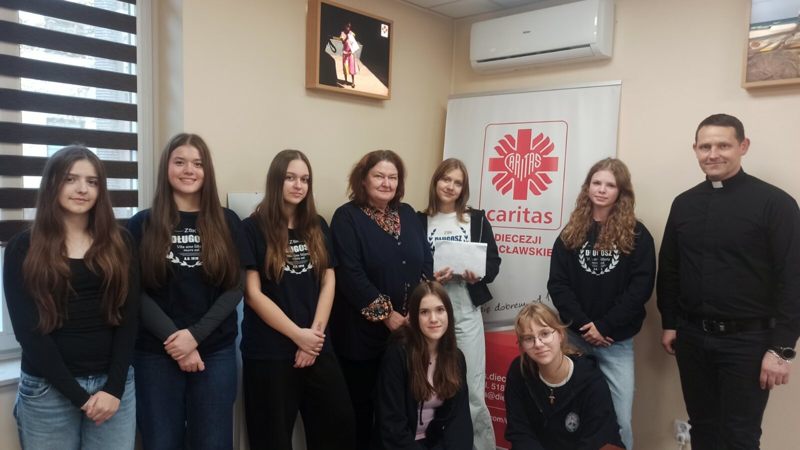 Sytuacja w tym regionie jest bardzo trudna – mieszkańcy zmagają się z brakiem wody pitnej, żywności, lekarstw oraz dostępu do opieki medycznej. Wielu ludzi straciło swoje domy i środki do życia. W obliczu tego cierpienia każda, nawet najmniejsza pomoc, ma ogromne znaczenie. Dzięki ofiarności uczniów, nauczycieli oraz pracowników szkoły udało się zebrać 772 zł, które 21 października br. zostały przekazane Caritas Diecezji Włocławskiej. Podczas spotkania z ks. dr Jackiem Kędzierskim Dyrektorem Caritas Diecezji Włocławskiej, wolontariusze dowiedzieli się, w jaki sposób organizacja niesie pomoc potrzebującym oraz jakie działania realizuje na rzecz osób dotkniętych wojną i ubóstwem. Uczniowie mieli również okazję odwiedzić świetlicę, gdzie rozmawiali o idei wolontariatu i dzielili się swoimi refleksjami na temat pomocy innym. Podczas spotkania zaplanowano także kolejne akcje wolontariackie, które na stałe wpisują się w kalendarz współpracy naszego Szkolnego Koła Wolontariatu z Caritas Diecezji Włocławskiej.