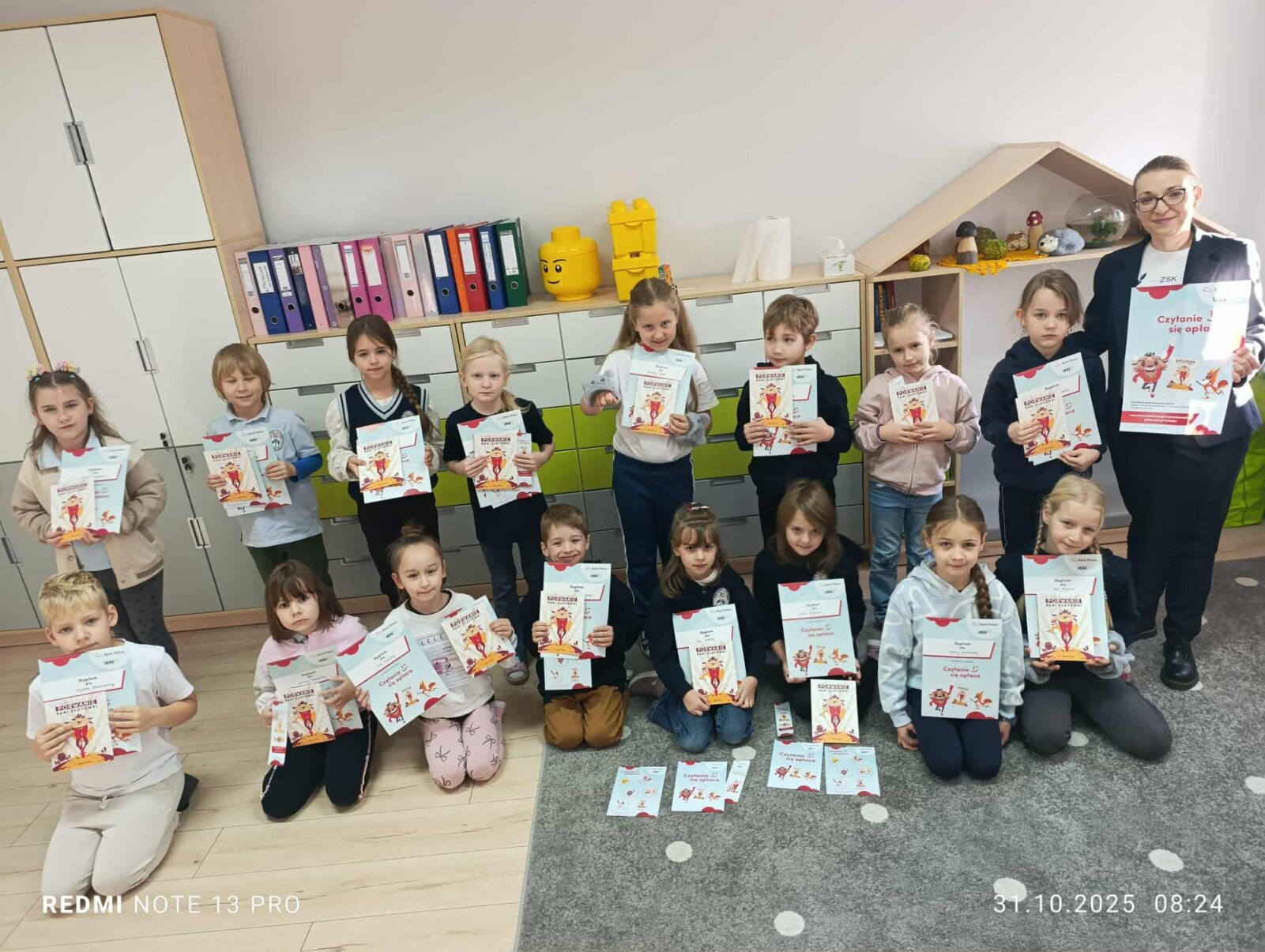 W ramach akcji, 31.10.2025 r., przeprowadzone zostały zajęcia zachęcające dzieci do czytania, pokazujące, że to nie tylko obowiązek, ale i wspaniała podróż, wciągające historie, ciekawi bohaterowie i sposób na spędzenie wolnych chwil. Miejmy nadzieję, że akcja rozbudzi w uczniach miłość do literatury, bo czytanie naprawdę się opłaca.