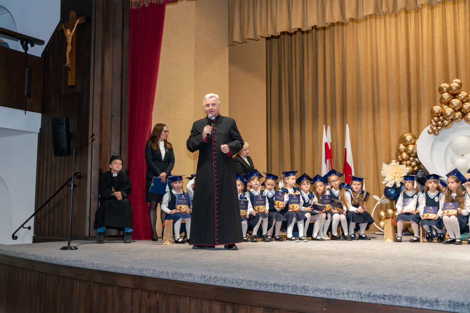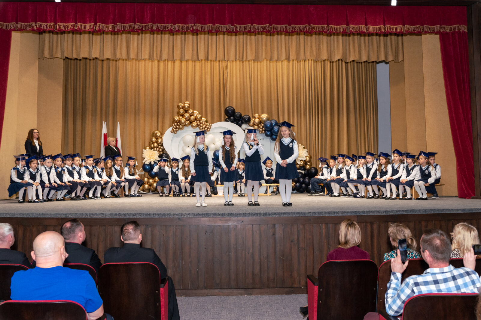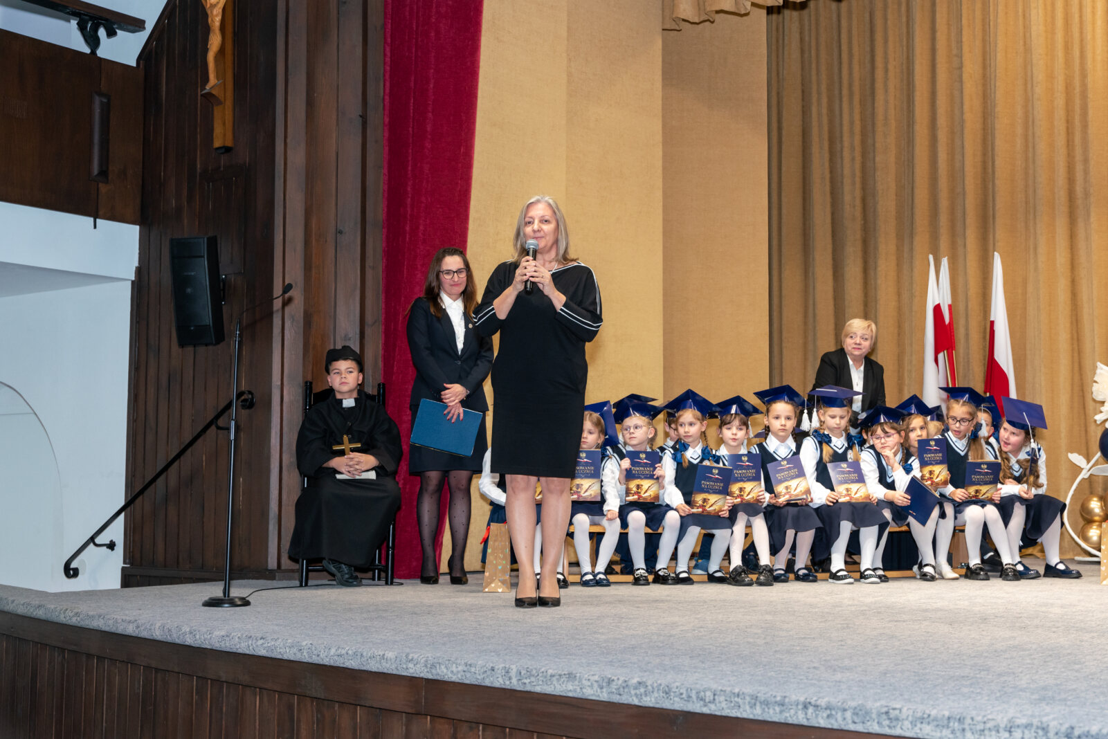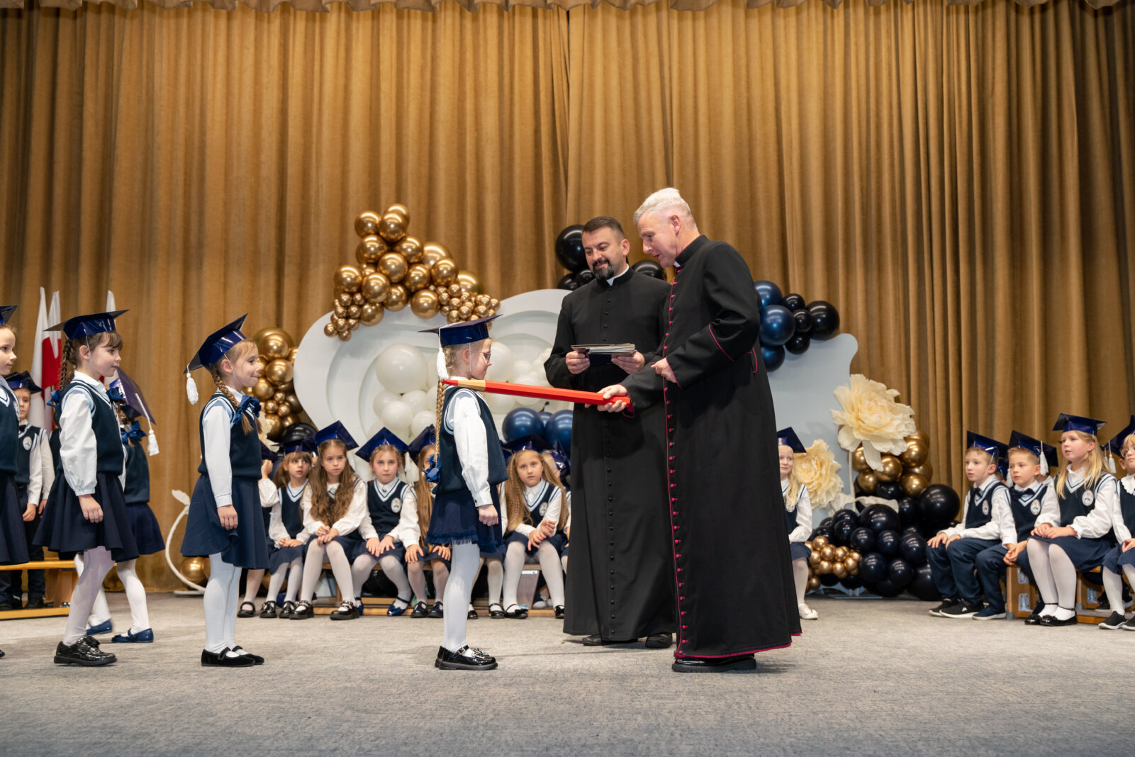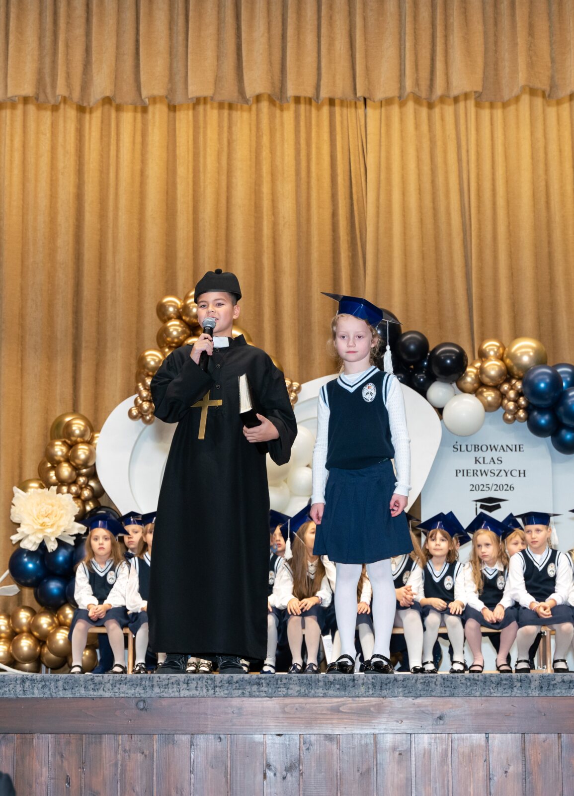 Ciepłe słowa powitania skierowano również do Rodziców, Dziadków, Rodzeństwa i wszystkich Gości, którzy towarzyszyli pierwszoklasistom w tym ważnym dniu. Szczególne życzenia popłynęły do bohaterów uroczystości – naszych najmłodszych uczniów, dla których był to dzień pełen emocji, wzruszeń i radości. W części artystycznej pierwszoklasiści zaprezentowali program poświęcony patronowi szkoły – ks. Janowi Długoszowi. Podczas występu pojawiła się także postać ks. Jana Długosza, w którą z wielkim zaangażowaniem wcielił się Filip Podolski z klasy IV b. Uczniowie przybliżyli życiorys patrona, opowiedzieli o jego zasługach i wartościach, którymi warto się kierować. W swoich wystąpieniach mówili również o tym, jak powinien zachowywać się wzorowy uczeń, przypomnieli o symbolach narodowych Polski, zasadach bezpieczeństwa na drodze oraz o wartości życzliwości i koleżeństwa. Całość uświetniły piękne piosenki i tańce, które wprowadziły wszystkich w radosny, uroczysty nastrój. Kulminacyjnym momentem wydarzenia było złożenie ślubowania przez uczniów klas pierwszych oraz akt pasowania na ucznia Szkoły Podstawowej im. ks. Jana Długosza we Włocławku.