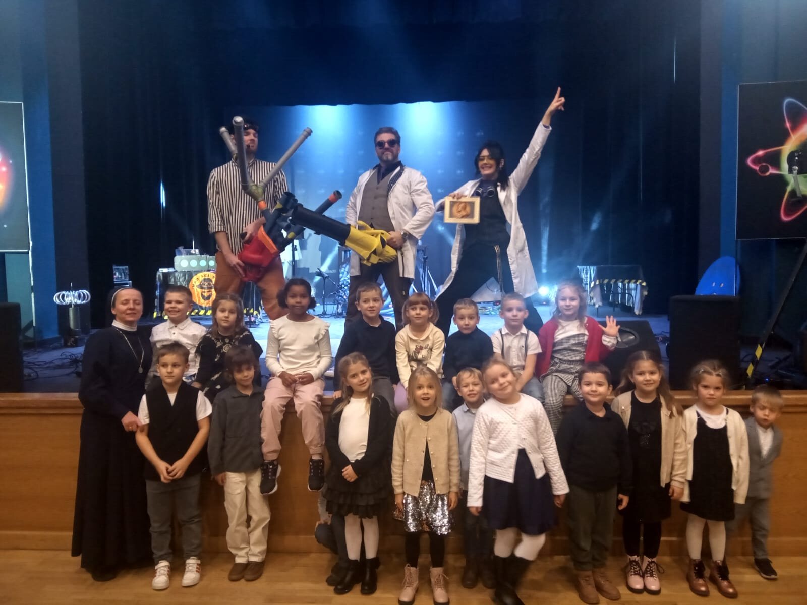 12 listopada 2025 roku dzieci z grupy „Aniołki” wybrały się do Teatru Impresaryjnego im. W. Gniazdowskiego we Włocławku na naukowo-muzyczne show – „Szaleni Naukowcy”. To humorystyczne i barwne widowisko opowiadało o naukowych perypetiach cudownych bohaterów: Człowieka-Robaka, Igreka, Niny oraz Profesora Trauta. „Szaleni Naukowcy” to przedstawienie, które łączy elementy nauki, muzyki oraz widowiskowych eksperymentów chemicznych i fizycznych wykonywanych na żywo przed oczami publiczności. Całość była pełna humoru, co budziło podziw młodych widzów, a jednocześnie rozbudzało ich wyobraźnię i ukazywało naukową wiedzę w praktyce. Podczas widowiska dzieci miały okazję zobaczyć m.in.: Szaloną pianę: bardzo wyrazisty eksperyment z setkami litrów kolorowej piany, Ciekły azot: eksperymenty ilustrujące właściwości ciekłego azotu i innych gazów, w tym mgłę na stole oraz ogromny wybuch azotowy, Cewki Tesli: serie eksperymentów z niezwykle rzadko spotykanymi urządzeniami generującymi wysokiej częstotliwości wyładowania elektryczne (zamek błyskawiczny), Jonizację gazów i ich blask, Przesyłanie energii na odległość oraz zjawisko błyskawicy, Theremin: instrument muzyczny, na którym gra się bez dotyku. Całe show dopełniła muzyka, która tworzyła niezwykłą atmosferę. Rytm i muzyka, towarzyszące pokazom, dodały widowisku energii i sprawiły, że było ono bardzo emocjonujące i widowiskowe. „Szaleni Naukowcy” to wydarzenie, które z pewnością na długo pozostanie w pamięci dzieci.