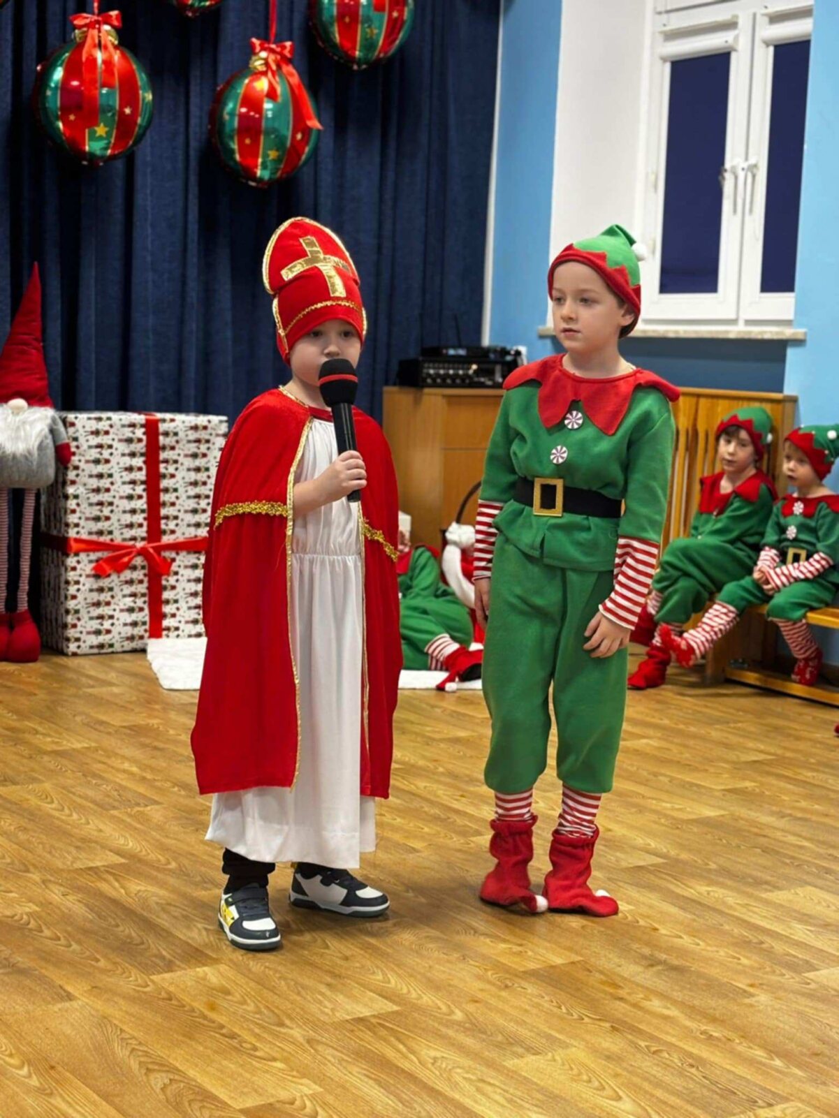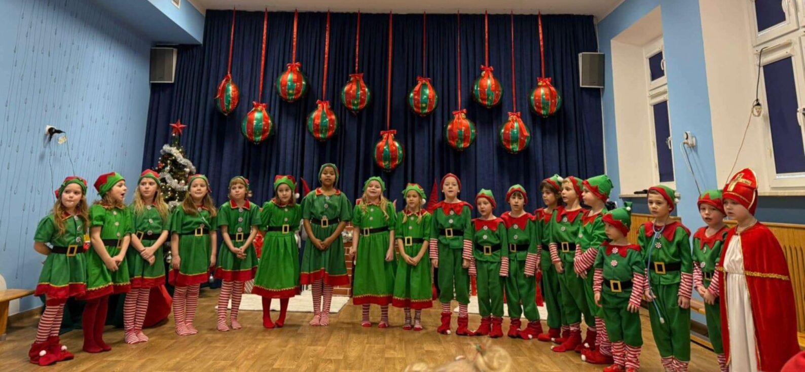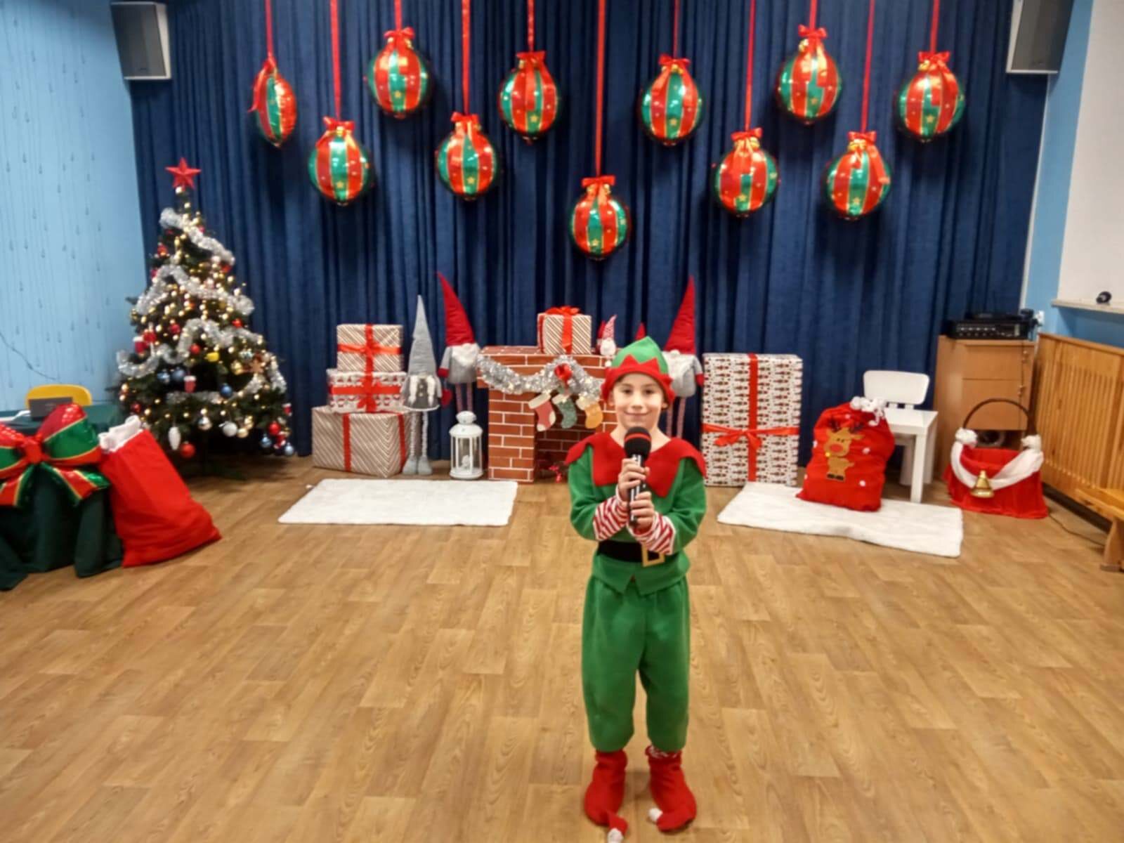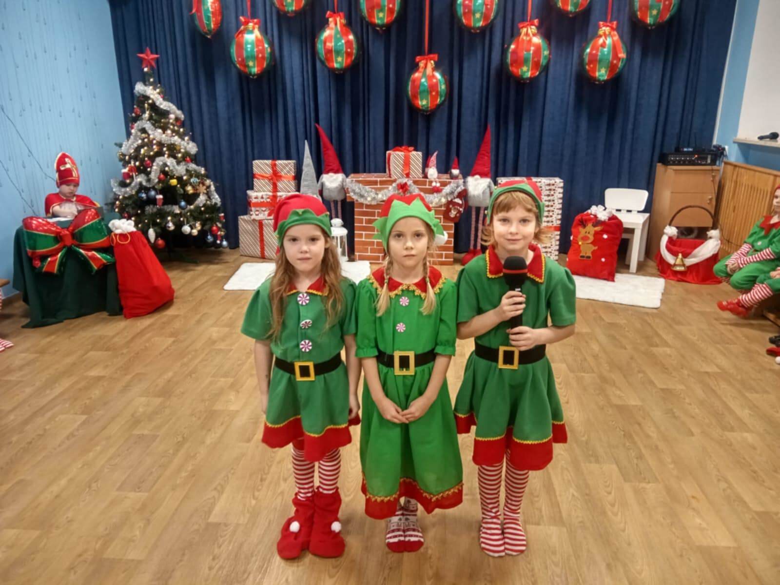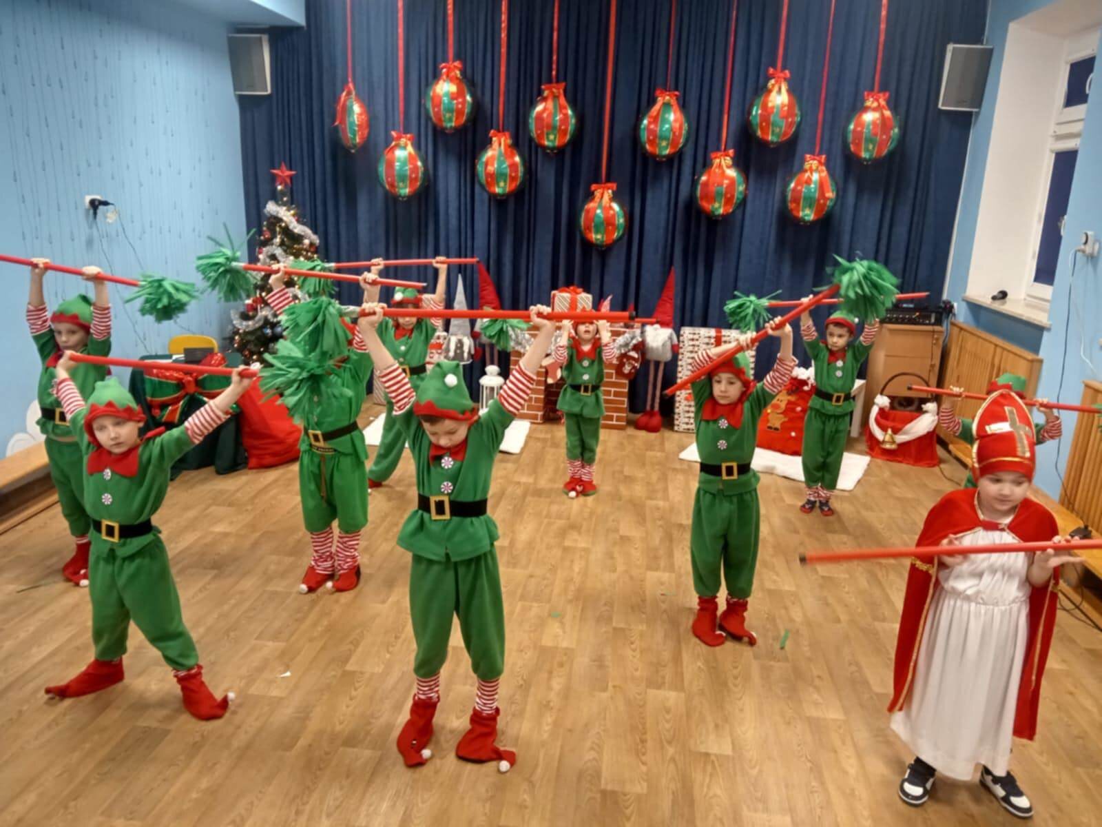 Przedstawienie rozpoczęło się od opowieści o prawdziwym św. biskupie Mikołaju, który słynął z dobroci i hojności, przypominając wszystkim o duchu świąt i pomagających aniołach – elfach, które w tym czasie zamieniły się w pomocników Mikołaja. Pomocnicy ci z wielkim zaangażowaniem pomagali przy pakowaniu prezentów dla dzieci, wprowadzając nas w świąteczną atmosferę.