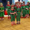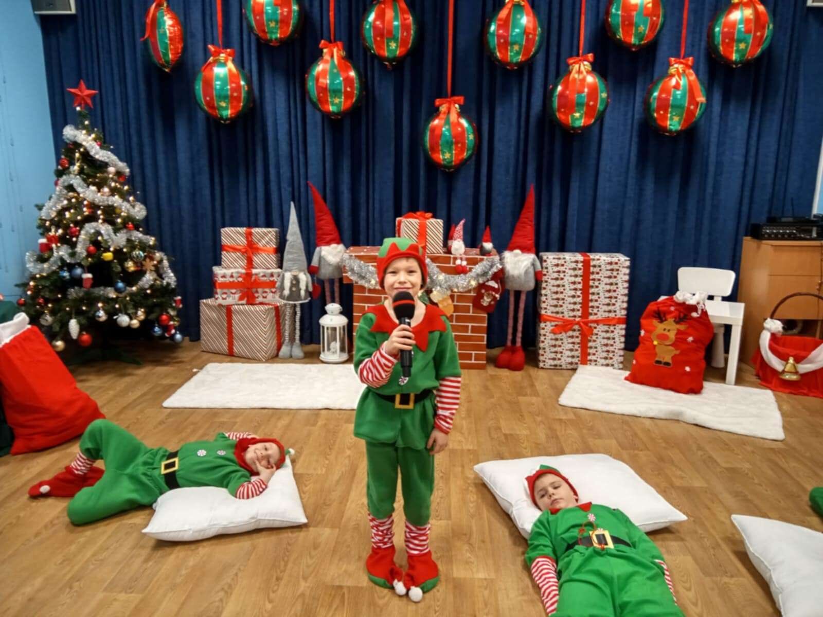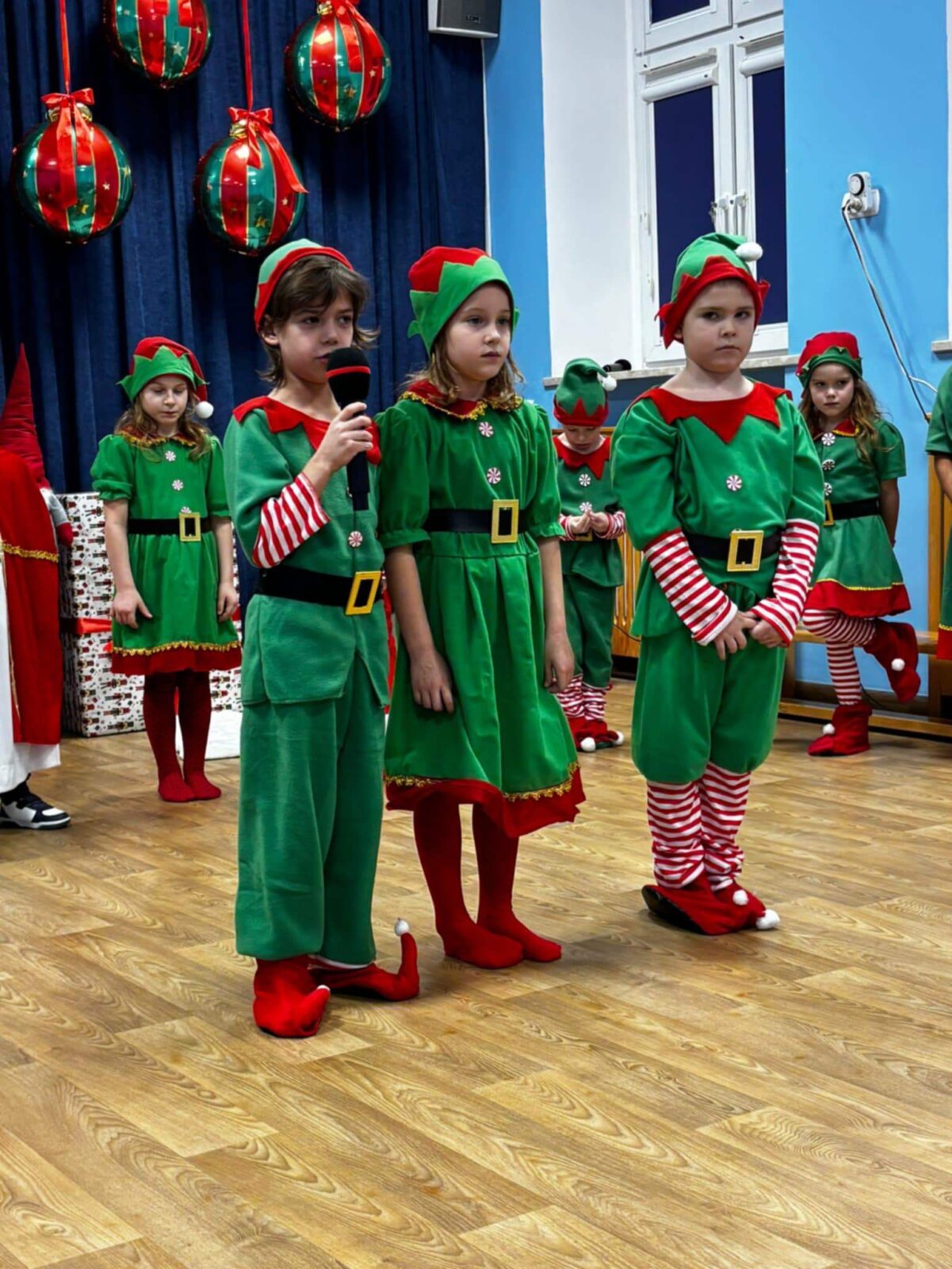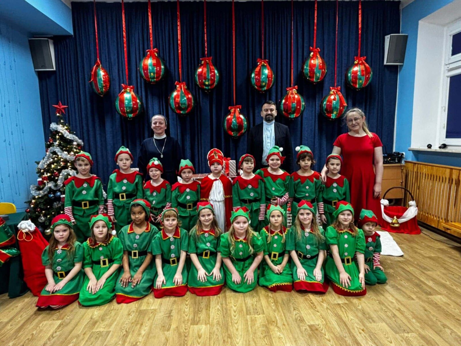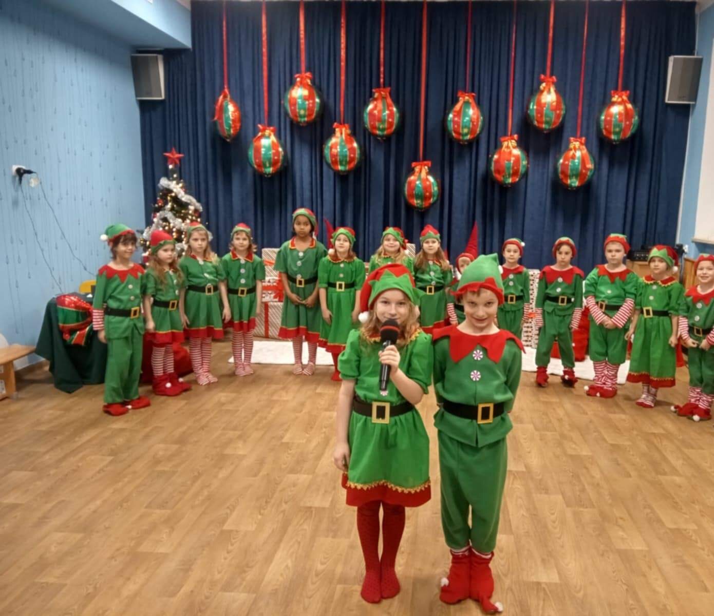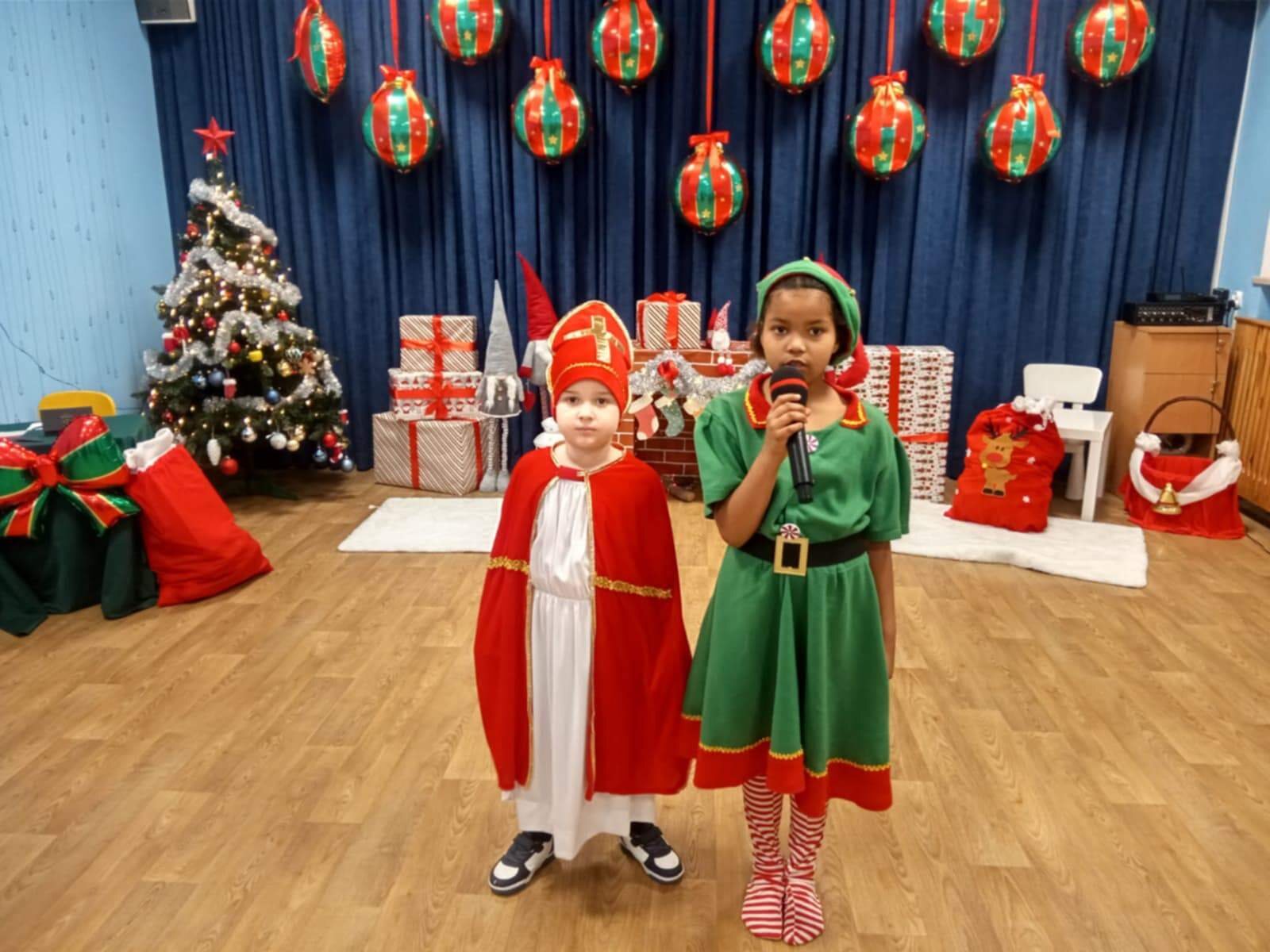 Przedstawienie rozpoczęło się od opowieści o prawdziwym św. biskupie Mikołaju, który słynął z dobroci i hojności, przypominając wszystkim o duchu świąt i pomagających aniołach – elfach, które w tym czasie zamieniły się w pomocników Mikołaja. Pomocnicy ci z wielkim zaangażowaniem pomagali przy pakowaniu prezentów dla dzieci, wprowadzając nas w świąteczną atmosferę.