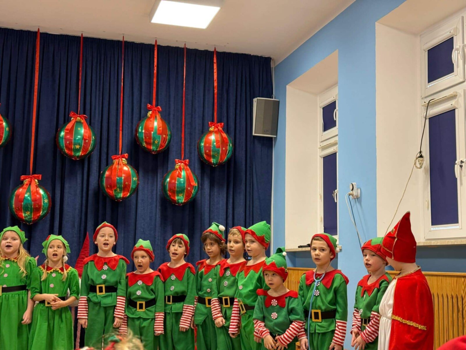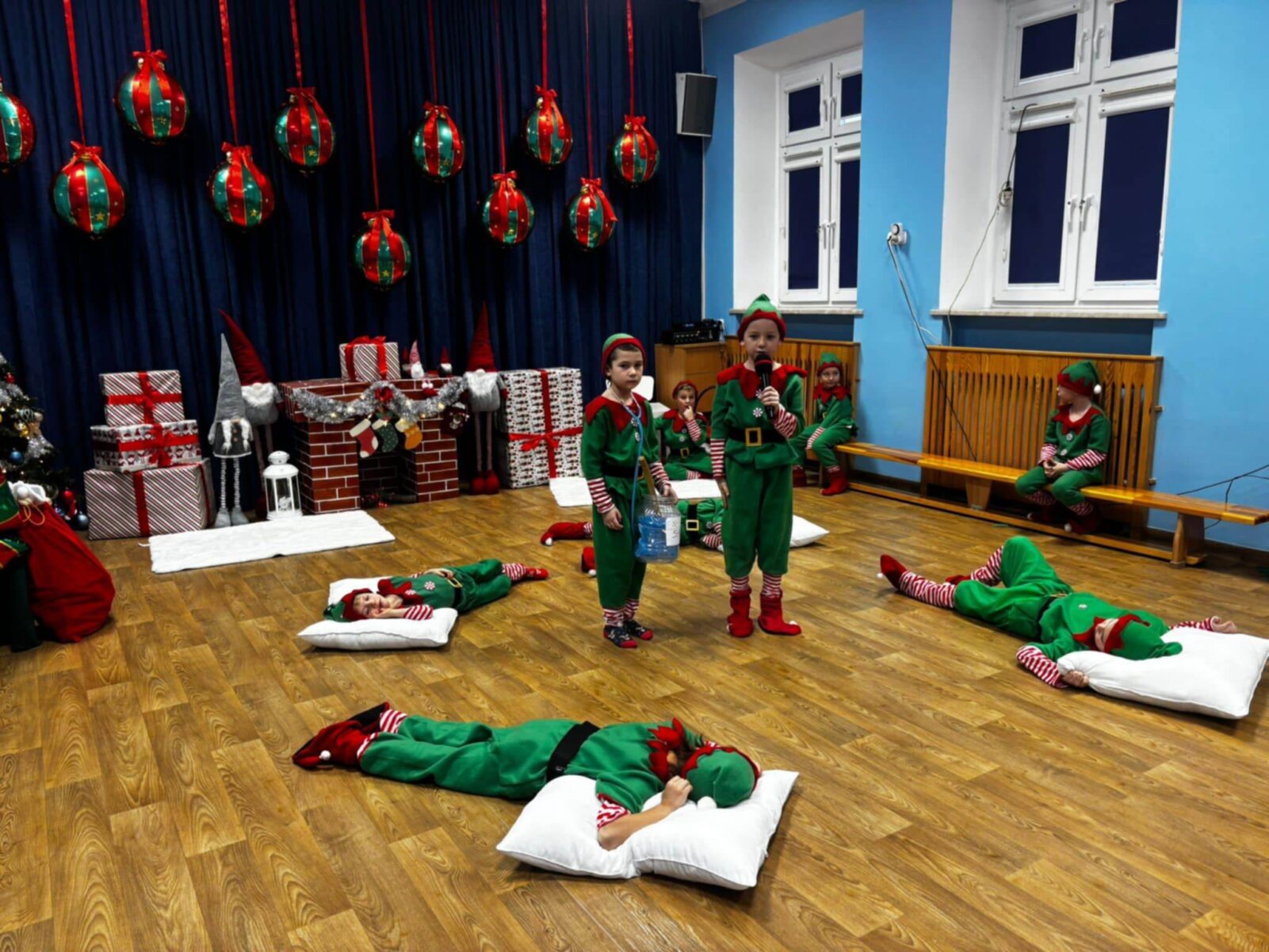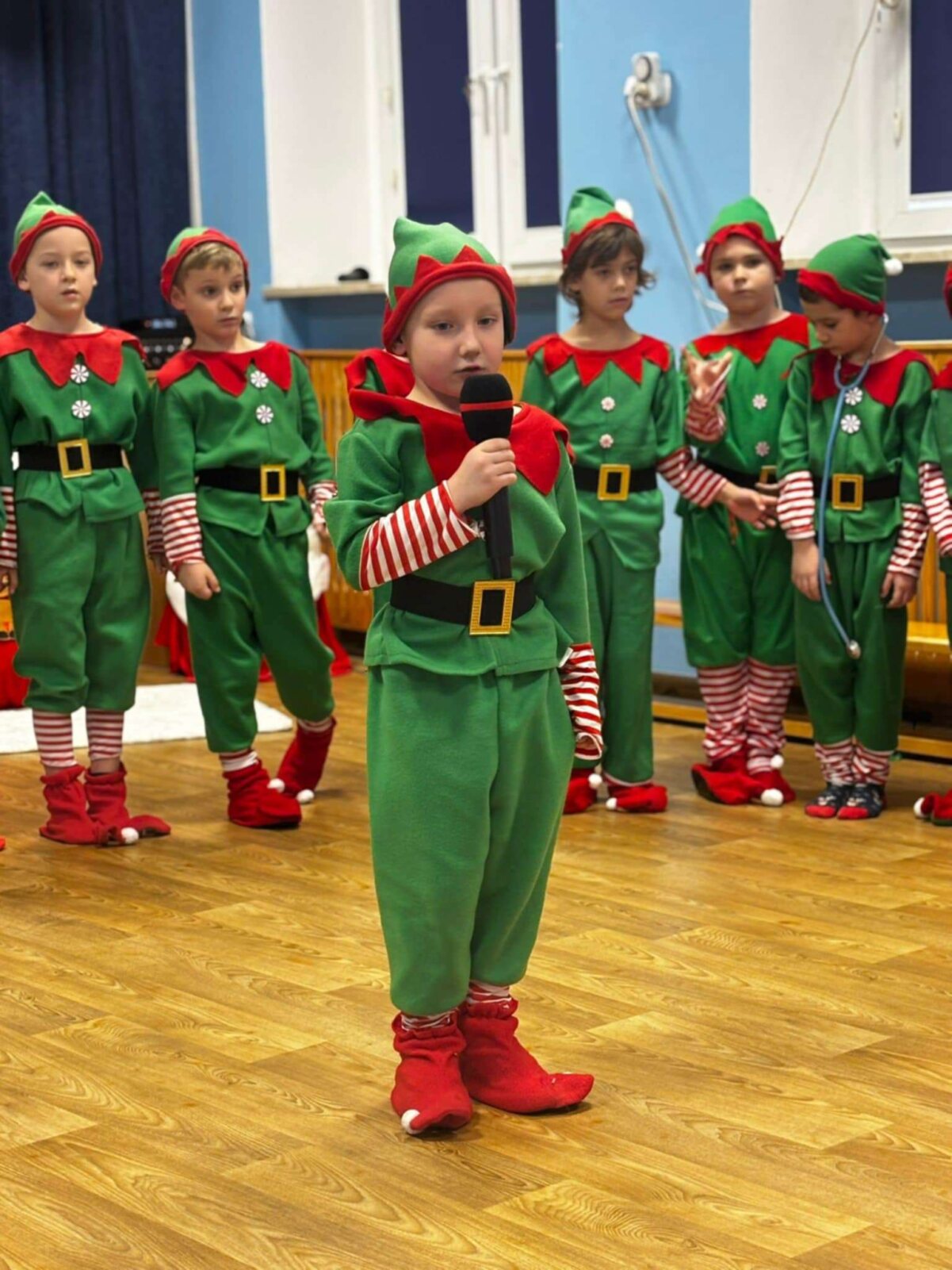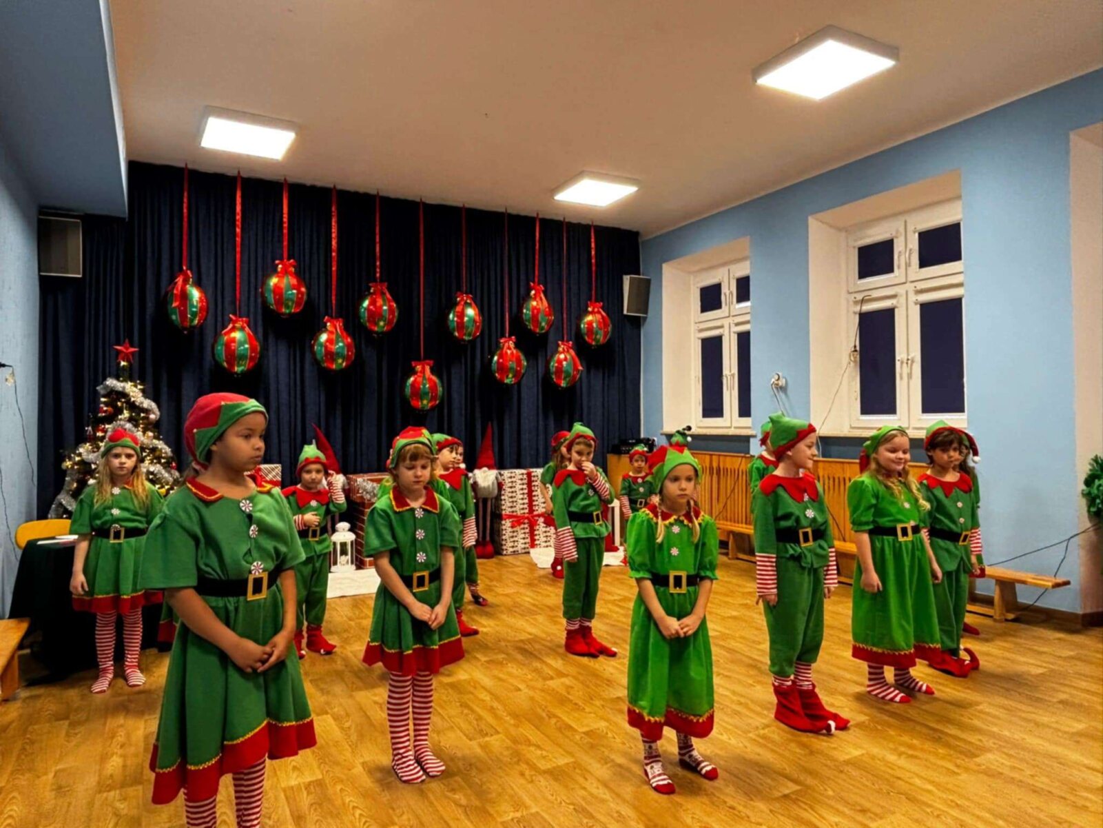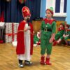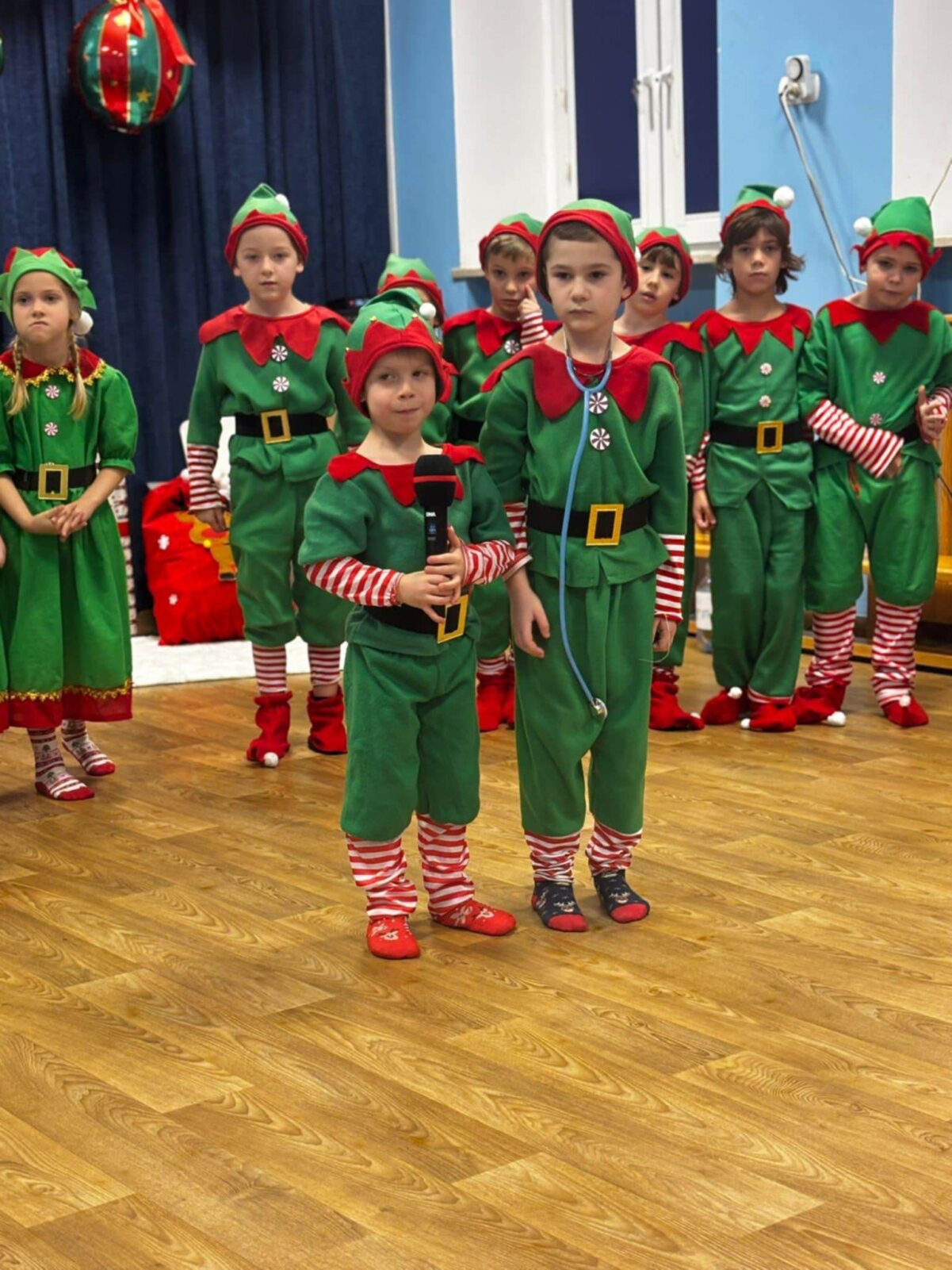 Przedstawienie rozpoczęło się od opowieści o prawdziwym św. biskupie Mikołaju, który słynął z dobroci i hojności, przypominając wszystkim o duchu świąt i pomagających aniołach – elfach, które w tym czasie zamieniły się w pomocników Mikołaja. Pomocnicy ci z wielkim zaangażowaniem pomagali przy pakowaniu prezentów dla dzieci, wprowadzając nas w świąteczną atmosferę.