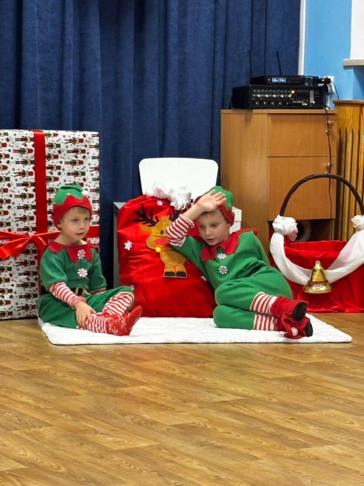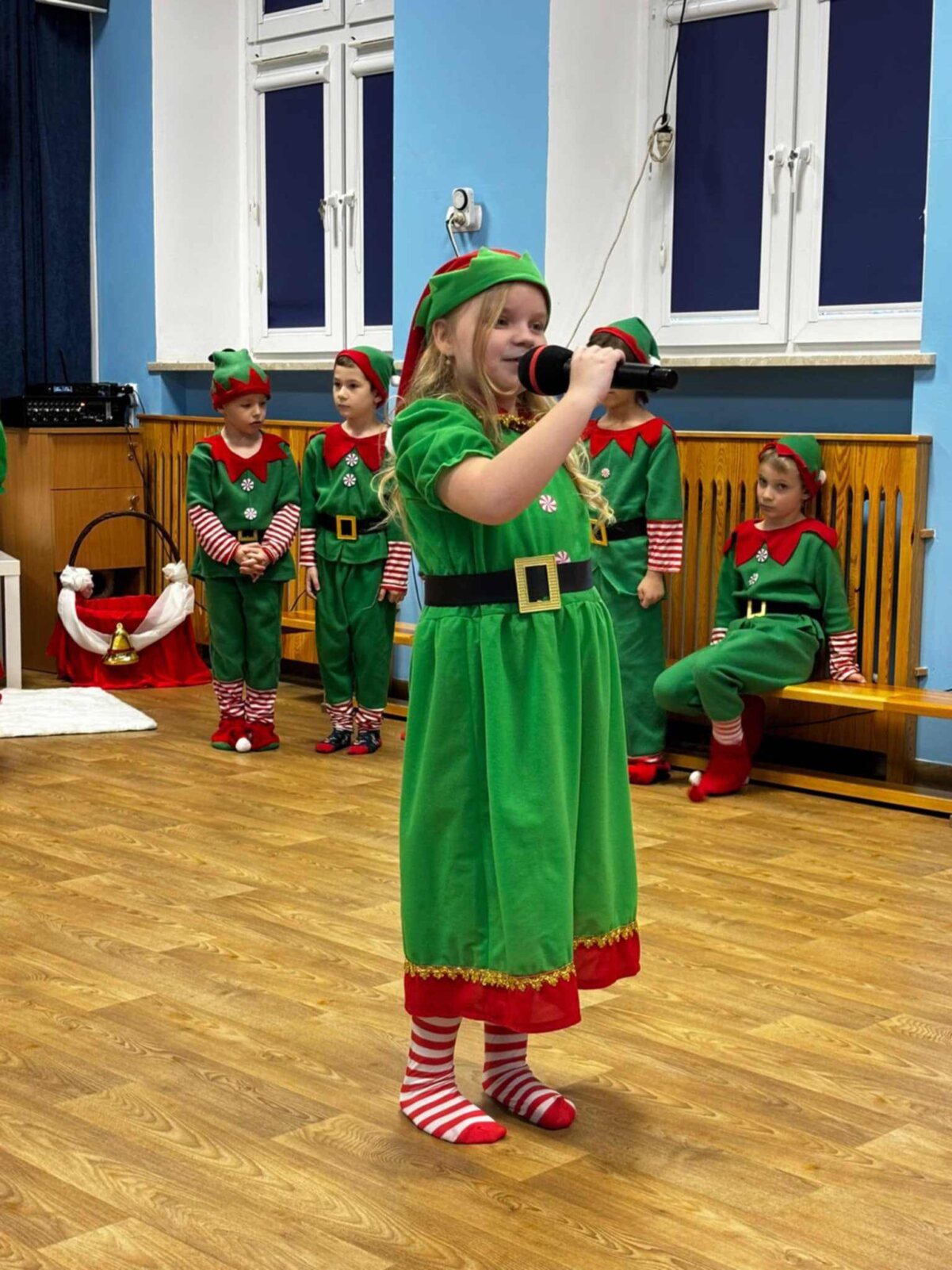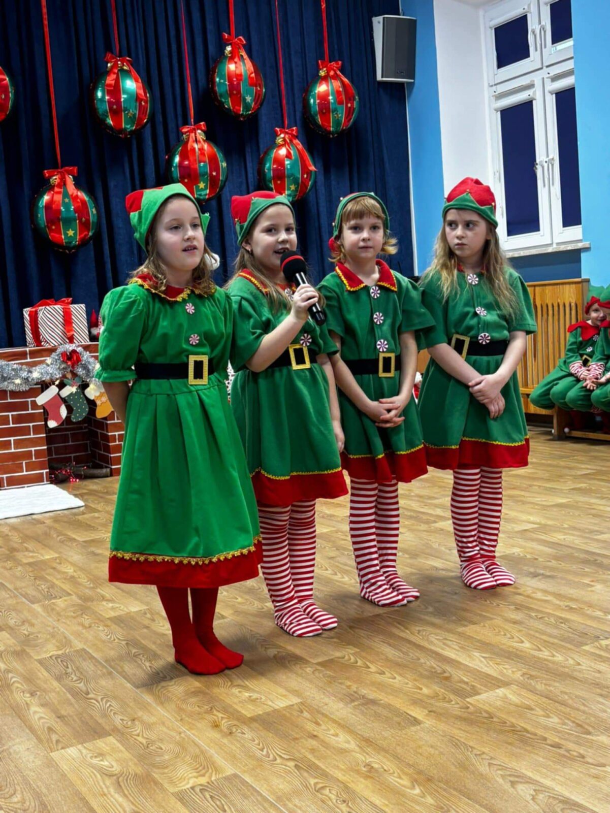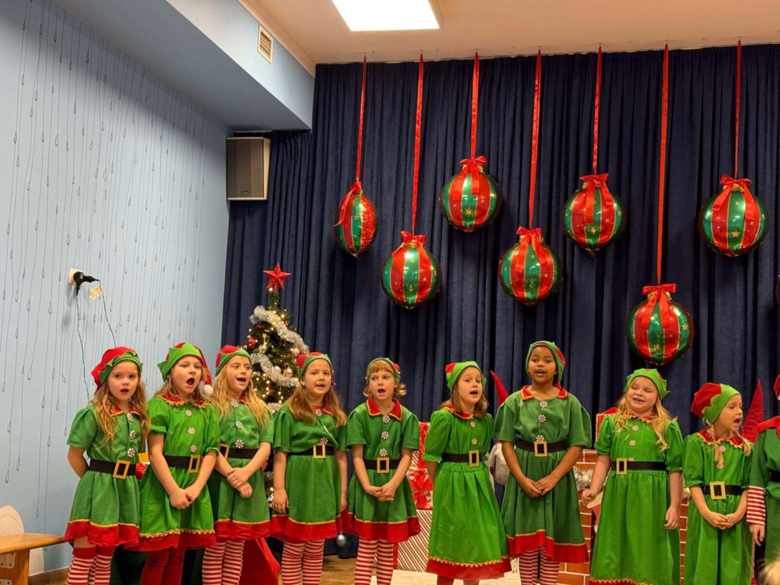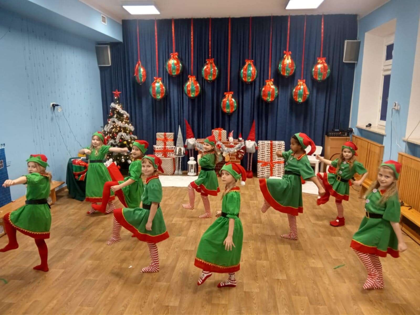 Przedstawienie rozpoczęło się od opowieści o prawdziwym św. biskupie Mikołaju, który słynął z dobroci i hojności, przypominając wszystkim o duchu świąt i pomagających aniołach – elfach, które w tym czasie zamieniły się w pomocników Mikołaja. Pomocnicy ci z wielkim zaangażowaniem pomagali przy pakowaniu prezentów dla dzieci, wprowadzając nas w świąteczną atmosferę.