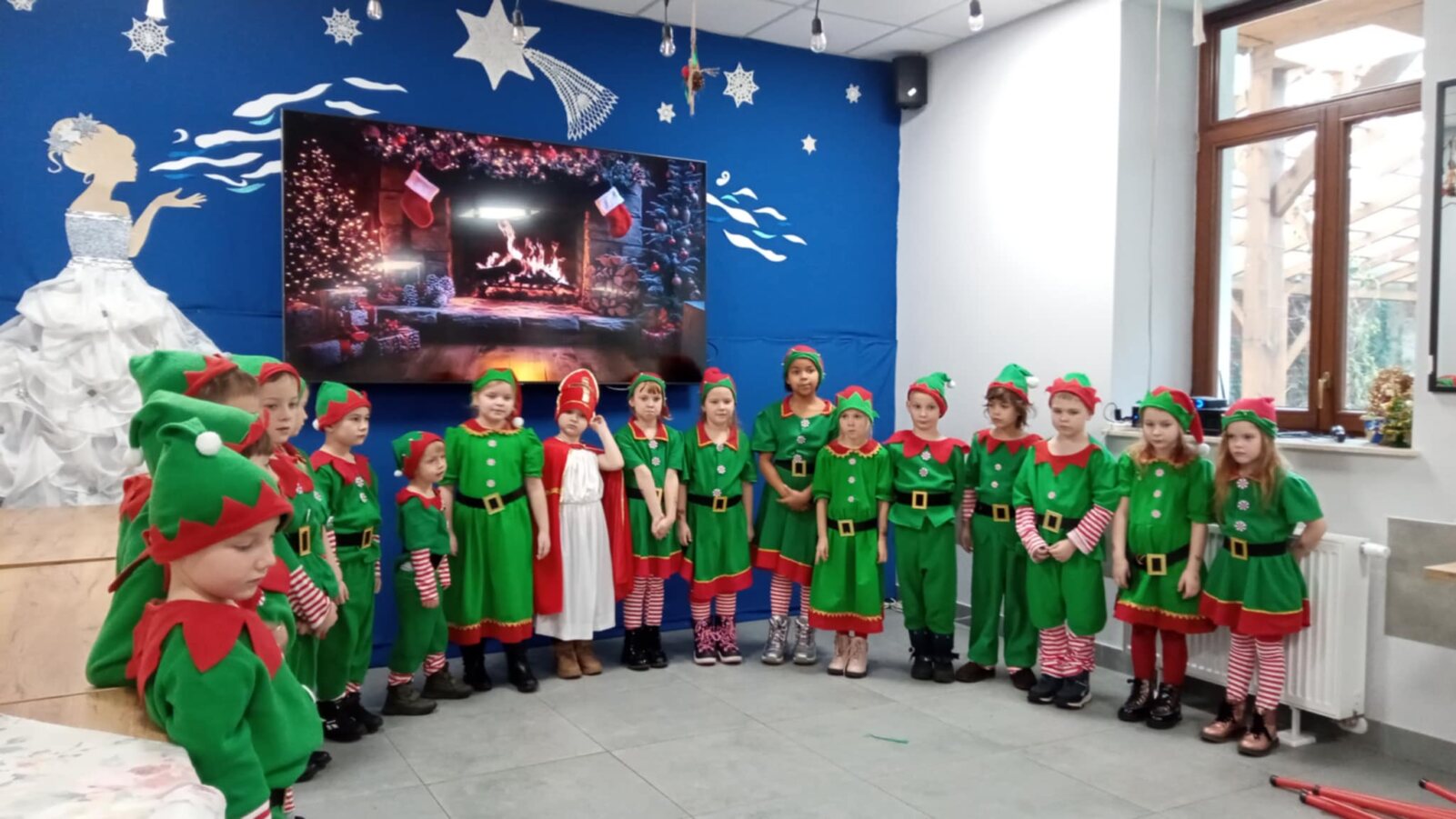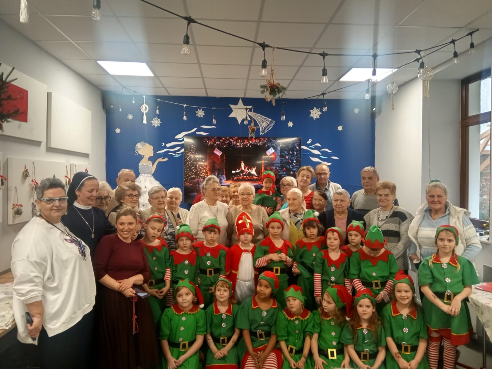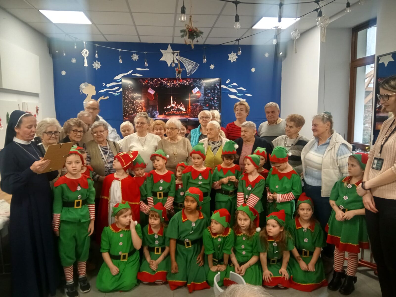 8 grudnia 2025 roku grupa 0 A „Aniołki” z Katolickiego Publicznego Przedszkola „Pod Aniołem Stróżem” odwiedziła z przedstawieniem pt. „W fabryce Świętego Mikołaja” seniorów z Centrum Wsparcia Społecznego we Włocławku. Dzieci ubrane w barwne stroje elfów śpiewały piosenki, tańczyły i recytowały wiersze, tworząc świąteczną atmosferę. Przedstawienie to miało na celu przybliżenie wszystkim zebranym postaci Świętego Mikołaja oraz wprowadzenie w wigilijny i niezastąpiony czas Świąt Bożego Narodzenia. Zarówno Mikołajki jak i Święta Bożego Narodzenia to czas prezentów i niespodzianek, ale również czas pamiętania o innych. Dzieci poprzez to wystąpienie, chciały sprawić wszystkim seniorom odrobinę radości a także podziękować za tak ważną rolę, jaką odgrywają w ich życiu. To był szczególny dzień, dzięki któremu dzieci mogły śmiać się, śpiewać i wspólnie z seniorami tworzyć miłe wspomnienia oraz niezapomniane chwile. Na koniec dzieci złożyły seniorom i pracownikom Centrum Wsparcia serdeczne życzenia świąteczne, po których na dzieci czekała świąteczna herbatka oraz pyszne słodkości.