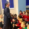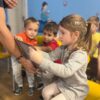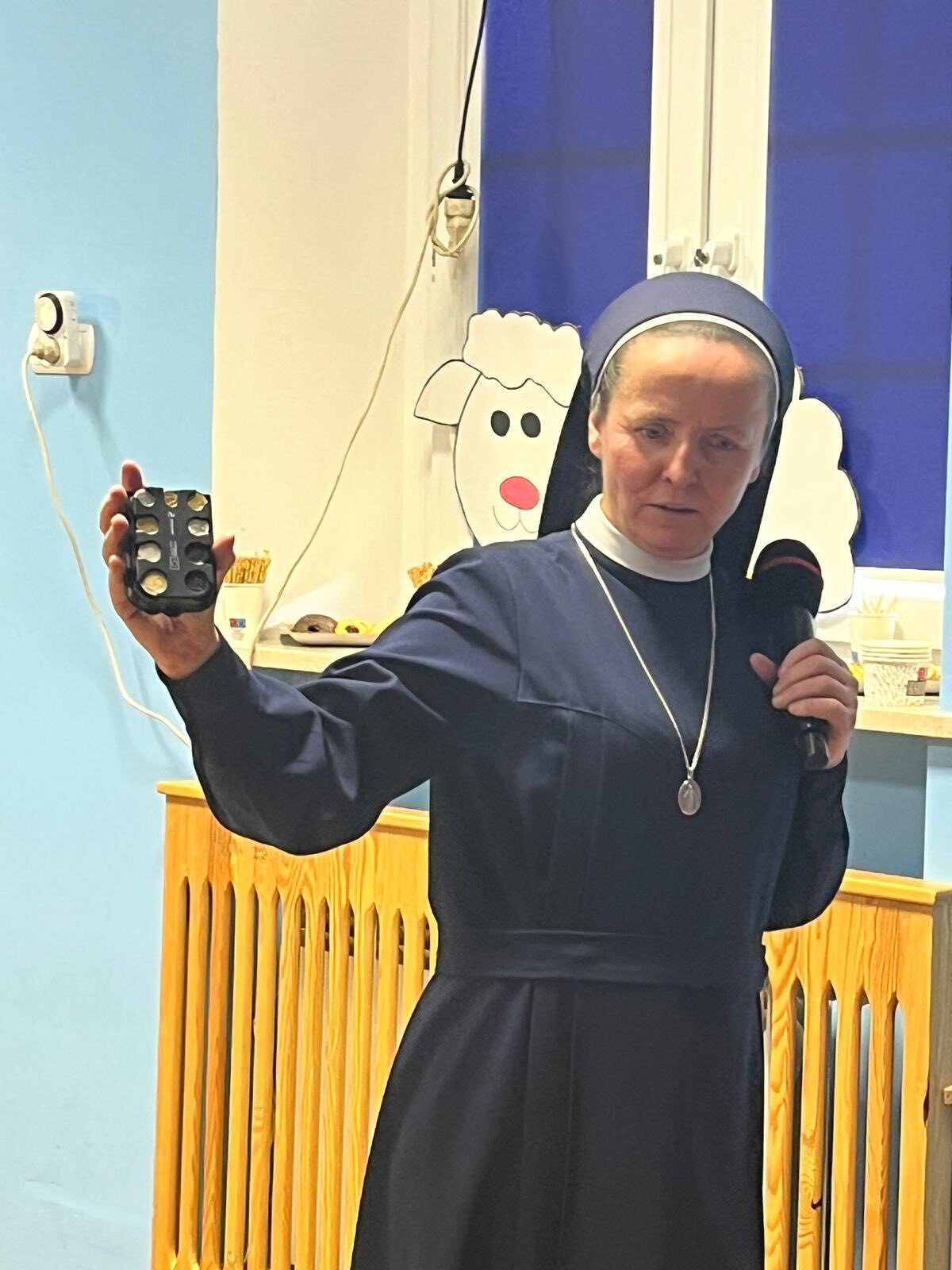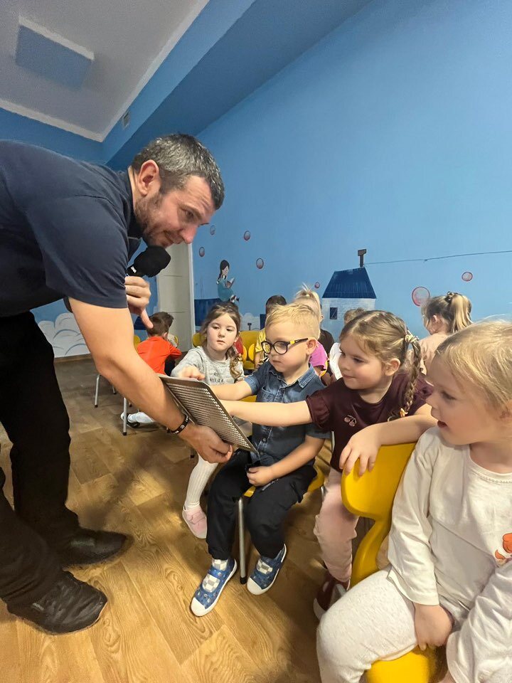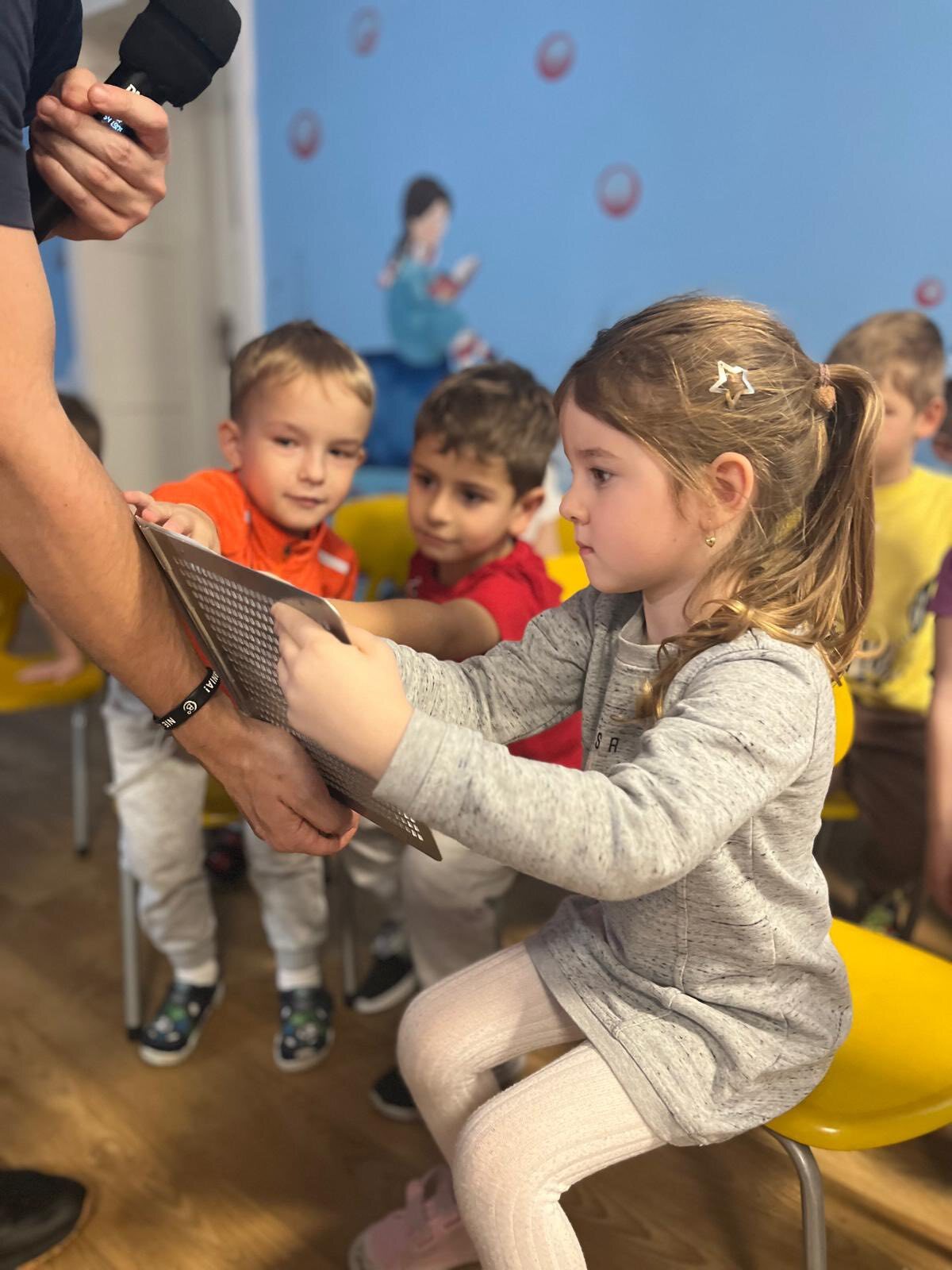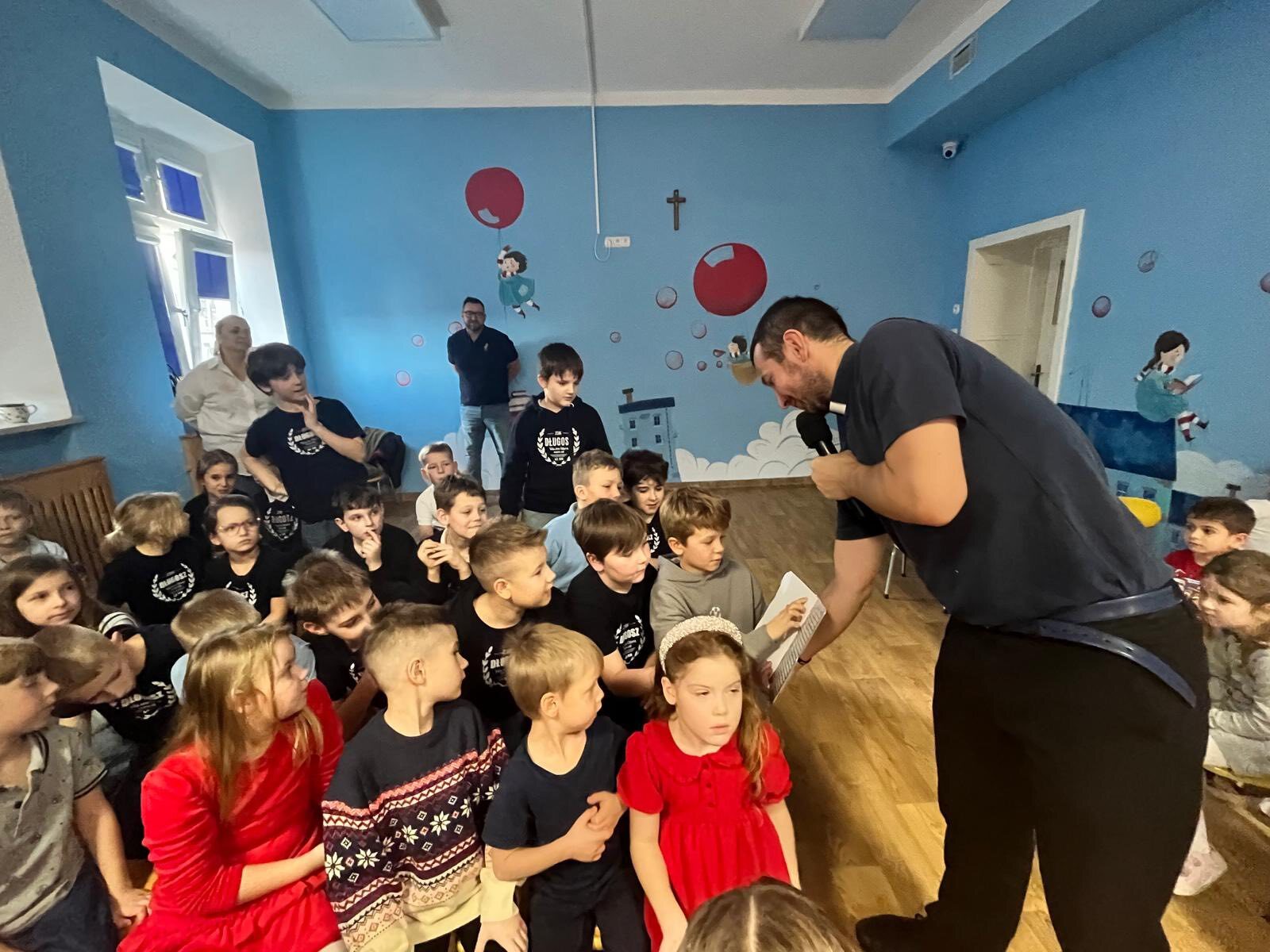 Nasz gość pracuje w firmie, która naprawia samochody, w dziale zamówień. Opowiedział dzieciom swoją historię życia i pokazał kilka technologii, którymi na co dzień się posługuje, jak np. telefon dostosowany do jego niepełnosprawności. Ponadto pan Wiesław wspominał swoje przygody na pielgrzymkach i gorąco zachęcał nasze przedszkolaki do wzięcia w nich udziału. Na koniec jego prelekcji nasz gość poczęstował wszystkie dzieci cukierkami i na pamiątkę zrobiliśmy wspólne zdjęcie. Delegacja dzieci z 3b SP, 0a oraz nasze 4-latki wręczyły panu Wiesławowi upominek.