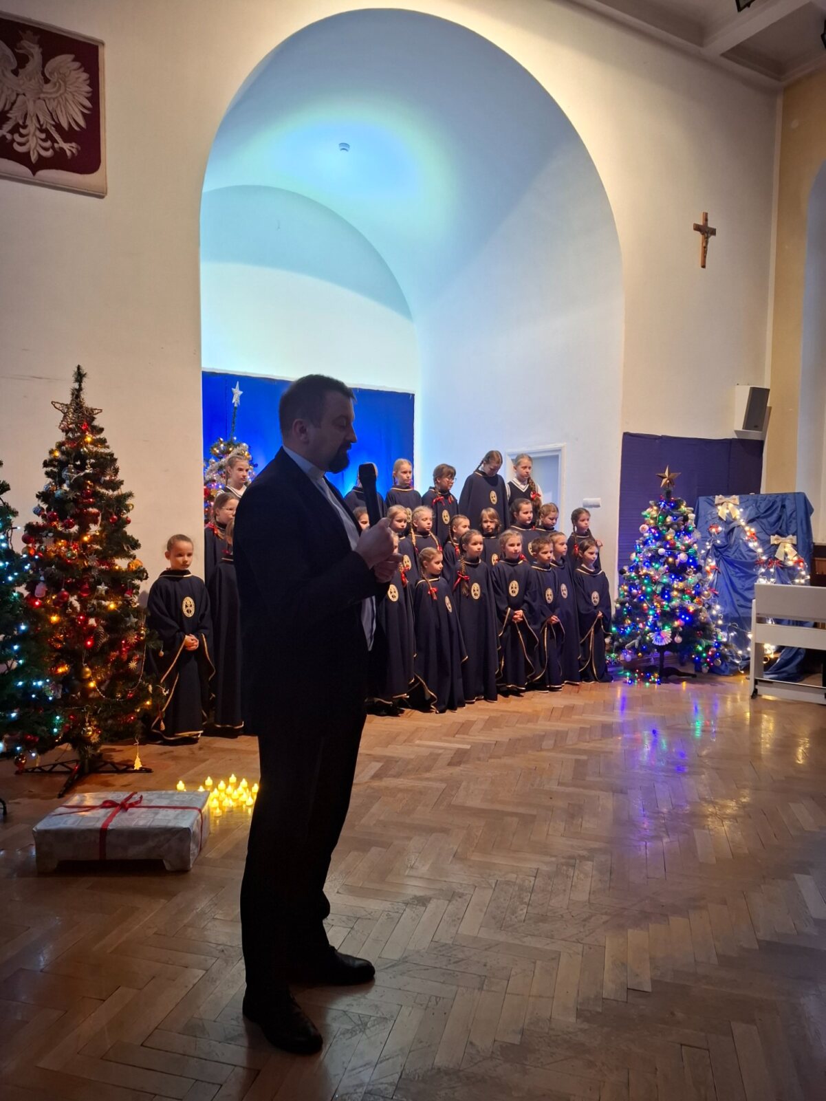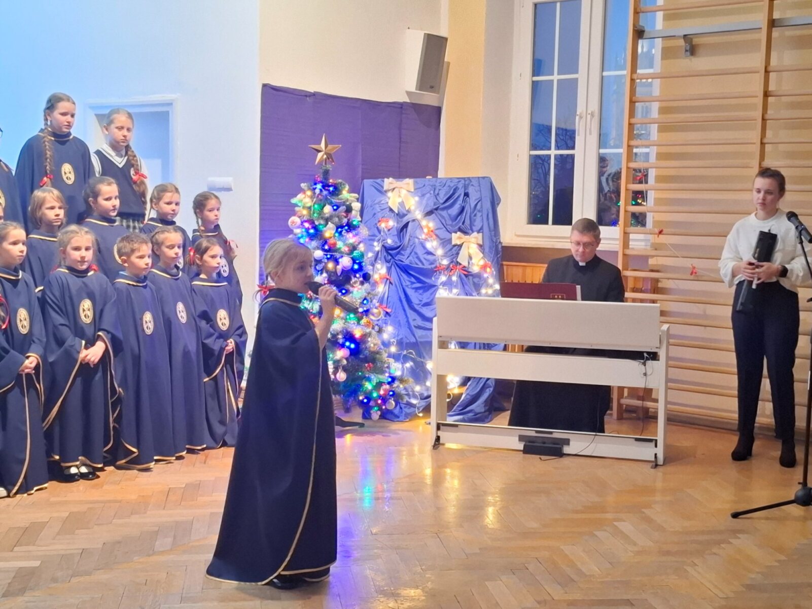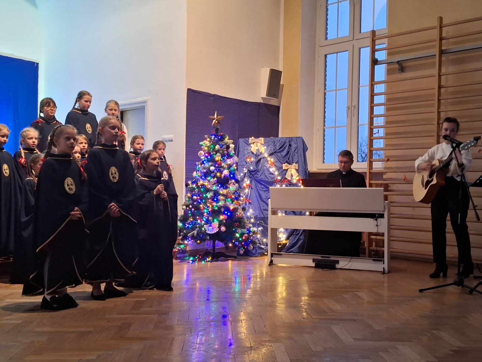 Ksiądz wicedyrektor Sebastian Tomczak przywitał zgromadzonych nauczycieli, pracowników szkoły oraz rodziców i gości, a po koncercie podziękował uczniom za piękne wykonania. Podczas koncertu śpiewom towarzyszyły instrumenty, takie jak gitara, melodyka, flet prosty i pianino, przy którym zasiadał ks. Marcin Ziółkowski, nasz licealny katecheta, a także profesor muzyki kościelnej. Wydarzenie przygotowała i poprowadziła pani Antonina Ratajczyk, opiekun chóru.