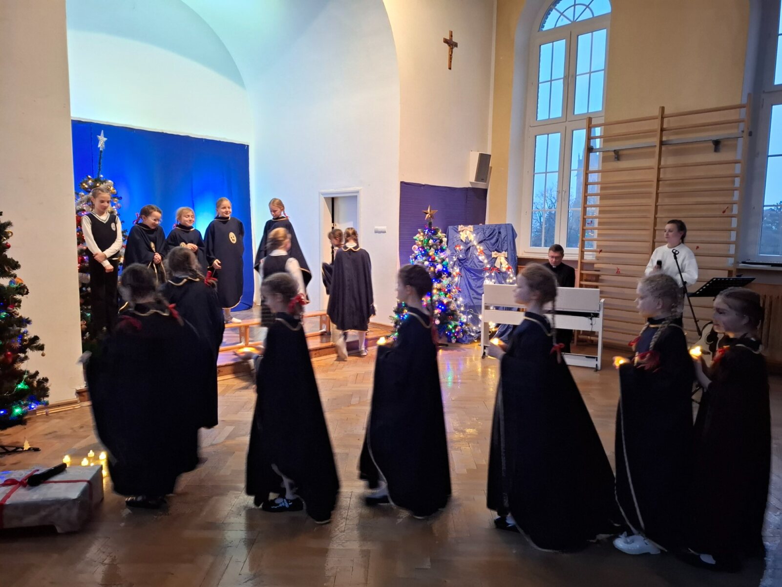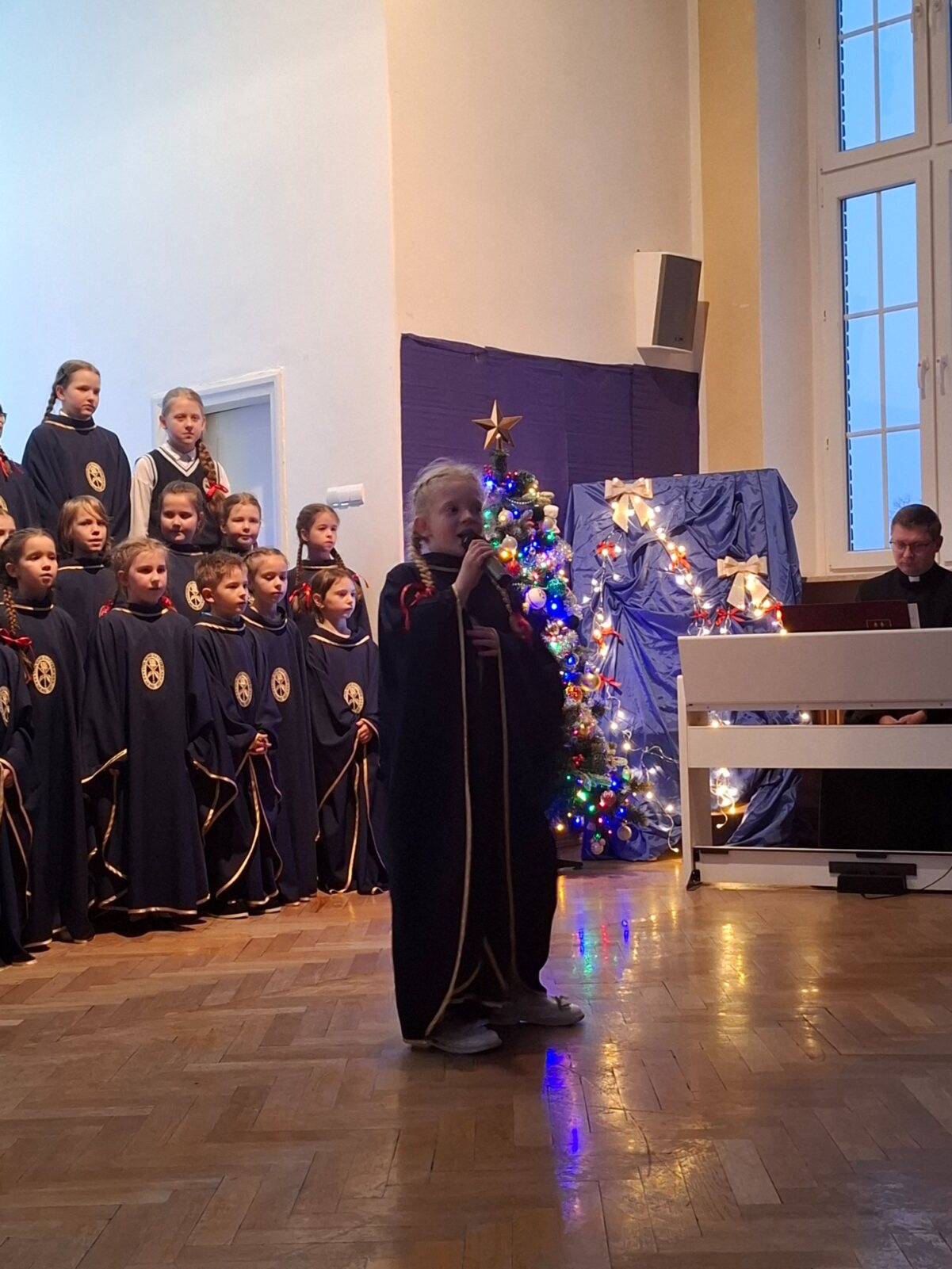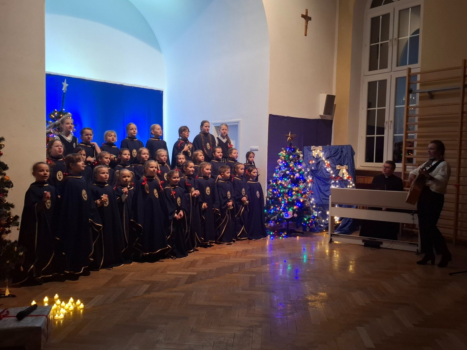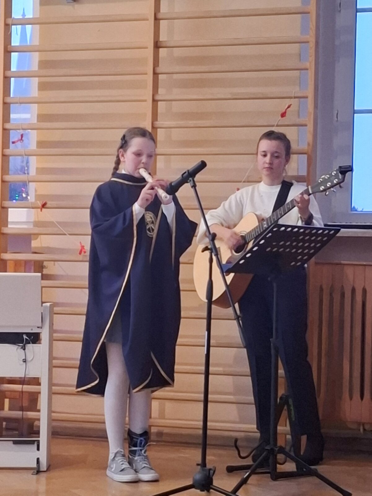 Ksiądz wicedyrektor Sebastian Tomczak przywitał zgromadzonych nauczycieli, pracowników szkoły oraz rodziców i gości, a po koncercie podziękował uczniom za piękne wykonania. Podczas koncertu śpiewom towarzyszyły instrumenty, takie jak gitara, melodyka, flet prosty i pianino, przy którym zasiadał ks. Marcin Ziółkowski, nasz licealny katecheta, a także profesor muzyki kościelnej. Wydarzenie przygotowała i poprowadziła pani Antonina Ratajczyk, opiekun chóru.