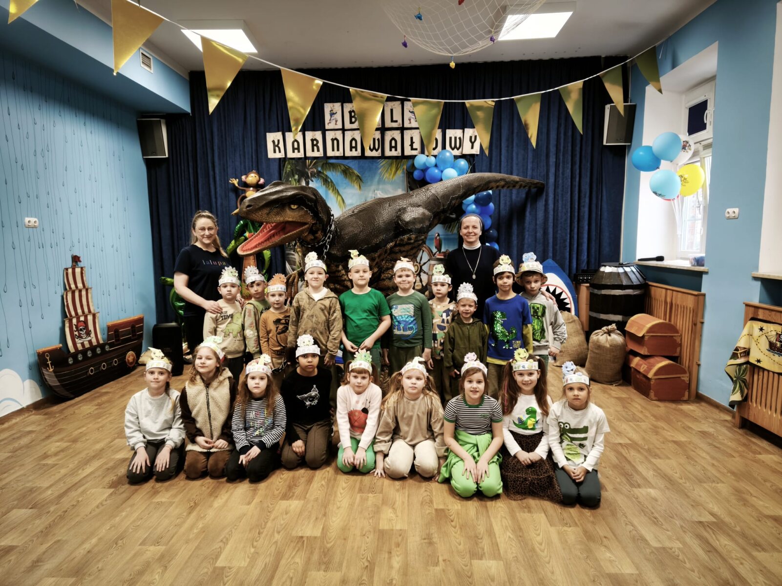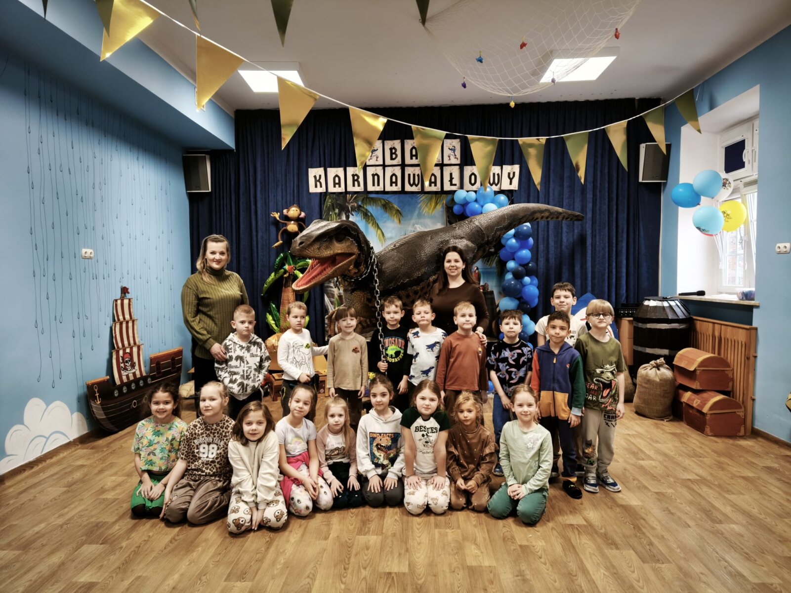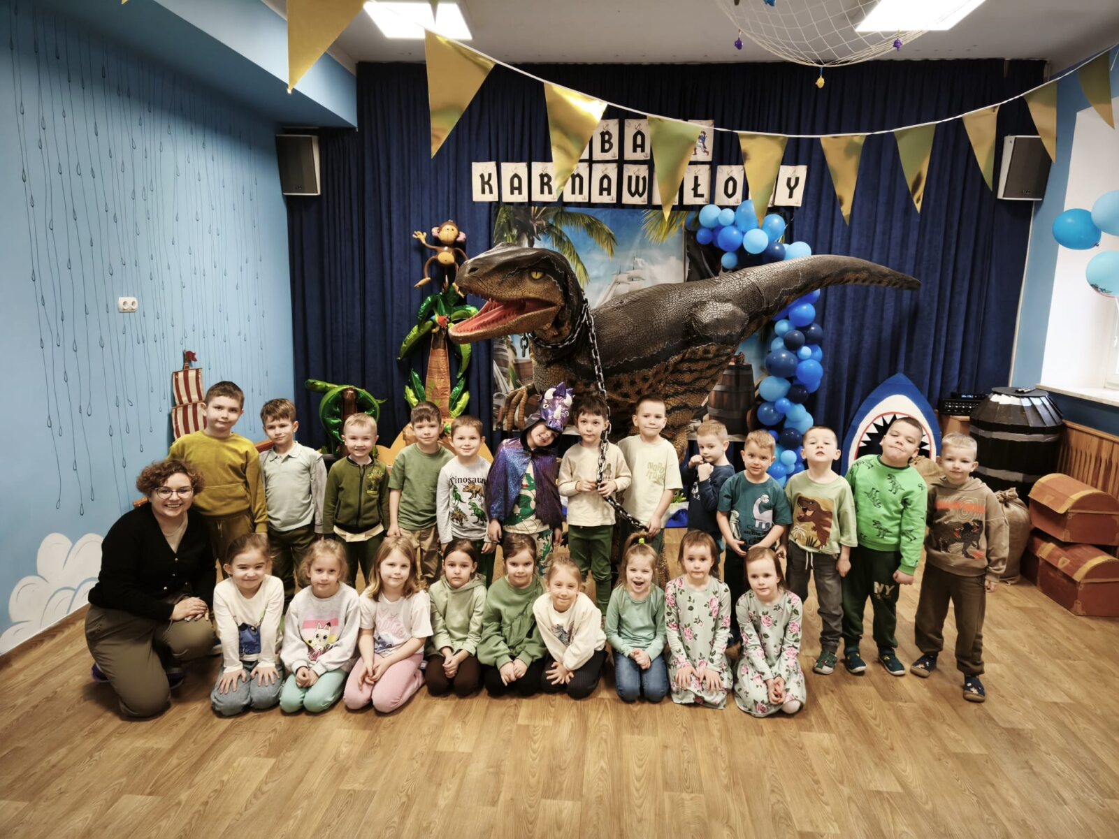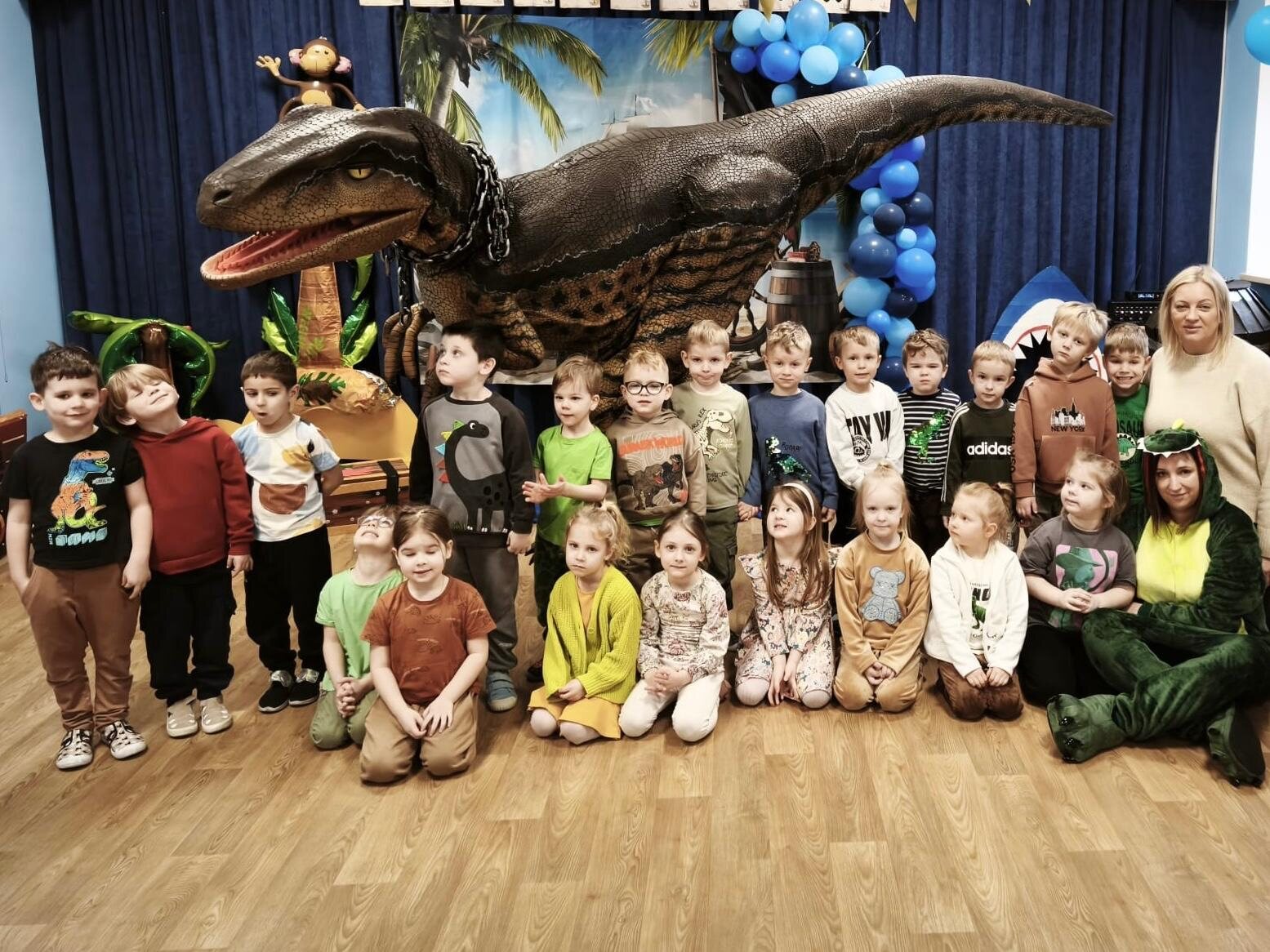 Dnia 23 lutego 2026 r. w naszym przedszkolu odbył się wyjątkowy Dzień Dinozaura. Tego dnia dzieci miały okazję przenieść się w fascynujący świat prehistorycznych gadów. Największą atrakcją wydarzenia była wizyta interaktywnego dinozaura – Velociraptora Stefana. Dinozaur tańczył z dziećmi, poruszał się po sali, a także pozwolił się pogłaskać, co wywołało wiele radości i uśmiechów na twarzach przedszkolaków.
