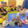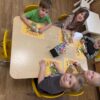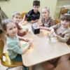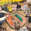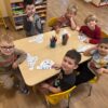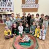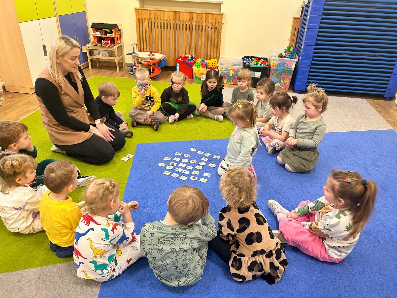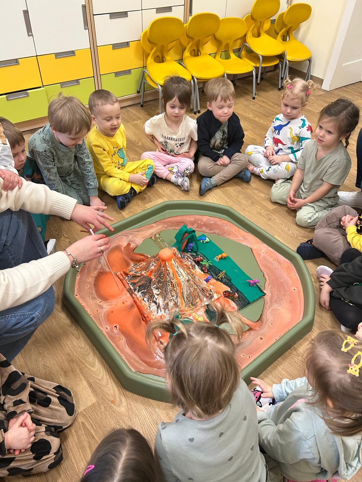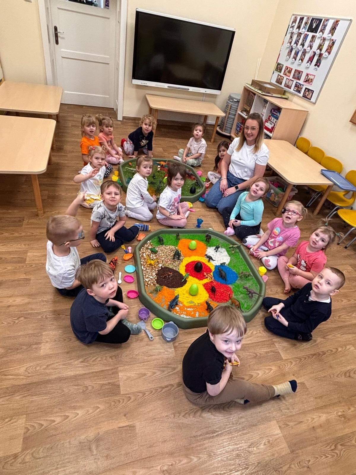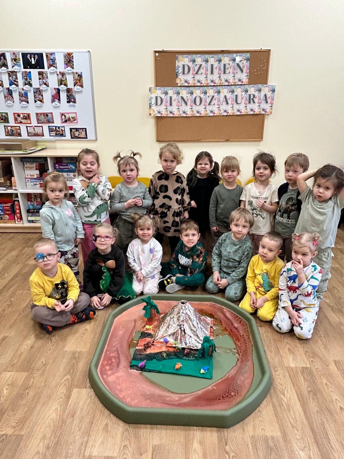 W najmłodszej grupie trzylatków zorganizowano zajęcia tematyczne związane z dinozaurami. Dzieci uczestniczyły w eksperymencie „wybuch wulkanu”, który wzbudził ogromne zainteresowanie. Odbyły się również zajęcia sensoryczne – przedszkolaki poszukiwały małych dinozaurów ukrytych w kolorowych galaretkach, ćwicząc przy tym zmysł dotyku i koncentrację.