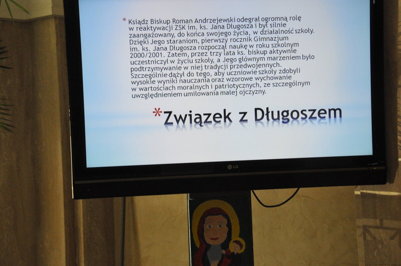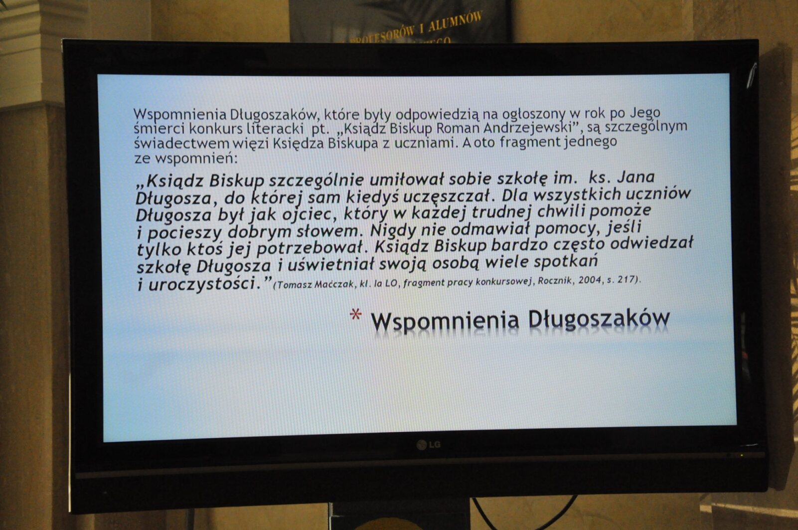 Ksiądz biskup Roman Andrzejewski odegrał ogromną rolę w reaktywacji Zespołu Szkół Katolickich im. ks. Jana Długosza i do końca życia pozostawał silnie zaangażowany w działalność szkoły. Dzięki jego staraniom pierwszy rocznik Gimnazjum im. ks. Jana Długosza rozpoczął naukę w roku szkolnym 2000/2001. Przez trzy lata biskup aktywnie uczestniczył w życiu szkoły, a jego głównym celem było podtrzymywanie jej przedwojennych tradycji. Szczególnie dążył do zapewnienia uczniom wysokiego poziomu nauczania oraz wychowania opartego na wartościach moralnych i patriotycznych, ze szczególnym uwzględnieniem umiłowania małej ojczyzny. W tym roku mija 25-lecie reaktywacji „Długosza”. Niech ta wystawa będzie hołdem dla człowieka, który pozostawił trwały ślad w historii naszej szkoły, a jego życie i dokonania niech będą inspiracją do podejmowania własnych działań z odwagą, pasją i odpowiedzialnością.