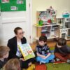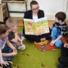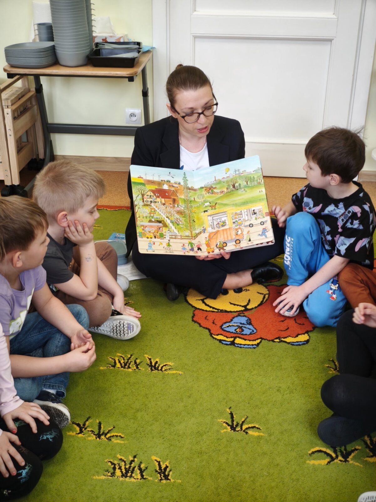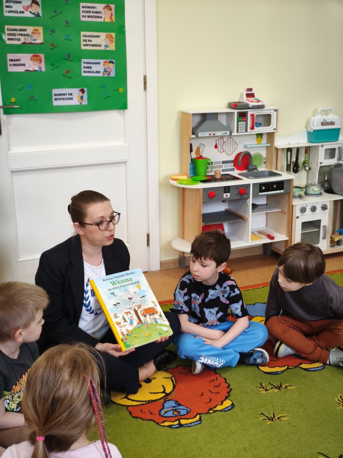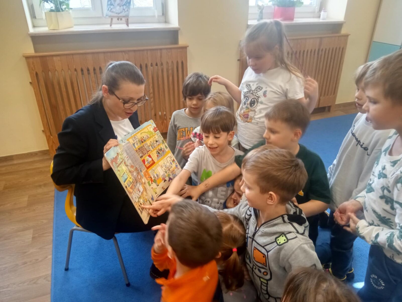Następnie przedszkolaki miały okazję zapoznać się z książką obrazkową „Wiosna na ulicy Czereśniowej”. Choć nie była to tradycyjna lektura, forma wyszukiwanki zachęciła uczestników do uważnej obserwacji i opowiadania o przygodach bohaterów książki.