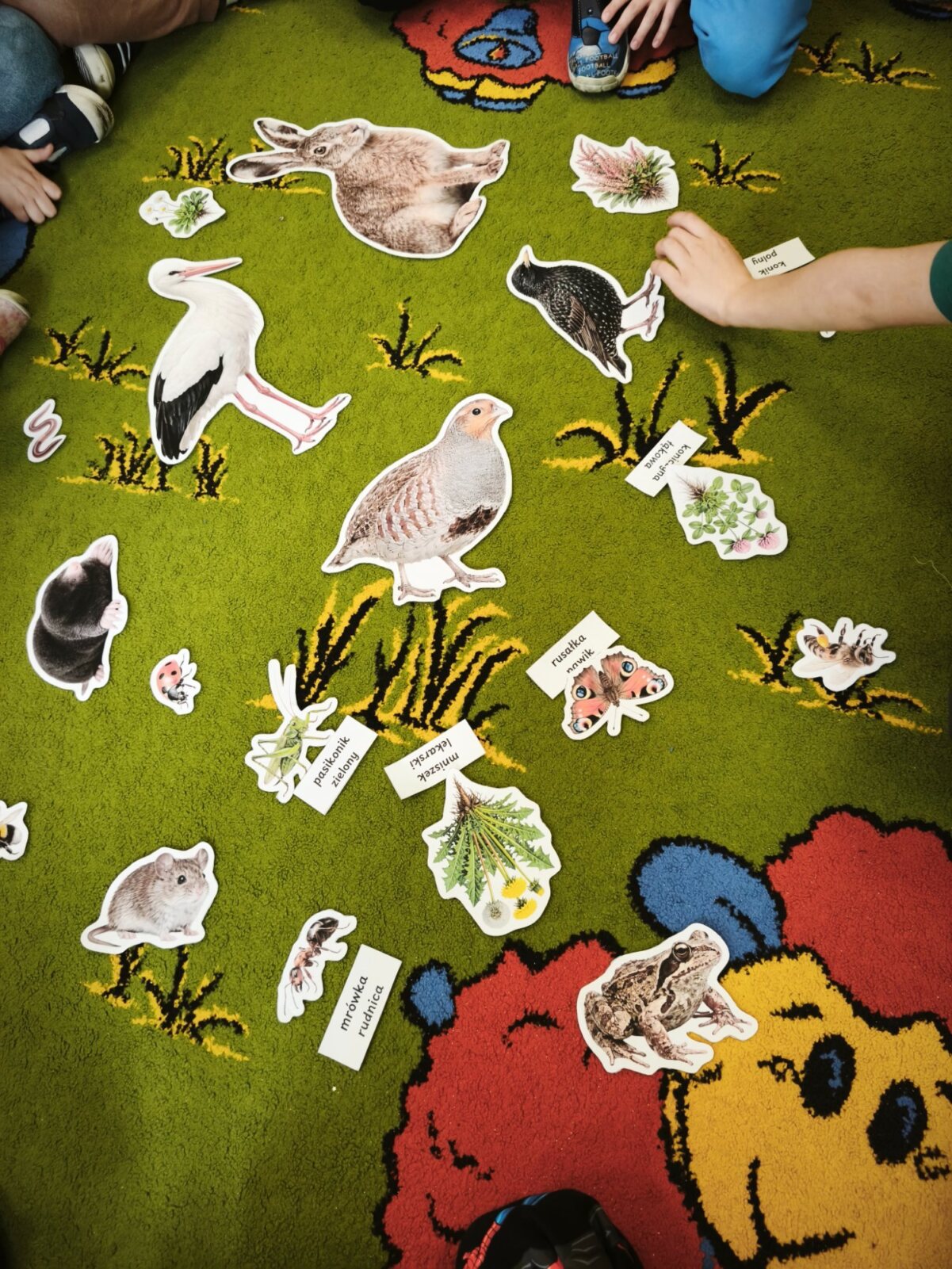 Kolejną część zajęć stanowiły działania z wykorzystaniem plansz prezentujących wiosenną przyrodę. Dzieci aktywnie uczestniczyły w przyporządkowaniu nazw do odpowiednich ilustracji utrwalając przy tym zdobytą wiedzę i rozwijając spostrzegawczość.