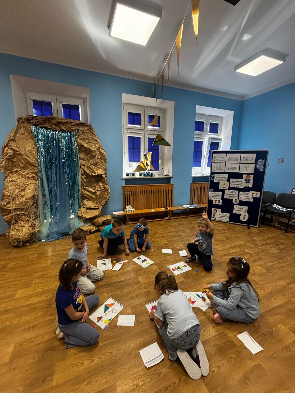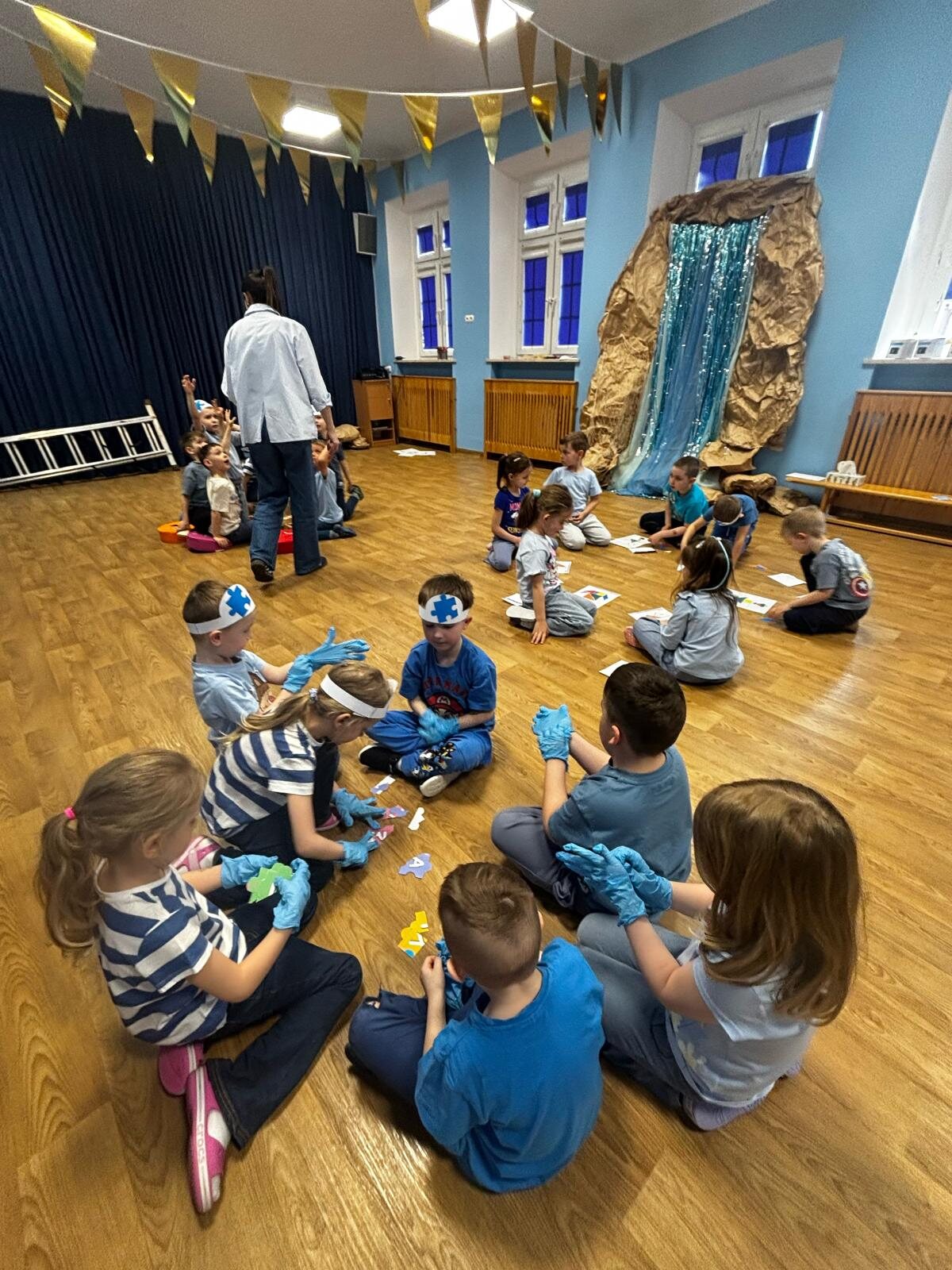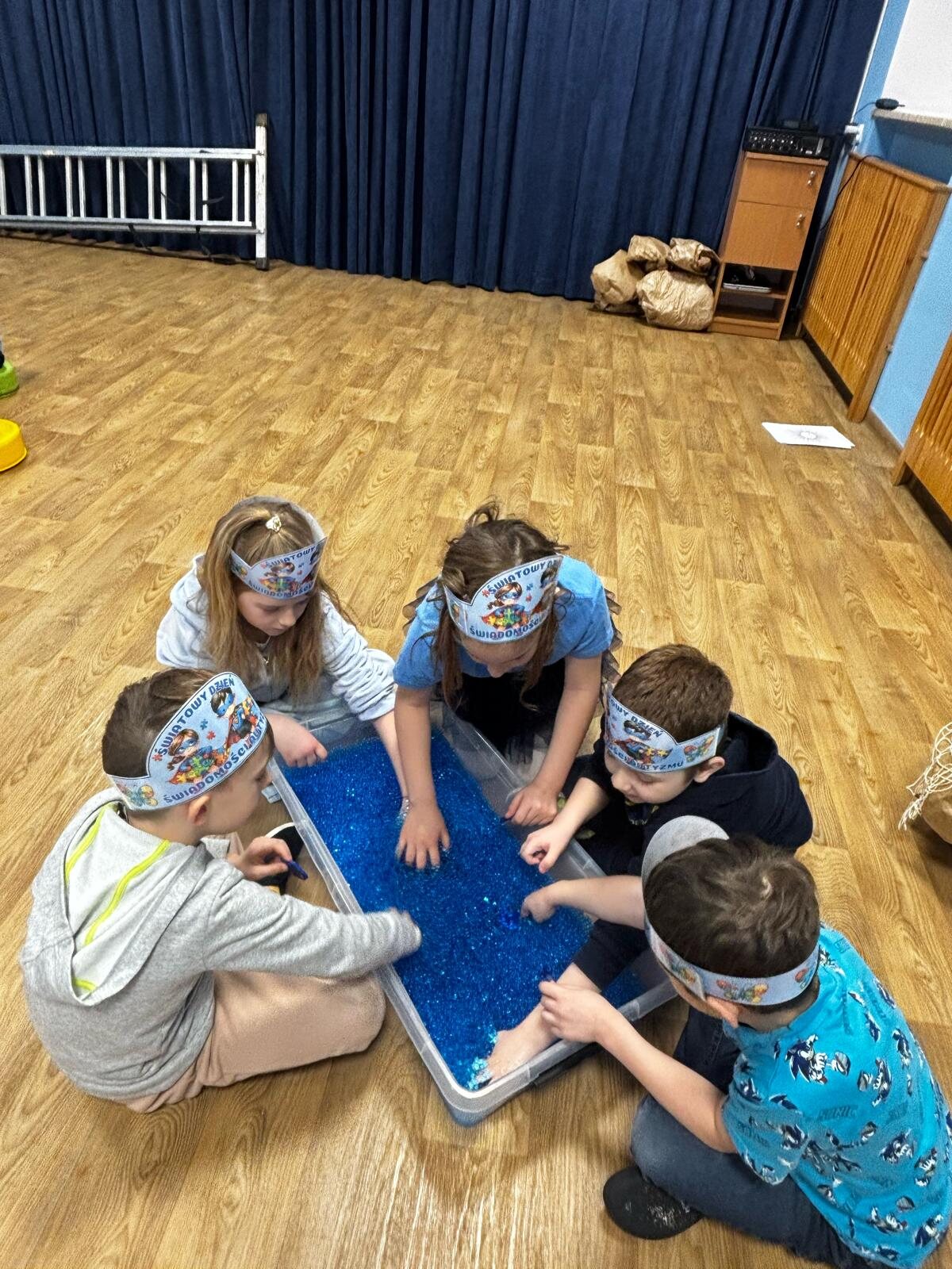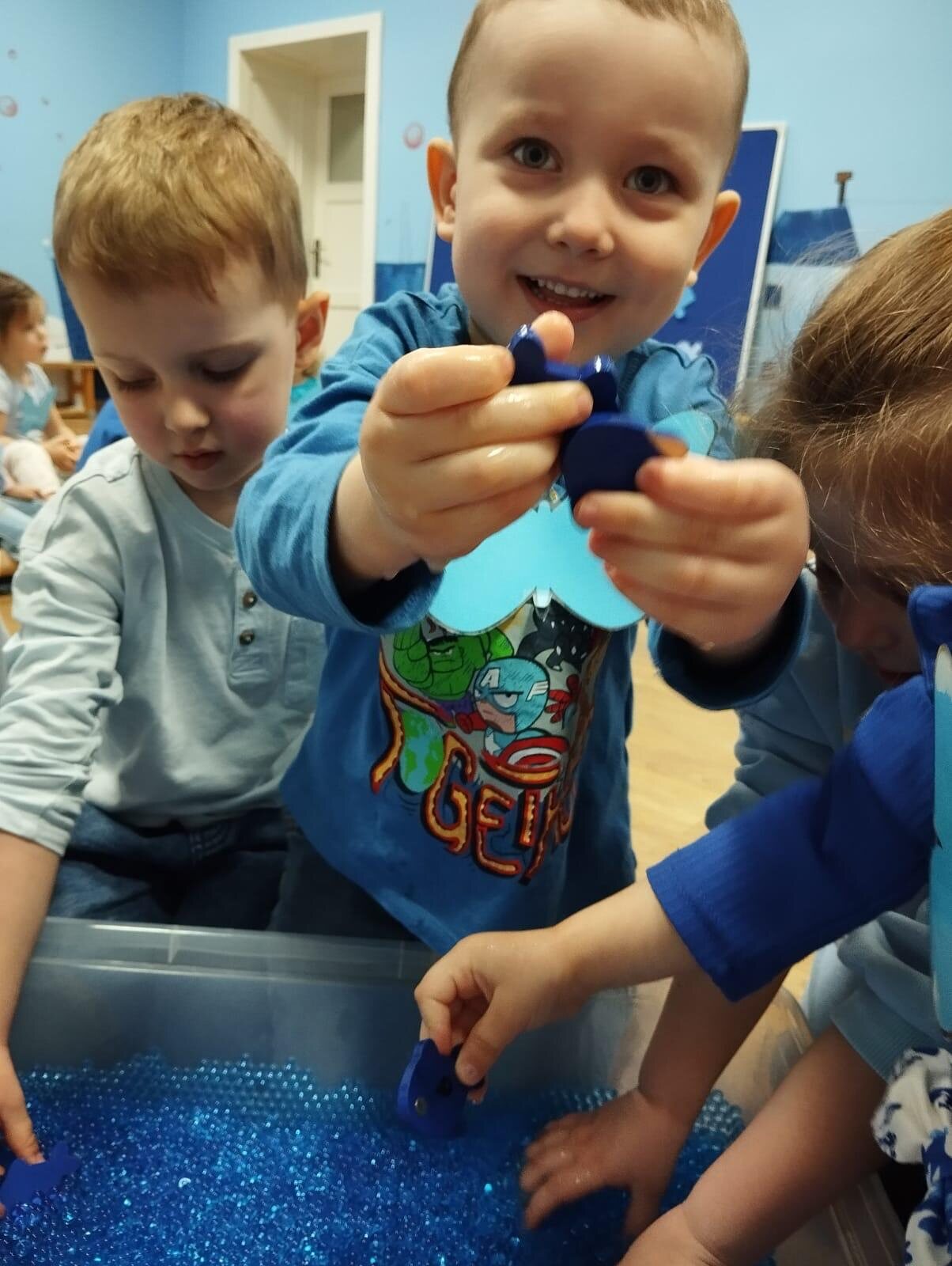 - Strefa sensoryczna: w ramach ćwiczeń dotykowych wyszukiwały ukryte w hydrożelowych kulkach rybki oraz mierzyły się z układankami.