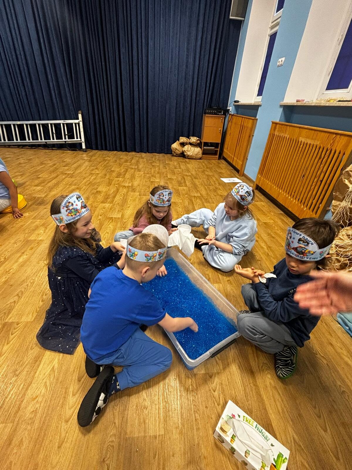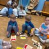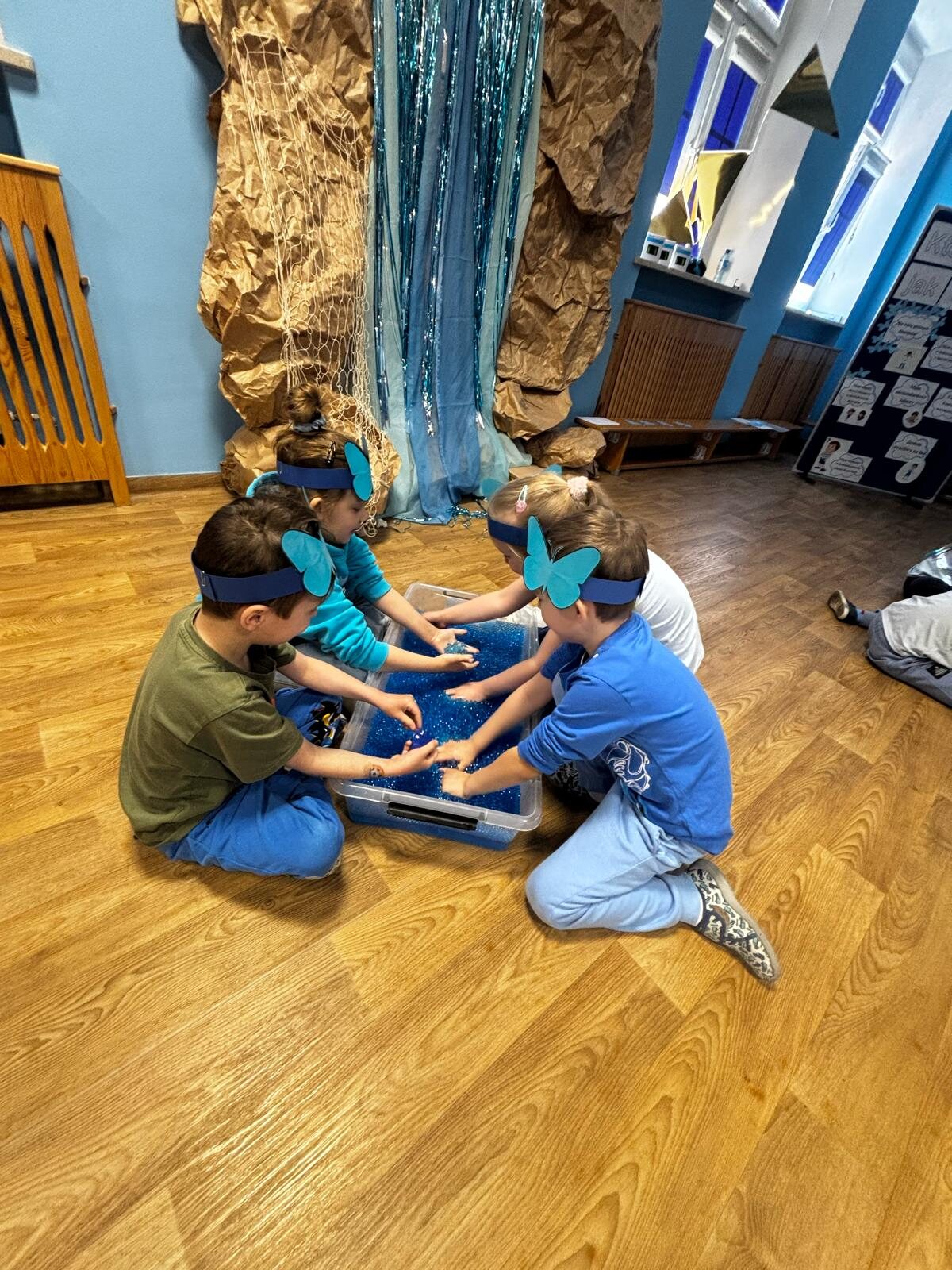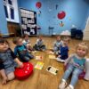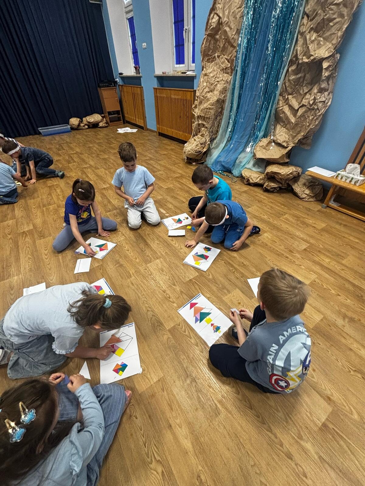 - Strefa sensoryczna: w ramach ćwiczeń dotykowych wyszukiwały ukryte w hydrożelowych kulkach rybki oraz mierzyły się z układankami.